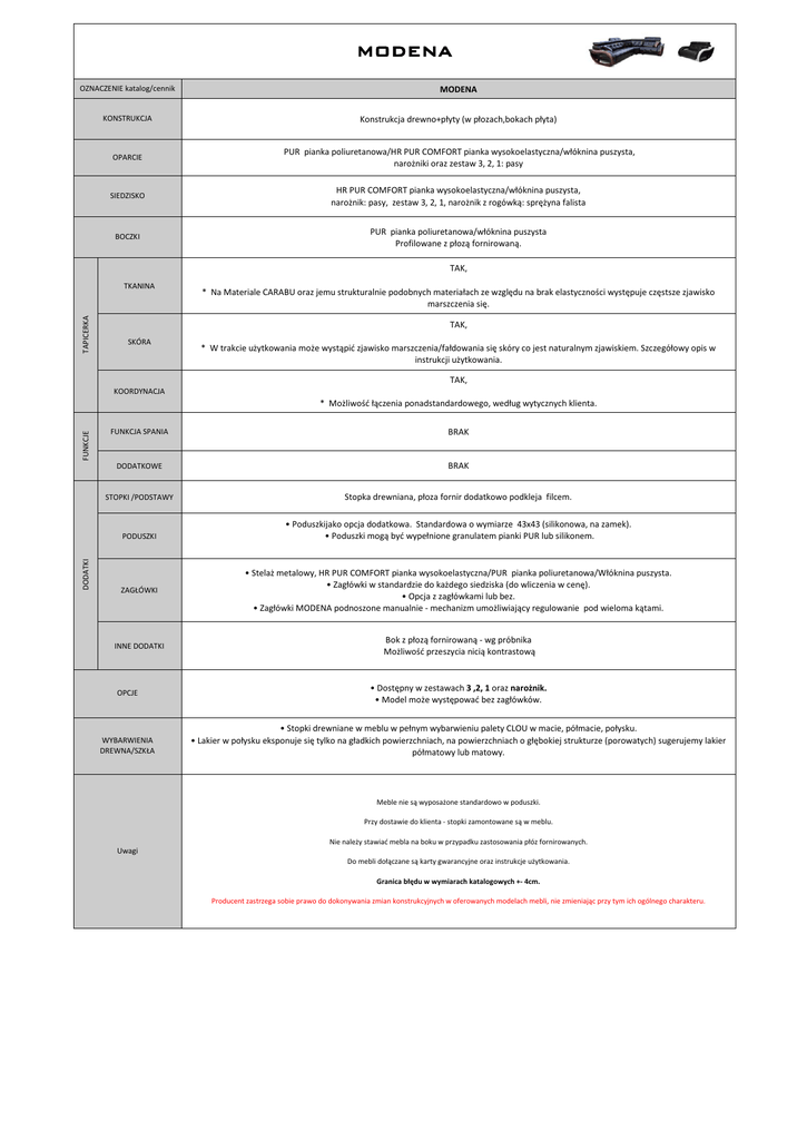 MODENA OZNACZENIE katalog/cennik MODENA KONSTRUKCJA Konstrukcja drewno+płyty (w płozach,bokach płyta) OPARCIE PUR pianka poliuretanowa/HR PUR COMFORT pianka wysokoelastyczna/włóknina puszysta, narożniki oraz zestaw 3, 2, 1: pasy SIEDZISKO HR PUR COMFORT pianka wysokoelastyczna/włóknina puszysta, narożnik: pasy, zestaw 3, 2, 1, narożnik z rogówką: sprężyna falista BOCZKI PUR pianka poliuretanowa/włóknina puszysta Profilowane z płozą fornirowaną. TAK, TAPICERKA TKANINA * Na Materiale CARABU oraz jemu strukturalnie podobnych materiałach ze względu na brak elastyczności występuje częstsze zjawisko marszczenia się. TAK, SKÓRA * W trakcie użytkowania może wystąpić zjawisko marszczenia/fałdowania się skóry co jest naturalnym zjawiskiem. Szczegółowy opis w instrukcji użytkowania. TAK, KOORDYNACJA DODATKI FUNKCJE * Możliwość łączenia ponadstandardowego, według wytycznych klienta. FUNKCJA SPANIA BRAK DODATKOWE BRAK STOPKI /PODSTAWY Stopka drewniana, płoza fornir dodatkowo podkleja filcem. PODUSZKI • Poduszkijako opcja dodatkowa. Standardowa o wymiarze 43x43 (silikonowa, na zamek). • Poduszki mogą być wypełnione granulatem pianki PUR lub silikonem. ZAGŁÓWKI • Stelaż metalowy, HR PUR COMFORT pianka wysokoelastyczna/PUR pianka poliuretanowa/Włóknina puszysta. • Zagłówki w standardzie do każdego siedziska (do wliczenia w cenę). • Opcja z zagłówkami lub bez. • Zagłówki MODENA podnoszone manualnie - mechanizm umożliwiający regulowanie pod wieloma kątami. INNE DODATKI Bok z płozą fornirowaną - wg próbnika Możliwość przeszycia nicią kontrastową OPCJE WYBARWIENIA DREWNA/SZKŁA • Dostępny w zestawach 3 ,2, 1 oraz narożnik. • Model może występować bez zagłówków. • Stopki drewniane w meblu w pełnym wybarwieniu palety CLOU w macie, półmacie, połysku. • Lakier w połysku eksponuje się tylko na gładkich powierzchniach, na powierzchniach o głębokiej strukturze (porowatych) sugerujemy lakier półmatowy lub matowy. Meble nie są wyposażone standardowo w poduszki. Przy dostawie do klienta - stopki zamontowane są w meblu. Nie należy stawiać mebla na boku w przypadku zastosowania płóz fornirowanych. Uwagi Do mebli dołączane są karty gwarancyjne oraz instrukcje użytkowania. Granica błędu w wymiarach katalogowych +- 4cm. Producent zastrzega sobie prawo do dokonywania zmian konstrukcyjnych w oferowanych modelach mebli, nie zmieniając przy tym ich ogólnego charakteru.