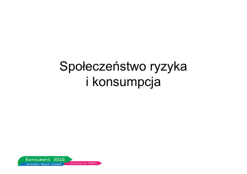 Społeczeństwo ryzyka i konsumpcja Warunki determinujące wybory konsumenckie • • • • ryzyko etos konsumencki walki symboliczne konsumpcja „syntetyczna” Społeczeństwo ryzyka • • • • • rządy skutków ubocznych refleksyjność strukturalna powrót „wypartych” tradycji problematyzacja ekspertyzy podzielony podmiot Odradzanie się wspólnot • nowe wspólnoty jako „symptom” indywidualizacji • funkcjonalizacja wspólnoty • peryferyjne uczestnictwo i „przejaŜdŜki” kulturowe • neotrybalizm poznawczy i estetyczny Postekonomia • ekonomia antyekonomiczna • towar i dobra symboliczne • cenzurowanie motywu ekonomicznego Etos konsumencki • krytyczność i promocja „profesjonalnego” konsumenta • nowe formy ascezy • emblematy ascezy i krytyczności • estetyzacja Ŝycia codziennego Redefinicja konsumpcji • wtórna produkcja i harówka • rozpad hierarchii /rozluźnienie klasyfikacji/ wszystkoŜerność • strategie walk symbolicznych (ekumenizm stylistyczny i popkult) „Opakowania” toŜsamościowe • totemizacja „ja” • doznaniowość i narracja • rynek i wspólnoty jako producenci „opakowań” toŜsamościowych