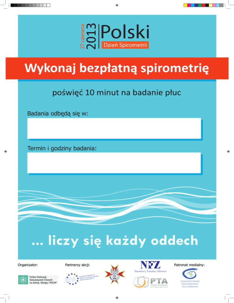 Wykonaj bezpłatną spirometrię poświęć 10 minut na badanie płuc Badania odbędą się w: Termin i godziny badania: ... liczy się każdy oddech Organizator: Partnerzy akcji: Patronat medialny: