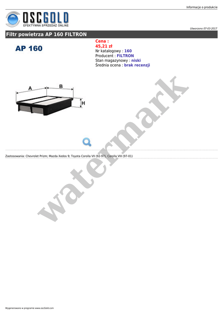 Informacje o produkcie Utworzono 07-03-2017 Filtr powietrza AP 160 FILTRON Cena : 45,21 zł er m ar k Nr katalogowy : 160 Producent : FILTRON Stan magazynowy : niski Średnia ocena : brak recenzji w at Zastosowania: Chevrolet Prizm; Mazda Xedos 9; Toyota Corolla VII (92-97), Corolla VIII (97-01) Wygenerowano w programie www.oscGold.com