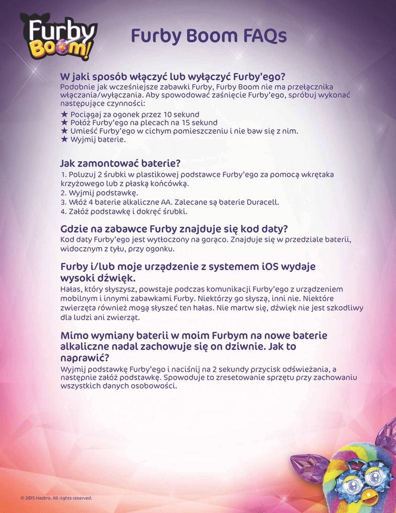 Furby Boom FAQs W jaki sposób włączyć lub wyłączyć Furby’ego? Podobnie jak wcześniejsze zabawki Furby, Furby Boom nie ma przełącznika włączania/wyłączania. Aby spowodować zaśnięcie Furby’ego, spróbuj wykonać następujące czynności: ★ Pociągaj za ogonek przez 10 sekund ★ Połóż Furby’ego na plecach na 15 sekund ★ Umieść Furby’ego w cichym pomieszczeniu i nie baw się z nim. ★ Wyjmij baterie. Jak zamontować baterie? 1. Poluzuj 2 śrubki w plastikowej podstawce Furby’ego za pomocą wkrętaka krzyżowego lub z płaską końcówką. 2. Wyjmij podstawkę. 3. Włóż 4 baterie alkaliczne AA. Zalecane są baterie Duracell. 4. Załóż podstawkę i dokręć śrubki. Gdzie na zabawce Furby znajduje się kod daty? Kod daty Furby’ego jest wytłoczony na gorąco. Znajduje się w przedziale baterii, widocznym z tyłu, przy ogonku. Furby i/lub moje urządzenie z systemem iOS wydaje wysoki dźwięk. Hałas, który słyszysz, powstaje podczas komunikacji Furby’ego z urządzeniem mobilnym i innymi zabawkami Furby. Niektórzy go słyszą, inni nie. Niektóre zwierzęta również mogą słyszeć ten hałas. Nie martw się, dźwięk nie jest szkodliwy dla ludzi ani zwierząt. Mimo wymiany baterii w moim Furbym na nowe baterie alkaliczne nadal zachowuje się on dziwnie. Jak to naprawić? Wyjmij podstawkę Furby’ego i naciśnij na 2 sekundy przycisk odświeżania, a następnie załóż podstawkę. Spowoduje to zresetowanie sprzętu przy zachowaniu wszystkich danych osobowości. © 2015 Hasbro. All rights reserved. Mój Furby usnął i nie mogę go obudzić. Wyjmij podstawkę Furby’ego i naciśnij na 2 sekundy przycisk odświeżania, a następnie załóż podstawkę. Spowoduje to zresetowanie sprzętu przy zachowaniu wszystkich danych osobowości. Instrukcje czyszczenia Furby’ego Delikatnie usuń większe zabrudzenia z futerka Furby’ego ściereczką lub miękką szczoteczką. Następnie LEKKO wilgotną ściereczką usuń plamy. NIE wkładaj Furby’ego do pralki, nie zanurzaj go w wodzie ani nie mocz w inny sposób niż lekko wilgotną ściereczką. Do czyszczenia futerka NIE używaj detergentów, ani odplamiaczy. Gdzie znajdują się czujniki Furby’ego? Furby wyczuwa dotyk, ruch, dźwięk i inne Furby. Kiedy i gdzie mogę kupić Furby’ego Boom? Furby jest dostępny już TERAZ u głównych sprzedawców detalicznych oferujących zabawki oraz w internetowych sklepach z zabawkami. Sprawdź zakładkę „Gdzie kupić”. Jakie są różnice między Furby 2012 a Furby Boom? ★ Znacznie bogatsza zawartość ★ Całkowicie nowe osobowości ★ Zabawka pamięta imię swoje i innych zabawek Furby ★ Nowe wyraziste projekty ★ Nowe pasjonujące doznania w aplikacji Dlaczego Furby nie tańczy gdy odtwarzana jest muzyka? Spróbuj włączyć inną piosenkę lub zwiększyć głośność urządzenia. Czy Furby może komunikować się z innymi zabawkami Furby? Tak, Furby rozpoznaje obecność innych Furby i nawiązuje rozmowę. Jeśli spotkają się odpowiednie osobowości w odpowiednim nastroju, mogą nawet razem śpiewać. Czasem Furby są w dobrych stosunkach, czasem nie. © 2015 Hasbro. All rights reserved. Mój Furby nie komunikuje się z innymi zabawkami Furby Spróbuj wykonać następujące czynności: ★ Aby uzyskać najlepsze wyniki, Furby powinny być skierowane do siebie twarzami i stać w odległości 7,5–12,5 cm. ★ Ponieważ Furby łatwo się rozprasza, w otoczeniu powinno być jak najciszej. Czy Furby reaguje na różne sposoby w zależności od tego, co robię? Tak. Możesz łaskotać, pieścić, potrząsać, przytulać, przechylać, trzymać Furby’ego do góry nogami oraz pociągać go za ogonek. Każda interakcja ma wpływ na jego osobowość. Czy poszczególne kolory (lub opakowania) odpowiadają różnym osobowościom? Nie. Wszystkie Furby mają na początku takie same osobowości. Różne osobowości rozwijają się w zależności od sposobu, w jaki się z nimi bawisz. Każdy Furby może przybrać każdą osobowość. Ile osobowości ma Furby Boom? Zależnie od tego, jak się z nim bawisz, Furby może być Rozkołysany, Słodki, Hiper, Wesoły lub Ostry. A jeżeli nie podoba mi się osobowość mojego Furby’ego? Jeżeli nie podoba Ci się osobowość Twojego Furby’ego, spróbuj traktować go inaczej i zobacz jak się zmieni. Jaki jest zasób słów Furby’ego? Aby się tego dowiedzieć, musisz się z nim dalej bawić. Furby nie reaguje na mój głos. Spróbuj wykonać następujące czynności: ★ Mówiąc do Furby’ego, patrz bezpośrednio na niego/nią i mów powoli oraz wyraźnie. Im bliżej będziesz Furby’ego, tym lepiej będzie Cię słyszał. ★ Ponieważ Furby łatwo się rozprasza, w otoczeniu powinno być jak najciszej. © 2015 Hasbro. All rights reserved.