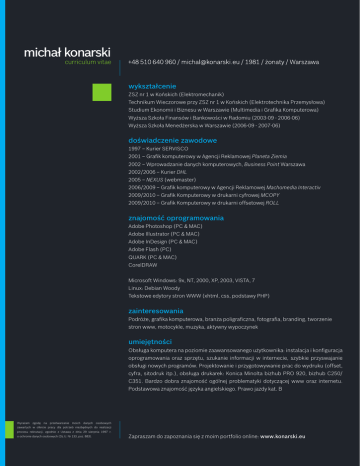 michał konarski curriculum vitae wykształcenie ZSZ nr 1 w Końskich (Elektromechanik) Technikum Wieczorowe przy ZSZ nr 1 w Końskich (Elektrotechnika Przemysłowa) Studium Ekonomii i Biznesu w Warszawie (Multimedia i Grafika Komputerowa) Wyższa Szkoła Finansów i Bankowości w Radomiu (2003-09 - 2006-06) Wyższa Szkoła Menedżerska w Warszawie (2006-09 - 2007-06) doświadczenie zawodowe 1997 – Kurier SERVISCO 2001 – Grafik komputerowy w Agencji Reklamowej Planeta Ziemia 2002 – Wprowadzanie danych komputerowych, Business Point Warszawa 2002/2006 – Kurier DHL 2005 – NEXUS (webmaster) 2006/2009 – Grafik komputerowy w Agencji Reklamowej Machomedia Interactiv 2009/2010 – Grafik Komputerowy w drukarni cyfrowej MCOPY 2009/2010 – Grafik Komputerowy w drukarni offsetowej ROLL znajomość oprogramowania Adobe Photoshop (PC & MAC) Adobe Illustrator (PC & MAC) Adobe InDesign (PC & MAC) Adobe Flash (PC) QUARK (PC & MAC) CorelDRAW Microsoft Windows: 9x, NT, 2000, XP, 2003, VISTA, 7 Linux: Debian Woody Tekstowe edytory stron WWW (xhtml, css, podstawy PHP) zainteresowania Podróże, grafika komputerowa, branża poligraficzna, fotografia, branding, tworzenie stron www, motocykle, muzyka, aktywny wypoczynek umiejętności Obsługa komputera na poziomie zaawansowanego użytkownika: instalacja i konfiguracja oprogramowania oraz sprzętu, szukanie informacji w internecie, szybkie przyswajanie obsługi nowych programów. Projektowanie i przygotowywanie prac do wydruku (offset, cyfra, sitodruk itp.), obsługa drukarek: Konica Minolta bizhub PRO 920, bizhub C250/ C351. Bardzo dobra znajomość ogólnej problematyki dotyczącej www oraz internetu. Podstawowa znajomość języka angielskiego. Prawo jazdy kat. B Wyrażam zgodę na przetwarzanie moich danych osobowych zawartych w ofercie pracy dla potrzeb niezbędnych do realizacji procesu rekrutacji, zgodnie z Ustawa z dnia 29 sierpnia 1997 r. o ochronie danych osobowych (Dz.U. Nr 133, poz. 883). Zapraszam do zapoznania się z moim portfolio online: www.konarski.eu