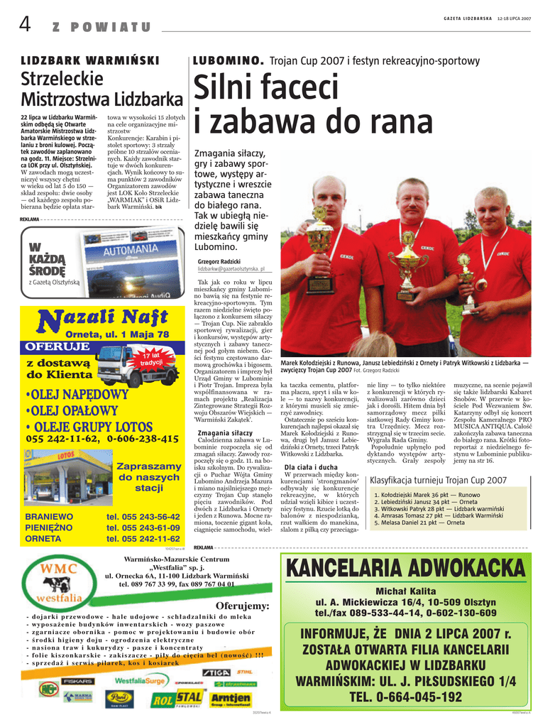 4 G A Z E TA L I D Z B A R S K A 12-18 LIPCA 2007 Z POWIATU L I DZ B A R K WA R M I Ń S K I L U B O M I N O. Trojan Cup 2007 i festyn rekreacyjno-sportowy Strzeleckie Mistrzostwa Lidzbarka Silni faceci i zabawa do rana 22 lipca w Lidzbarku Warmińskim odbędą się Otwarte Amatorskie Mistrzostwa Lidzbarka Warmińskiego w strzelaniu z broni kulowej. Początek zawodów zaplanowano na godz. 11. Miejsce: Strzelnica LOK przy ul. Olsztyńskiej. W zawodach mogą uczestniczyć wszyscy chętni w wieku od lat 5 do 150 — skład zespołu: dwie osoby — od każdego zespołu pobierana będzie opłata star- towa w wysokości 15 złotych na cele organizacyjne mistrzostw Konkurencje: Karabin i pistolet sportowy: 3 strzały próbne 10 strzałów ocenianych. Każdy zawodnik startuje w dwóch konkurencjach. Wynik końcowy to suma punktów 2 zawodników Organizatorem zawodów jest LOK Koło Strzeleckie „WARMIAK” i OSiR Lidzbark Warmiński. bik REKLAMA – – – – – – – – – – – – – – – – – – – – – – – – – – – – – – – – – – – – – – – – – – Zmagania siłaczy, gry i zabawy sportowe, występy artystyczne i wreszcie zabawa taneczna do białego rana. Tak w ubiegłą niedzielę bawili się mieszkańcy gminy Lubomino. Grzegorz Radzicki lidzbarkw@gazetaolsztynska. pl Orneta, ul. 1 Maja 78 OFERUJE z dostawà do Klienta 17 lat tradycji •OLEJ NAP¢DOWY •OLEJ OPA¸OWY • OLEJE GRUPY LOTOS 055 242-11-62, 0-606-238-415 Zapraszamy do naszych stacji BRANIEWO PIENI¢˚NO ORNETA tel. 055 243-56-42 tel. 055 243-61-09 tel. 055 242-11-62 104207razr-a -W Tak jak co roku w lipcu mieszkańcy gminy Lubomino bawią się na festynie rekreacyjno-sportowym. Tym razem niedzielne święto połączono z konkursem siłaczy — Trojan Cup. Nie zabrakło sportowej rywalizacji, gier i konkursów, występów artystycznych i zabawy tanecznej pod gołym niebem. Gości festynu częstowano darmową grochówka i bigosem. Organizatorem i imprezy był Urząd Gminy w Lubominie i Piotr Trojan. Impreza była współfinansowana w ramach projektu „Realizacja Zintegrowane Strategii Rozwoju Obszarów Wiejskich — 'Warmiński Zakątek'. Zmagania siłaczy Całodzienna zabawa w Lubominie rozpoczęła się od zmagań siłaczy. Zawody rozpoczęły się o godz. 11. na boisku szkolnym. Do rywalizacji o Puchar Wójta Gminy Lubomino Andrzeja Mazura i miano najsilniejszego mężczyzny Trojan Cup stanęło pięciu zawodników. Pod dwóch z Lidzbarka i Ornety i jeden z Runowa. Mocne ramiona, toczenie gigant koła, ciągnięcie samochodu, wiel- ka taczka cementu, platforma płaczu, spryt i siła w kole — to nazwy konkurencji, z którymi musieli się zmierzyć zawodnicy. Ostatecznie po sześciu konkurencjach najlepsi okazał się Marek Kołodziejski z Runowa, drugi był Janusz Lebiedziński z Ornety, trzeci Patryk Witkowski z Lidzbarka. nie liny — to tylko niektóre z konkurencji w których rywalizowali zarówno dzieci jak i dorośli. Hitem dnia był samorządowy mecz piłki siatkowej Rady Gminy kontra Urzędnicy. Mecz rozstrzygnął się w trzecim secie. Wygrała Rada Gminy. Popołudnie upłynęło pod dyktando występów artystycznych. Grały zespoły muzyczne, na scenie pojawił się także lidzbarski Kabaret Snobów. W przerwie w kościele Pod Wezwaniem Św. Katarzyny odbył się koncert Zespołu Kameralnego PRO MUSICA ANTIQUA. Całość zakończyła zabawa taneczna do białego rana. Krótki fotoreportaż z niedzielnego festynu w Lubominie publikujemy na str 16. Dla ciała i ducha W przerwach między konkurencjami 'strongmanów' odbywały się konkurencje rekreacyjne, w których udział wzięli kibice i uczestnicy festynu. Rzucie lotką do balonów z niespodzianką, rzut wałkiem do manekina, slalom z piłką czy przeciąga- Klasyfikacja turnieju Trojan Cup 2007 1. Kołodziejski Marek 36 pkt — Runowo 2. Lebiedziński Janusz 34 pkt — Orneta 3. Witkowski Patryk 28 pkt — Lidzbark warmiński 4. Amrasas Tomasz 27 pkt — Lidzbark Warmiński 5. Melasa Daniel 21 pkt — Orneta REKLAMA – – – – – – – – – – – – – – – – – – – – – – – – – – – – – – – – – – – – – – – – – – – – – – – – – – – – – – – – – – – – – – – – – – – – – – – – – – – – – – – – – – – – – – – – – – – – Warmiƒsko-Mazurskie Centrum „Westfalia” sp. j. ul. Ornecka 6A, 11-100 Lidzbark Warmiƒski tel. 089 767 33 99, fax 089 767 04 01 KANCELARIA ADWOKACKA Oferujemy: - Marek Kołodziejski z Runowa, Janusz Lebiedziński z Ornety i Patryk Witkowski z Lidzbarka — zwycięzcy Trojan Cup 2007 Fot. Grzegorz Radzicki dojarki przewodowe - hale udojowe - sch∏adzalniki do mleka wyposa˝enie budynków inwentarskich - wozy paszowe zgarniacze obornika - pomoc w projektowaniu i budowie obór Êrodki higieny doju - ogrodzenia elektryczne nasiona traw i kukurydzy - pasze i koncentraty folie kiszonkarskie - zakiszacze - pi∏y do ci´cia bel (nowoÊç) !!! sprzeda˝ i serwis pilarek, kos i kosiarek 35207lwwl-a -K Micha∏ Kalita ul. A. Mickiewicza 16/4, 10-509 Olsztyn tel./fax 089-533-44-14, 0-602-130-609 INFORMUJE, ˚E DNIA 2 LIPCA 2007 r. ZOSTA¸A OTWARTA FILIA KANCELARII ADWOKACKIEJ W LIDZBARKU WARMI¡SKIM: UL. J. PI¸SUDSKIEGO 1/4 TEL. 0-664-045-192 46007lwwl-a -A