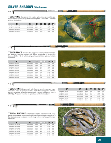 SILVER SHADOW Teleskopowe TELE MINO Bardzo szybkie wędki spławikowe z wyraźnie zarysowaną szczytową akcją. Końcowy fragment szczytówki z pełnego włókna węglowego. Silver Shadow Tele Mino FTA WJ-SXM33025 3,30m 114cm 4 5-25g 218g Silver Shadow Tele Mino FTA WJ-SXM36025 3,60m 115cm 5 5-25g 246g Silver Shadow Tele Mino FTA WJ-SXM39025 3,90m 119cm 5 5-25g 279g Silver Shadow Tele Mino FTA WJ-SXM42025 4,20m 120cm 6 5-25g 246g TELE PRINCE Uniwersalne, wygodne w transporcie teleskopowe wędki spławikowe. Dostępne w dwóch przedziałach ciężaru rzutowego: 5-25 g i 10-40 g. Polecamy do łowienia białej ryby na rzekach i jeziorach. Silver Shadow Tele Prince WJ-STT30025 3,00m 97cm 5 5-25g 220g Silver Shadow Tele Prince WJ-STT33025 3,30m 97cm 5 5-25g 229g Silver Shadow Tele Prince WJ-STT36025 3,60m 92cm 6 5-25g 312g Silver Shadow Tele Prince WJ-STT39025 3,90m 98cm 6 5-25g 332g Silver Shadow Tele Prince WJ-STT42025 4,20m 93cm 7 5-25g 426g Silver Shadow Tele Prince WJ-STT33040 3,30m 97cm 5 10-40g 239g 325g Silver Shadow Tele Prince WJ-STT36040 3,60m 92cm 6 10-40g Silver Shadow Tele Prince WJ-STT39040 3,90m 98cm 6 10-40g 352g Silver Shadow Tele Prince WJ-STT42040 4,20m 93cm 7 10-40g 429g TELE SPIN Krótsze wędki teleskopowe o uniwersalnym przeznaczeniu. Mała długość po złożeniu, wędki bardzo wygodne w transporcie. Dostępne w dwóch przedziałach ciężaru rzutowego: 5-25 g i 10-40 g. Polecamy również do spinningu na błystki i woblery. Silver Shadow Tele Spin WJ-STS24025 2,40m 63cm 5 5-25g 171g Silver Shadow Tele Spin WJ-STS27025 2,70m 63cm 6 5-25g 221g Silver Shadow Tele Spin WJ-STS30025 3,00m 64cm 6 5-25g 236g Silver Shadow Tele Spin WJ-STS24040 2,40m 67cm 5 10-40g 200g Silver Shadow Tele Spin WJ-STS27040 2,70m 70cm 5 10-40g 216g Silver Shadow Tele Spin WJ-STS30040 3,00m 75cm 5 10-40g 228g TELE ALLROUND Kolejna seria wędek teleskopowych, przydatnych nie tylko w metodzie spławikowej. Mocniejsza wersja 20-60 g bardzo dobrze sprawdza się w łowieniu gruntowym z koszyczkiem zanętowym. Silver Shadow Tele Allround WJ-STA33040 3,30m 96cm 6 10-40g Silver Shadow Tele Allround WJ-STA36040 3,60m 96cm 6 10-40g 302g 322g Silver Shadow Tele Allround WJ-STA39040 3,90m 96cm 6 10-40g 333g Silver Shadow Tele Allround WJ-STA42040 4,20m 97cm 7 10-40g 373g Silver Shadow Tele Allround WJ-STA33060 3,30m 96cm 6 20-60g 325g Silver Shadow Tele Allround WJ-STA36060 3,60m 96cm 6 20-60g 339g Silver Shadow Tele Allround WJ-STA39060 3,90m 96cm 6 20-60g 359g 21
