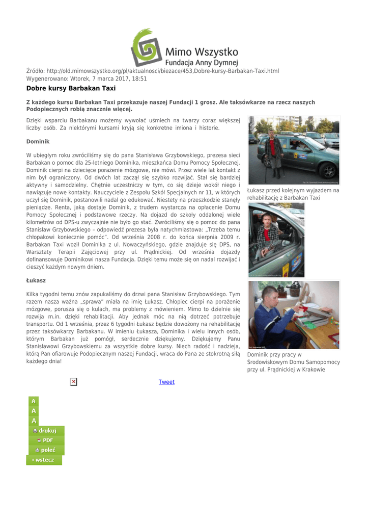 Źródło: http://old.mimowszystko.org/pl/aktualnosci/biezace/453,Dobre-kursy-Barbakan-Taxi.html Wygenerowano: Wtorek, 7 marca 2017, 18:51 Dobre kursy Barbakan Taxi Z każdego kursu Barbakan Taxi przekazuje naszej Fundacji 1 grosz. Ale taksówkarze na rzecz naszych Podopiecznych robią znacznie więcej. Dzięki wsparciu Barbakanu możemy wywołać uśmiech na twarzy coraz większej liczby osób. Za niektórymi kursami kryją się konkretne imiona i historie. Dominik W ubiegłym roku zwróciliśmy się do pana Stanisława Grzybowskiego, prezesa sieci Barbakan o pomoc dla 25-letniego Dominika, mieszkańca Domu Pomocy Społecznej. Dominik cierpi na dziecięce porażenie mózgowe, nie mówi. Przez wiele lat kontakt z nim był ograniczony. Od dwóch lat zaczął się szybko rozwijać. Stał się bardziej aktywny i samodzielny. Chętnie uczestniczy w tym, co się dzieje wokół niego i nawiązuje nowe kontakty. Nauczyciele z Zespołu Szkół Specjalnych nr 11, w których uczył się Dominik, postanowili nadal go edukować. Niestety na przeszkodzie stanęły pieniądze. Renta, jaką dostaje Dominik, z trudem wystarcza na opłacenie Domu Pomocy Społecznej i podstawowe rzeczy. Na dojazd do szkoły oddalonej wiele kilometrów od DPS-u zwyczajnie nie było go stać. Zwróciliśmy się o pomoc do pana Stanisław Grzybowskiego – odpowiedź prezesa była natychmiastowa: „Trzeba temu chłopakowi koniecznie pomóc”. Od września 2008 r. do końca sierpnia 2009 r. Barbakan Taxi woził Dominika z ul. Nowaczyńskiego, gdzie znajduje się DPS, na Warsztaty Terapii Zajęciowej przy ul. Prądnickiej. Od września dojazdy dofinansowuje Dominikowi nasza Fundacja. Dzięki temu może się on nadal rozwijać i cieszyć każdym nowym dniem. Łukasz przed kolejnym wyjazdem na rehabilitację z Barbakan Taxi Łukasz Kilka tygodni temu znów zapukaliśmy do drzwi pana Stanisław Grzybowskiego. Tym razem nasza ważna „sprawa” miała na imię Łukasz. Chłopiec cierpi na porażenie mózgowe, porusza się o kulach, ma problemy z mówieniem. Mimo to dzielnie się rozwija m.in. dzięki rehabilitacji. Aby jednak móc na nią dotrzeć potrzebuje transportu. Od 1 września, przez 6 tygodni Łukasz będzie dowożony na rehabilitację przez taksówkarzy Barbakanu. W imieniu Łukasza, Dominika i wielu innych osób, którym Barbakan już pomógł, serdecznie dziękujemy. Dziękujemy Panu Stanisławowi Grzybowskiemu za wszystkie dobre kursy. Niech radość i nadzieja, którą Pan ofiarowuje Podopiecznym naszej Fundacji, wraca do Pana ze stokrotną siłą każdego dnia! Tweet Dominik przy pracy w Środowiskowym Domu Samopomocy przy ul. Prądnickiej w Krakowie