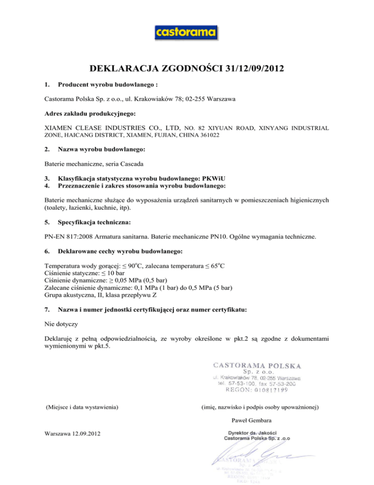 DEKLARACJA ZGODNOŚCI 31/12/09/2012 1. Producent wyrobu budowlanego : Castorama Polska Sp. z o.o., ul. Krakowiaków 78; 02-255 Warszawa Adres zakładu produkcyjnego: XIAMEN CLEASE INDUSTRIES CO., LTD, NO. 82 XIYUAN ROAD, XINYANG INDUSTRIAL ZONE, HAICANG DISTRICT, XIAMEN, FUJIAN, CHINA 361022 2. Nazwa wyrobu budowlanego: Baterie mechaniczne, seria Cascada 3. 4. Klasyfikacja statystyczna wyrobu budowlanego: PKWiU Przeznaczenie i zakres stosowania wyrobu budowlanego: Baterie mechaniczne służące do wyposażenia urządzeń sanitarnych w pomieszczeniach higienicznych (toalety, łazienki, kuchnie, itp). 5. Specyfikacja techniczna: PN-EN 817:2008 Armatura sanitarna. Baterie mechaniczne PN10. Ogólne wymagania techniczne. 6. Deklarowane cechy wyrobu budowlanego: Temperatura wody gorącej: ≤ 90oC, zalecana temperatura ≤ 65oC Ciśnienie statyczne: ≤ 10 bar Ciśnienie dynamiczne: ≥ 0,05 MPa (0,5 bar) Zalecane ciśnienie dynamiczne: 0,1 MPa (1 bar) do 0,5 MPa (5 bar) Grupa akustyczna, II, klasa przepływu Z 7. Nazwa i numer jednostki certyfikującej oraz numer certyfikatu: Nie dotyczy Deklaruję z pełną odpowiedzialnością, ze wyroby określone w pkt.2 są zgodne z dokumentami wymienionymi w pkt.5. (Miejsce i data wystawienia) (imię, nazwisko i podpis osoby upoważnionej) Paweł Gembara Warszawa 12.09.2012