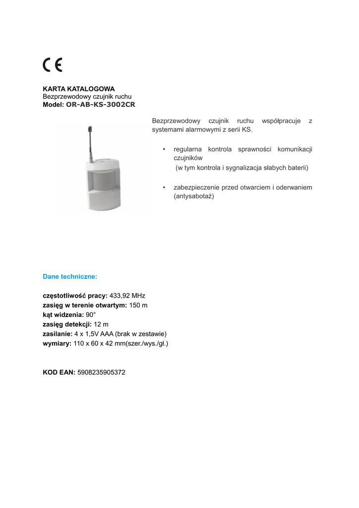 KARTA KATALOGOWA Bezprzewodowy czujnik ruchu Model: OR-AB-KS-3002CR Bezprzewodowy czujnik ruchu systemami alarmowymi z serii KS. z • regularna kontrola sprawności komunikacji czujników (w tym kontrola i sygnalizacja słabych baterii) • zabezpieczenie przed otwarciem i oderwaniem (antysabotaż) Dane techniczne: częstotliwość pracy: 433,92 MHz zasięg w terenie otwartym: 150 m kąt widzenia: 90° zasięg detekcji: 12 m zasilanie: 4 x 1,5V AAA (brak w zestawie) wymiary: 110 x 60 x 42 mm(szer./wys./gł.) KOD EAN: 5908235905372 współpracuje