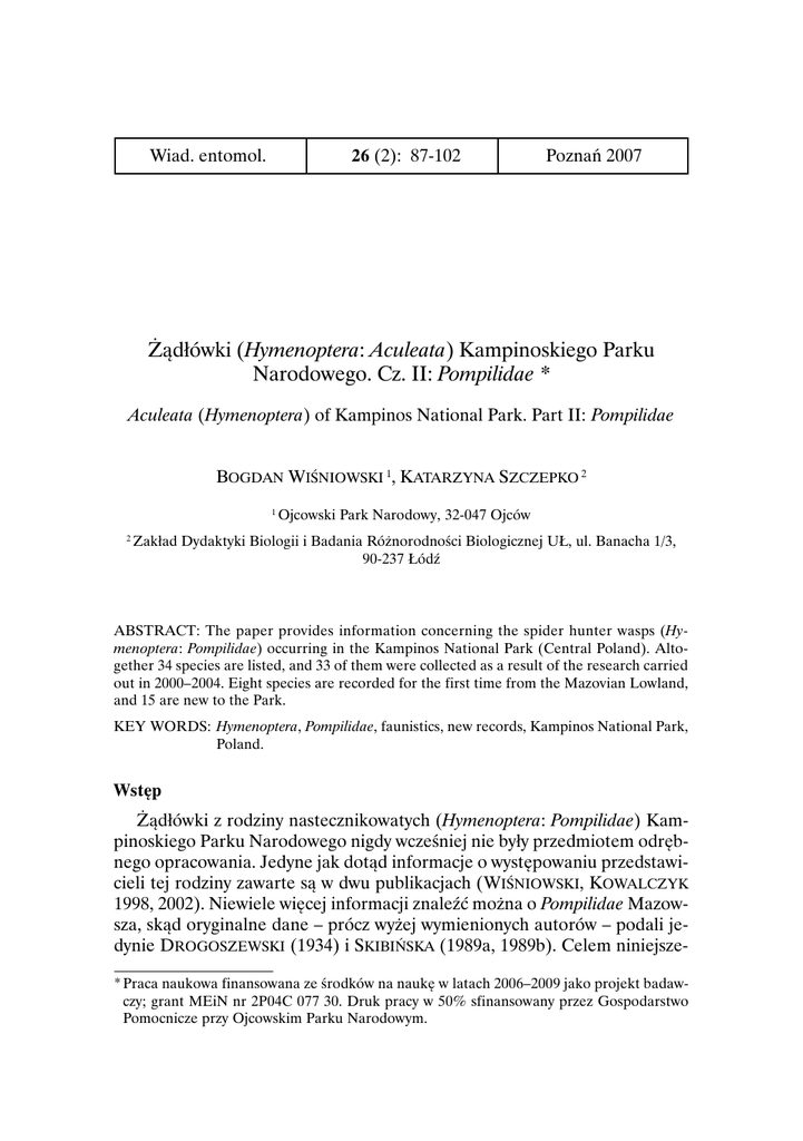 (Hymenoptera: Aculeata) Kampinoskiego Parku Narodowego. Cz. II