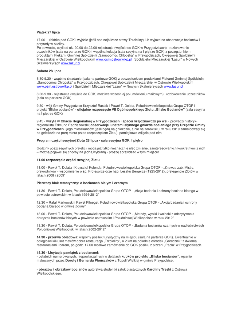 Piątek 27 lipca 17.00 – zbiórka pod GOK i wyjście (jeśli nad najbliŜsze stawy Trzcieliny) lub wyjazd na obserwacje bocianów i przyrody w okolicy. Po powrocie, czyli od ok. 20.00 do 22.00 rejestracja (wejście do GOK w Przygodzicach) i rozlokowanie uczestników (sala na parterze GOK) i wspólna kolacja (sala sesyjna na I piętrze GOK) z poczęstunkiem produktami Piekarni Gminnej Spółdzielni „Samopomoc Chłopska” w Przygodzicach, Okręgowej Spółdzielni Mleczarskiej w Ostrowie Wielkopolskim www.osm.ostrowwlkp.pl i Spółdzielni Mleczarskiej "Lazur" w Nowych Skalmierzycach www.lazur.pl Sobota 28 lipca 8.30-9.30 - wspólne śniadanie (sala na parterze GOK) z poczęstunkiem produktami Piekarni Gminnej Spółdzielni „Samopomoc Chłopska” w Przygodzicach, Okręgowej Spółdzielni Mleczarskiej w Ostrowie Wielkopolskim www.osm.ostrowwlkp.pl i Spółdzielni Mleczarskiej "Lazur" w Nowych Skalmierzycach www.lazur.pl 8.00-9.30 - rejestracja (wejście do GOK, moŜliwe wcześniej po umówieniu mailowym) i rozlokowanie uczestników (sala na parterze GOK) 9.30 - wójt Gminy Przygodzice Krzysztof Rasiak i Paweł T. Dolata, Południowowielkopolska Grupa OTOP i projekt "Blisko bocianów" - oficjalne rozpoczęcie VII Ogólnopolskiego Zlotu „Blisko Bocianów” (sala sesyjna na I piętrze GOK) 9.45 - wizyta w Chacie Regionalnej w Przygodzicach i spacer krajoznawczy po wsi - prowadzi historykregionalista Edmund Radziszewski; obserwacje lunetami słynnego gniazda bocianiego przy Urzędzie Gminy w Przygodzicach i jego mieszkańców (jeśli będą na gnieździe, a nie na Ŝerowisku, w roku 2010 zameldowały się na gnieździe na parę minut przed rozpoczęciem Zlotu), pamiątkowe zdjęcia pod nim Program części sesyjnej Zlotu 28 lipca - sala sesyjna GOK, I piętro Godziny poszczególnych prelekcji mogą juŜ tylko nieznacznie ulec zmianie, zainteresowanych konkretnymi z nich – moŜna pojawić się choćby na jedną wybraną - proszę sprawdzać w tym miejscu! 11.00 rozpoczęcie części sesyjnej Zlotu 11.00 - Paweł T. Dolata i Krzysztof Kolenda, Południowowielkopolska Grupa OTOP - „Znawca Ŝab, Mistrz przyrodników - wspomnienie o śp. Profesorze drze hab. Leszku Bergerze (1925-2012), prelegencie Zlotów w latach 2008 i 2009” Pierwszy blok tematyczny: o bocianach białym i czarnym 11.30 - Paweł T. Dolata, Południowowielkopolska Grupa OTOP - „Akcja badania i ochrony bociana białego w powiecie ostrowskim w latach 1994-2012” 12.30 – Rafał Markowski i Paweł Pfloegel, Południowowielkopolska Grupa OTOP - „Akcja badania i ochrony bociana białego w gminie Zduny” 13.00 - Paweł T. Dolata, Południowowielkopolska Grupa OTOP - „Metody, wyniki i wnioski z odczytywania obrączek bocianów białych w powiecie ostrowskim i Południowej Wielkopolsce w roku 2012” 13.30 - Paweł T. Dolata, Południowowielkopolska Grupa OTOP - „Badania bocianów czarnych w nadleśnictwach Południowej Wielkopolski w latach 2002-2012” 14.30 - przerwa obiadowa: wspólny posiłek turystyczny na miejscu (sala na parterze GOK). Ewentualnie w odległości kilkuset metrów dobra restauracja „Trzcieliny”, o 2 km na południe ośrodek „Górecznik” z dwiema restauracjami i barem, po godz. 17.00 moŜliwe zamówienie do GOK posiłku z pizzerii „Paola” w Przygodzicach. 15.30 - Licytacja pamiątek z bocianami: - ostatnich numerowanych, niepowtarzalnych w detalach kubków projektu „Blisko bocianów”, ręcznie malowanych przez Dorotę i Bernarda Płończaków z Topoli Wielkiej w gminie Przygodzice; - obrazów i obrazków bocianów autorstwa studentki sztuk plastycznych Karoliny Treski z Ostrowa Wielkopolskiego. Drugi blok prelekcji: 16.15 - dr Zbigniew Kwieciński, Ogród Zoologiczny w Poznaniu i Katedra Zoologii UP w Poznaniu - „Pokarm i trawienie u bociana białego” 17.00 - Krzysztof Kolenda, Południowowielkopolska Grupa OTOP - „Chrońmy stawy jako lokalne ostoje płazów i przyrody - przykład Ostrowa Wielkopolskiego” 17.45 - Anna i Adam Janiszewscy, Południowowielkopolska Grupa OTOP – pokaz fotografii „Mysikrólik w pelargoniach” 18.15 – Artur i Saturnina Homanowie – prezentacja i pokaz wielokrotnie nagradzanego filmu „Rytmy natury w Dolinie Baryczy” oraz podpisywanie filmów przez autorów 19.15 – Janina i Jerzy Bartuzi, Południowowielkopolska Grupa OTOP – Ptaki Arizony i Kalifornii (pokaz slajdów) W trakcie tego maratonu prelekcji będzie do dyspozycji czajnik z wrzątkiem, by móc się wzmocnić kawą lub herbatą. Uwaga! Chętnie włączymy do programu krótkie (5-10 minut) prezentacje uczestników zlotów na tematy bocianie i przyrodnicze. Zgłoszenia proszę przesyłać na [email protected], wybór naleŜy do organizatorów. Na miejscu w sobotę będzie teŜ czynne stoisko informacyjne Południowowielkopolskiej Grupy OTOP z moŜliwością zakupu wydawnictw przyrodniczych Ok. 20.00 – występ młodej ostrowskiej piosenkarki Zosi Banaszak (oczywiście miłośniczki bocianów), juŜ nagrodzonej lub wyróŜnionej na kilku konkursach. (scena na sali na parterze GOK) Kolacja i wieczorne spotkanie przy ognisku Ok. 20.30 - pierwszy dzień Zlotu zakończy wspólne ognisko przy budynku GOK w Przygodzicach. Specjalność wieczoru - grzanki z serem „Lazur” z Nowych Skalmierzyc. Zwolennicy tradycyjnego pieczenia kiełbasek organizują je we własnym zakresie. Dwa sklepy spoŜywcze są ok. 100 m od GOK. Będzie okazja porozmawiać o bocianach, Przygodzicach, przyrodzie i nie tylko… W razie niepogody kolacja i wieczorne posiedzenie odbędą się w sali na parterze GOK.