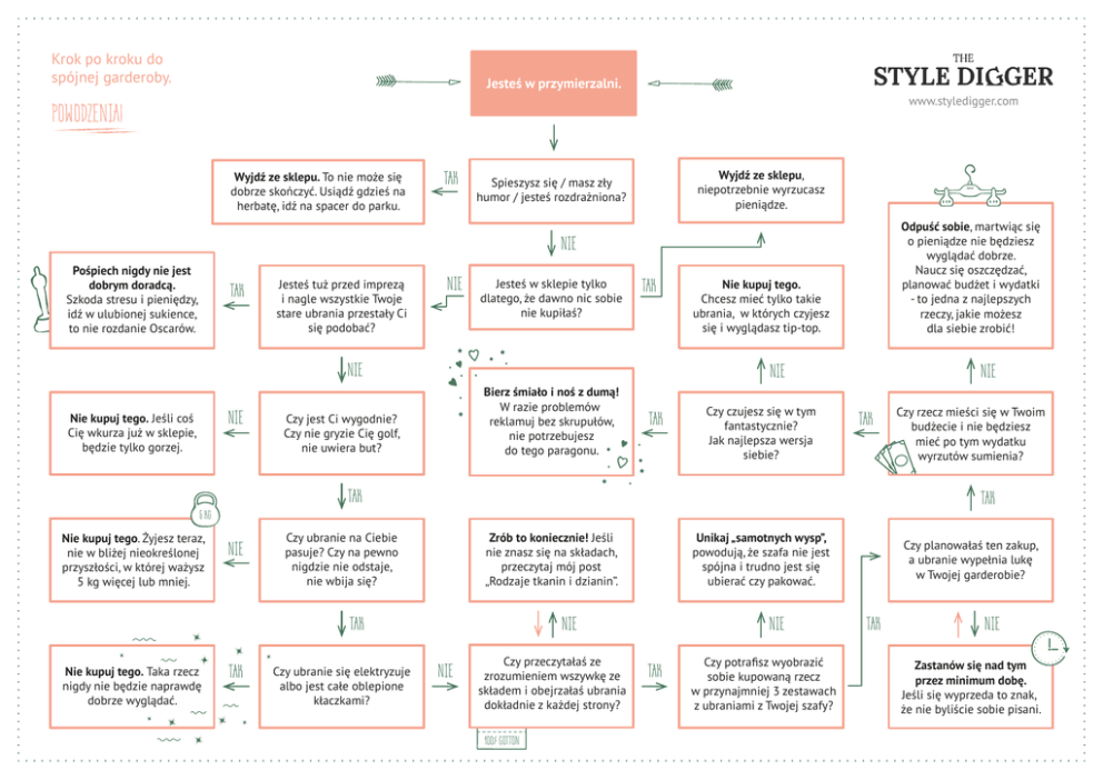 Krok po kroku do spójnej garderoby. Jesteś w przymierzalni. www.styledigger.com Powodzenia! Wyjdź ze sklepu. To nie może się dobrze skończyć. Usiądź gdzieś na herbatę, idź na spacer do parku. tak Wyjdź ze sklepu, niepotrzebnie wyrzucasz pieniądze. Spieszysz się / masz zły humor / jesteś rozdrażniona? Odpuść sobie, martwiąc się o pieniądze nie będziesz wyglądać dobrze. Naucz się oszczędzać, planować budżet i wydatki - to jedna z najlepszych rzeczy, jakie możesz dla siebie zrobić! nie Pośpiech nigdy nie jest dobrym doradcą. Szkoda stresu i pieniędzy, idź w ulubionej sukience, to nie rozdanie Oscarów. TAK Jesteś tuż przed imprezą i nagle wszystkie Twoje stare ubrania przestały Ci się podobać? nie Jesteś w sklepie tylko dlatego, że dawno nic sobie nie kupiłaś? tak nie nie Nie kupuj tego. Jeśli coś Cię wkurza już w sklepie, będzie tylko gorzej. Nie kupuj tego. Chcesz mieć tylko takie ubrania, w których czyjesz się i wyglądasz tip-top. nie Bierz śmiało i noś z dumą! W razie problemów reklamuj bez skrupułów, nie potrzebujesz do tego paragonu. Czy jest Ci wygodnie? Czy nie gryzie Cię golf, nie uwiera but? tak Czy czujesz się w tym fantastycznie? Jak najlepsza wersja siebie? nie tak tak Czy rzecz mieści się w Twoim budżecie i nie będziesz mieć po tym wydatku wyrzutów sumienia? tak 5 kg Nie kupuj tego. Żyjesz teraz, nie w bliżej nieokreślonej przyszłości, w której ważysz 5 kg więcej lub mniej. nie tak Nie kupuj tego. Taka rzecz nigdy nie będzie naprawdę dobrze wyglądać. tak Czy ubranie się elektryzuje albo jest całe oblepione kłaczkami? Unikaj „samotnych wysp”, powodują, że szafa nie jest spójna i trudno jest się ubierać czy pakować. Zrób to koniecznie! Jeśli nie znasz się na składach, przeczytaj mój post „Rodzaje tkanin i dzianin”. Czy ubranie na Ciebie pasuje? Czy na pewno nigdzie nie odstaje, nie wbija się? nie nie Czy przeczytałaś ze zrozumieniem wszywkę ze składem i obejrzałaś ubrania dokładnie z każdej strony? 100% cotton nie tak Czy potrafisz wyobrazić sobie kupowaną rzecz w przynajmniej 3 zestawach z ubraniami z Twojej szafy? Czy planowałaś ten zakup, a ubranie wypełnia lukę w Twojej garderobie? tak nie Zastanów się nad tym przez minimum dobę. Jeśli się wyprzeda to znak, że nie byliście sobie pisani.