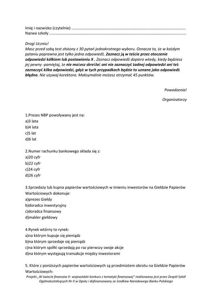 Imię i nazwisko (czytelnie) .……………………………………………………………………………………………………. Nazwa szkoły …………………………………………………………………………………………………………………………. Drogi Uczniu! Masz przed sobą test złożony z 30 pytań jednokrotnego wyboru. Oznacza to, że w każdym pytaniu poprawna jest tylko jedna odpowiedź. Zaznacz ją w teście przez otoczenie odpowiedzi kółkiem lub postawieniu X . Zaznacz odpowiedź dopiero wtedy, kiedy będziesz jej pewny -pamiętaj, że nie możesz skreślać ani nie zaznaczyć żadnej odpowiedzi ani też zaznaczyć kilka odpowiedzi, gdyż w tych przypadkach będzie to uznane jako odpowiedź błędna. Nie używaj korektora. Maksymalnie możesz otrzymać 45 punktów. Powodzenia! Organizatorzy 1.Prezes NBP powoływany jest na: a)3 lata b)4 lata c)5 lat d)6 lat 2.Numer rachunku bankowego składa się z: a)20 cyfr b)22 cyfr c)24 cyfr d)26 cyfr 3.Sprzedaży lub kupna papierów wartościowych w imieniu inwestorów na Giełdzie Papierów Wartościowych dokonuje: a)prezes Giełdy b)doradca inwestycyjny c)doradca finansowy d)makler giełdowy 4.Rynek wtórny to rynek: a)na którym kupuje się pieniądz b)na którym sprzedaje się pieniądz c)na którym spółki sprzedają po raz pierwszy swoje akcje d)na którym występują transakcje między inwestorami 5. Które z poniższych papierów wartościowych są przedmiotem obrotu na Giełdzie Papierów Wartościowych: Projekt „W świecie finansów II- wojewódzki konkurs z tematyki finansowej” realizowany jest przez Zespół Szkół Ogólnokształcących Nr II w Opolu i dofinansowany ze środków Narodowego Banku Polskiego a)czeki b)weksle c)obligacje d)wszystkie powyższe 6.Bessa to: a)spadek dynamiki Produktu Krajowego Brutto b)spadek cen, czyli to samo co deflacja c)długotrwały spadek cen akcji na Giełdzie Papierów Wartościowych d)jednorazowy spadek cen akcji na Giełdzie Papierów Wartościowych 7.Do gromadzenia środków pieniężnych i przeprowadzania rozliczeń nie należy: a)Rachunek Oszczędnościowo-Rozliczeniowy b)ROR c)rachunek osobisty w banku komercyjnym d)rachunek maklerski 8.Skrót BIK oznacza: a)Biuro Informacji Kredytowej b)Biuro Informacji Konsumenta c)Bank Internetowo-Konsumencki d)nie ma takiego skrótu, jest tylko skrót BIG od Biura Informacji Gospodarczej 9.Dokument potwierdzający zawarcie umowy ubezpieczenia to: a)ogólne warunki ubezpieczenia (tzw. OWU) b)polisa ubezpieczeniowa c)umowa sumy ubezpieczeniowej d)umowa wartości ubezpieczeniowej 10.Podatek od zysków kapitałowych nazywa się potocznie podatkiem: a)Belki b)Balcerowicza c)Tuska d)Komorowskiego 11.Do inwestycji finansowych nie zalicza się: a)kupno papierów wartościowych b)lokaty bankowej c)polisy ubezpieczeniowej z inwestycyjnym funduszem kapitałowym d)kupno przedmiotów numizmatycznych, np.monet Projekt „W świecie finansów II- wojewódzki konkurs z tematyki finansowej” realizowany jest przez Zespół Szkół Ogólnokształcących Nr II w Opolu i dofinansowany ze środków Narodowego Banku Polskiego 12.Do ubezpieczeń społecznych nie zalicza się ubezpieczeń: a)emerytalnych b)rentowych c)chorobowych d)majątkowych 13.Do banku wpłacono 1000zł. Oprocentowanie w skali roku wynosi 5%.Po roku bank dopisał odsetki w wysokości ( w obliczeniach uwzględnij należny podatek): a)40,50 zł b)45 zł c)50 zł d)50,50zł 14.Krótkoterminowe papiery wartościowe emitowane przez Skarb Państwa to: a)weksle b)bony skarbowe c)obligacje d)akcje 15.Towary powszechnie poszukiwane, np. zboże, zwierzęta, sól itp. używane dawniej w celu zapłaty za inne towary lub usługi to: a)monetarki b)kwity depozytowe c)barterki d)płacidła 16.Głównym celem banków spółdzielczych jest: a)osiąganie zysku b)zaspakajanie potrzeb członków banku c)przyjmowanie depozytów d)udzielanie kredytów 17.Lokata rentierska to lokata: a)zazwyczaj krótkoterminowa b)w której odsetki od depozytu nie są kapitalizowane, lecz wypłacane właścicielowi lub wskazanej przez niego osobie c)w której odsetki od depozytu są kapitalizowane d)żadna z odpowiedzi nie jest poprawna 18.Obligacje zerokuponowe to obligacje: a)o stałym oprocentowaniu Projekt „W świecie finansów II- wojewódzki konkurs z tematyki finansowej” realizowany jest przez Zespół Szkół Ogólnokształcących Nr II w Opolu i dofinansowany ze środków Narodowego Banku Polskiego b)o zmiennym oprocentowaniu c)o stałym lub zmiennym oprocentowaniu d)bez oprocentowania 19.Publikowany codziennie urzędowy wykaz m.inn. papierów wartościowych to: a)REGUŁA b)KAZUŁA c)CEDUŁA d)MADUŁA 20.Bank centralny w celu walki z inflacją powinien: a)zwiększyć podaż pieniądza b)prowadzić restrykcyjną politykę monetarną c)prowadzić ekspansywna politykę monetarna d)sprzedawać papiery wartościowe 21.Przekierowanie posiadacza karty płatniczej z autentycznej strony wydawcy na stronę stworzoną przez przestępców to: a)vishing b)phone phising c)skimming d)pharming 22.Usługa cashback jest alternatywnym rozwiązaniem dla: a)wypłaty gotówki z bankomatu b)wpłaty gotówki do bankomatu c)stałego przelewu d)polecenia zapłaty 23.Stopa redyskontowa to stopa, po której: a)bank centralny skupuje wcześniej zdyskontowane przez bank komercyjny weksle b)bank komercyjny udziela podmiotom gospodarczym kredytów inwestycyjnych c)bank komercyjny udziela osobom fizycznym kredytów konsumpcyjnych d)ludzie pożyczają sobie wzajemnie pieniądze 24.Fundusze inwestycyjne prowadzące najmniej ryzykowną politykę inwestycyjną to fundusze: a)akcyjne b)rynku pieniężnego c)obligacyjne d)zrównoważone Projekt „W świecie finansów II- wojewódzki konkurs z tematyki finansowej” realizowany jest przez Zespół Szkół Ogólnokształcących Nr II w Opolu i dofinansowany ze środków Narodowego Banku Polskiego 25.Walne Zgromadzenie Akcjonariuszy nie może: a)wybierać cz