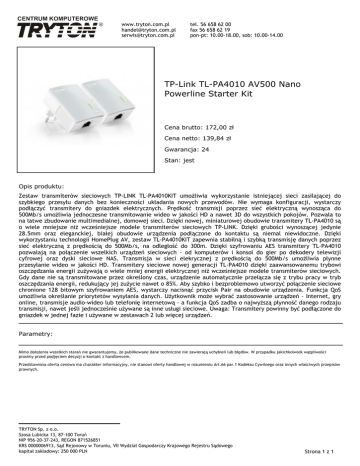 www.tryton.com.pl [email protected] [email protected] tel. 56 658 62 00 fax 56 658 62 19 pon-pt: 10.00-18.00, sob: 10.00-14.00 TP-Link TL-PA4010 AV500 Nano Powerline Starter Kit Cena brutto: 172,00 zł Cena netto: 139,84 zł Gwarancja: 24 Stan: jest Opis produktu: Zestaw transmiterów sieciowych TP-LINK TL-PA4010KIT umożliwia wykorzystanie istniejącej sieci zasilającej do szybkiego przesyłu danych bez konieczności układania nowych przewodów. Nie wymaga konfiguracji, wystarczy podłączyć transmitery do gniazdek elektrycznych. Prędkość transmisji poprzez sieć elektryczną wynosząca do 500Mb/s umożliwia jednoczesne transmitowanie wideo w jakości HD a nawet 3D do wszystkich pokojów. Pozwala to na łatwe zbudowanie multimedialnej, domowej sieci. Dzięki nowej, miniaturowej obudowie transmitery TL-PA4010 są o wiele mniejsze niż wcześniejsze modele transmiterów sieciowych TP-LINK. Dzięki grubości wynoszącej jedynie 28.5mm oraz eleganckiej, białej obudowie urządzenia podłączone do kontaktu są niemal niewidoczne. Dzięki wykorzystaniu technologii HomePlug AV, zestaw TL-PA4010KIT zapewnia stabilną i szybką transmisję danych poprzez sieć elektryczną z prędkością do 500Mb/s, na odległość do 300m. Dzięki szyfrowaniu AES transmitery TL-PA4010 pozwalają na połączenie wszelkich urządzeń sieciowych - od komputerów i konsol do gier po dekodery telewizji cyfrowej oraz dyski sieciowe NAS. Transmisja w sieci elekrycznej z prędkością do 500Mb/s umożliwia płynne przesyłanie wideo w jakości HD. Transmitery sieciowe nowej generacji TL-PA4010 dzięki zaawansowanemu trybowi oszczędzania energii zużywają o wiele mniej energii elektrycznej niż wcześniejsze modele transmiterów sieciowych. Gdy dane nie są transmitowane przez określony czas, urządzenie automatycznie przełącza się z trybu pracy w tryb oszczędzania energii, redukujący jej zużycie nawet o 85%. Aby szybko i bezproblemowo utworzyć połączenie sieciowe chronione 128 bitowym szyfrowaniem AES, wystarczy nacisnąć przycisk Pair na obudowie urządzenia. Funkcja QoS umożliwia określanie priorytetów wysyłania danych. Użytkownik może wybrać zastosowanie urządzeń - Internet, gry online, transmisje audio-wideo lub telefonię internetową - a funkcja QoS zadba o najwyższą płynność danego rodzaju transmisji, nawet jeśli jednocześnie używane są inne usługi sieciowe. Uwaga: Transmitery powinny być podłączone do gniazdek w jednej fazie i używane w zestawach 2 lub więcej urządzeń. Parametry: Mimo dołożenia wszelkich starań nie gwarantujemy, że publikowane dane techniczne nie zawierają uchybień lub błędów. W przypadku jakichkolwiek wątpliwości prosimy przed podjęciem decyzji o kontakt z handlowcem. Przedstawiona oferta cenowa ma charakter informacyjny, nie stanowi oferty handlowej w rozumieniu Art.66 par.1 Kodeksu Cywilnego oraz innych właściwych przepisów prawnych. TRYTON Sp. z o.o. Szosa Lubicka 13, 87-100 Toruń NIP 956-20-37-243, REGON 871526851 KRS 0000006913, Sąd Rejonowy w Toruniu, VII Wydział Gospodarczy Krajowego Rejestru Sądowego kapitał zakładowy: 250 000 PLN Strona 1 z 1