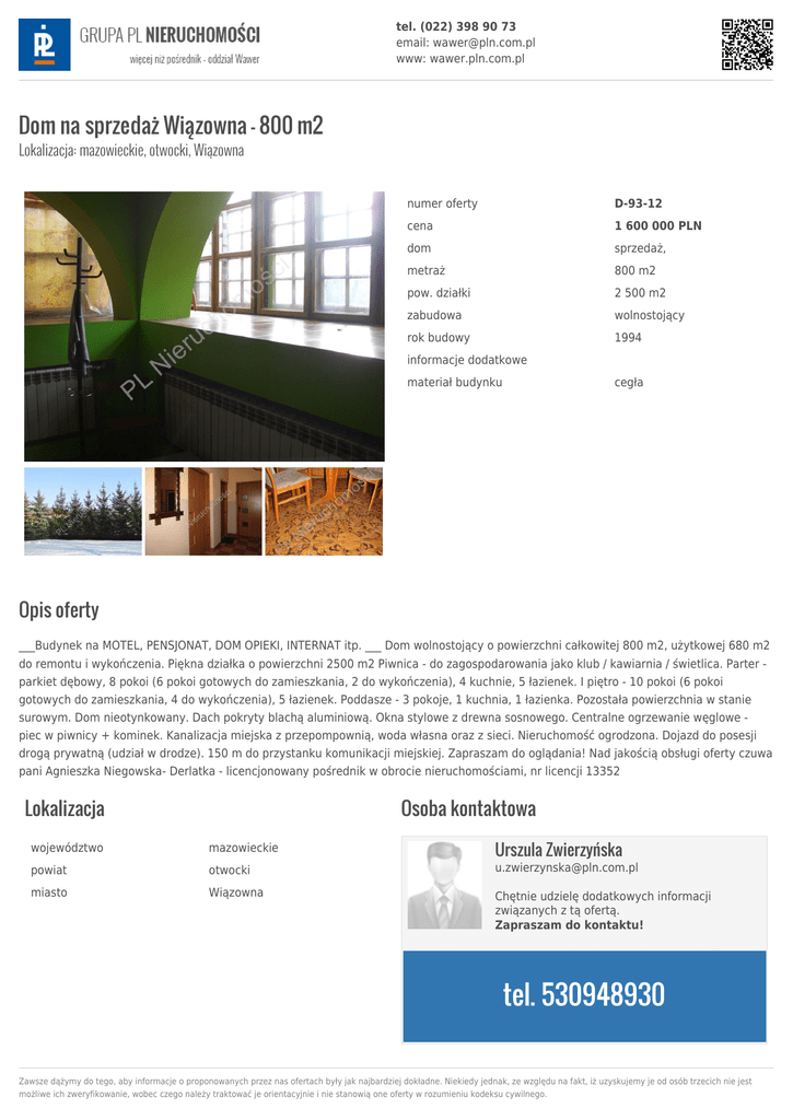 tel. (022) 398 90 73 email: [email protected] www: wawer.pln.com.pl Dom na sprzedaż Wiązowna - 800 m2 Lokalizacja: mazowieckie, otwocki, Wiązowna numer oferty D-93-12 cena 1 600 000 PLN dom sprzedaż, metraż 800 m2 pow. działki 2 500 m2 zabudowa wolnostojący rok budowy 1994 informacje dodatkowe materiał budynku cegła Opis oferty ___Budynek na MOTEL, PENSJONAT, DOM OPIEKI, INTERNAT itp. ___ Dom wolnostojący o powierzchni całkowitej 800 m2, użytkowej 680 m2 do remontu i wykończenia. Piękna działka o powierzchni 2500 m2 Piwnica - do zagospodarowania jako klub / kawiarnia / świetlica. Parter parkiet dębowy, 8 pokoi (6 pokoi gotowych do zamieszkania, 2 do wykończenia), 4 kuchnie, 5 łazienek. I piętro - 10 pokoi (6 pokoi gotowych do zamieszkania, 4 do wykończenia), 5 łazienek. Poddasze - 3 pokoje, 1 kuchnia, 1 łazienka. Pozostała powierzchnia w stanie surowym. Dom nieotynkowany. Dach pokryty blachą aluminiową. Okna stylowe z drewna sosnowego. Centralne ogrzewanie węglowe piec w piwnicy + kominek. Kanalizacja miejska z przepompownią, woda własna oraz z sieci. Nieruchomość ogrodzona. Dojazd do posesji drogą prywatną (udział w drodze). 150 m do przystanku komunikacji miejskiej. Zapraszam do oglądania! Nad jakością obsługi oferty czuwa pani Agnieszka Niegowska- Derlatka - licencjonowany pośrednik w obrocie nieruchomościami, nr licencji 13352 Lokalizacja Osoba kontaktowa Urszula Zwierzyńska województwo mazowieckie powiat otwocki [email protected] miasto Wiązowna Chętnie udzielę dodatkowych informacji związanych z tą ofertą. Zapraszam do kontaktu! tel. 530948930 Zawsze dążymy do tego, aby informacje o proponowanych przez nas ofertach były jak najbardziej dokładne. Niekiedy jednak, ze względu na fakt, iż uzyskujemy je od osób trzecich nie jest możliwe ich zweryfikowanie, wobec czego należy traktować je orientacyjnie i nie stanowią one oferty w rozumieniu kodeksu cywilnego.