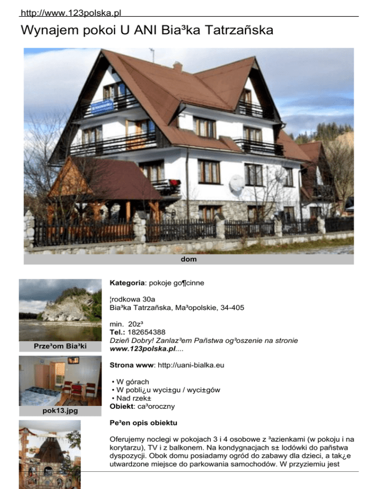http://www.123polska.pl Wynajem pokoi U ANI Bia³ka Tatrzañska dom Kategoria: pokoje go¶cinne ¦rodkowa 30a Bia³ka Tatrzañska, Ma³opolskie, 34-405 Prze³om Bia³ki min. 20z³ Tel.: 182654388 Dzieñ Dobry! Zanlaz³em Pañstwa og³oszenie na stronie www.123polska.pl.... Strona www: http://uani-bialka.eu pok13.jpg • W górach • W pobli¿u wyci±gu / wyci±gów • Nad rzek± Obiekt: ca³oroczny Pe³en opis obiektu Oferujemy noclegi w pokojach 3 i 4 osobowe z ³azienkami (w pokoju i na korytarzu), TV i z balkonem. Na kondygnacjach s± lodówki do pañstwa dyspozycji. Obok domu posiadamy ogród do zabawy dla dzieci, a tak¿e utwardzone miejsce do parkowania samochodów. W przyziemiu jest http://www.123polska.pl kominek sto³ówka i sala z kominkiem, a tak¿e TV sat. Wiêcej informacji mo¿na znale¼æ na naszej stronie Oferowane pokoje: 2-osobowe: 1 pokoi(-je) 3-osobowe: 1 pokoi(-je) 4-osobowe: 3 pokoi(-je) Ca³kowieta ilo¶c miejsc noclegowych: ok. 19 Cena za osobê (w SEZONIE): Cennik: inne Cena od 25z³. zale¿na od pory roku. Wy¿ywienie: • Sto³ówka • Mo¿liwo¶æ zakupu po³ówek ¿ywieniowych Na terenie obiektu: • dostêp do internetu • sala kominkowa • miejsce na ognisko • mo¿liwo¶æ przechowania rowerów • mo¿liwo¶æ przechowania nart • parking W KA¯DYM pokoju apartamencie domku: • ³azienka • czajnik elektryczny • telewizor • balkon • dostêp do internetu Atrakcje turystyczne: Atrakcje Bia³ki Tatrzañskiej to mnóstwo wyci±gów narciarskich(kotelnica bia³czañska),lodowisko,wypo¿yczalnie skuterów ¶nie¿nych.W odleg³o¶ci 8 km s± Termy Bukowiañskie .Doskona³e miejsce na wypad w tatry,gorce ,sp³yw Dunajcem czy zalew czorsztyñski. W pobli¿u: do sklepu: 150 m km do supermarketu / marketu: 1 km szlaki turystyczne: 0,5 km do wyci±gu narciarskiego: 0,7 km stoki sztucznie na¶nie¿ane: 1 km restauracje / kawiarnie / bary: 0,4 km s³u¿by medyczne: 2 km poczta: 2 km bank / bankomat: 1,5 km dworzec / przystanek PKS: 0,2 km dworzec PKP: 16 km