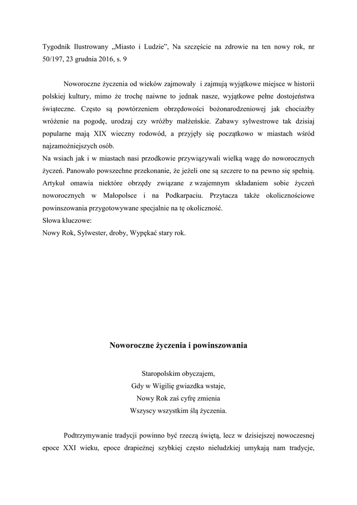Tygodnik Ilustrowany „Miasto i Ludzie”, Na szczęście na zdrowie na ten nowy rok, nr 50/197, 23 grudnia 2016, s. 9 Noworoczne życzenia od wieków zajmowały i zajmują wyjątkowe miejsce w historii polskiej kultury, mimo że trochę naiwne to jednak nasze, wyjątkowe pełne dostojeństwa świąteczne. Często są powtórzeniem obrzędowości bożonarodzeniowej jak chociażby wróżenie na pogodę, urodzaj czy wróżby małżeńskie. Zabawy sylwestrowe tak dzisiaj popularne mają XIX wieczny rodowód, a przyjęły się początkowo w miastach wśród najzamożniejszych osób. Na wsiach jak i w miastach nasi przodkowie przywiązywali wielką wagę do noworocznych życzeń. Panowało powszechne przekonanie, że jeżeli one są szczere to na pewno się spełnią. Artykuł omawia niektóre obrzędy związane z wzajemnym składaniem sobie życzeń noworocznych w Małopolsce i na Podkarpaciu. Przytacza także okolicznościowe powinszowania przygotowywane specjalnie na tę okoliczność. Słowa kluczowe: Nowy Rok, Sylwester, droby, Wypękać stary rok. Noworoczne życzenia i powinszowania Staropolskim obyczajem, Gdy w Wigilię gwiazdka wstaje, Nowy Rok zaś cyfrę zmienia Wszyscy wszystkim ślą życzenia. Podtrzymywanie tradycji powinno być rzeczą świętą, lecz w dzisiejszej nowoczesnej epoce XXI wieku, epoce drapieżnej szybkiej często nieludzkiej umykają nam tradycje, obrzędy, zwyczaje także te związane z sylwestrem i Nowym Rokiem. Od wieków zajmowały one i zajmują wyjątkowe miejsce w historii polskiej kultury, mimo że trochę naiwne to jednak nasze, wyjątkowe pełne dostojeństwa świąteczne. Często są powtórzeniem obrzędowości bożonarodzeniowej jak chociażby wróżenie na pogodę, urodzaj czy wróżby małżeńskie. Zabawy sylwestrowe tak dzisiaj popularne mają XIX wieczny rodowód, a przyjęły się początkowo w miastach wśród najzamożniejszych osób. Na wsiach również w miastach nasi przodkowie przywiązywali wielką wagę do noworocznych życzeń. Panowało powszechne przekonanie, że jeżeli one są szczere to na pewno się spełnią. Istniał i w niektórych regionach nadal istnieje zwyczaj odwiedzania sąsiadów z życzeniami noworocznymi. Tak jest miedzy innymi w okolicach Rzepiennika Strzyżewskiego, Czermnej, Szerzyn, Ciężkowic, Przeworska, Dębicy, Dobrkowa k/Pilzna czy Zagórzan k/Gorlic. Droby, draby dziady noworoczne ruszają z życzeniami tuż po północy w Nowy Rok lub wczesnym rankiem. O drobach z Pogórza pisał już znany kronikarz Franciszek Kotula. „W dzień Nowego Roku już od świtu po niektórych miejscowościach Pogórza biegali droby. Mieli maski na twarzach, byli na ogół fantazyjnie poprzebierani z odwróconymi do góry kożuchami w strojach zrobionych ze słomianych warkoczy”. Dzisiejsi też będą mieli na sobie kożuchy odwrócone futrem do wierzchu, będą przepasani słomianymi powrósłami w spiczastych czapkach splecionych ze słomianych warkoczy. W rękach będą mieli zdobione laski lub powrósła. Czy rozpoczną swój obchód od porannej mszy odprawianej o szóstej rano jak to miało miejsce jeszcze dwadzieścia lat temu w Zagórzanach, czy może zaraz po północy. Jedno jest pewne będą nieśli tradycję. Będą życzyć, ale także psocić. Być może pomalują sadzą okna rozleją w izbie wodę lub rozsypią plewy czy pomalują młode dziewczyny sadzą. Mogą też schować bramę wejściową lub wypuścić bydło z obory. Dziewczyny powinny się cieszyć, że zostały zauważone, a gospodarze nie powinni się gniewać, bo psoty i figle mają uczyć pokory i przypominać o przebaczaniu. „Na szczęście na zdrowie na ten Nowy Rok, żeby wom się urodziła psenicka i grosek, psenicka, jak rekawicka owiewek jak pański piesek, grosek jak wierciosek, żytko jak korytko, ziemniaki jak buraki, buraki jak pnioki, karpiele jak gardziele w każdym kątku po dzieciątku a za piecem siedem”. Życzą też „żeby się darzyło, rodziło, kropiło, pszenica, jarzyca, żytko i wszytko”. Droby z okolic Pilzna deklamują: „Gdzie drob przyjdzie szczęście będzie, krowa się ocieli córka za mąż wyjdzie”. Należy drobów godnie przyjąć gdyż w przeciwnym wypadku można usłyszeć: „Niech wom urośnie stokłosa od d… do nosa niech wom nasro sarna w wasze ziarna”. Życzenia noworoczne składają też poprzebierani za cyganów, cyganki, żydów czy wiejskie baby, a także szczodroki nowoletniki gdyż niosą życzenia na „Nowe Lato”. Po szczodrakach chodziły przeważnie dzieci, które za życzenia dostawały specjalnie na ten cel wypiekane z pszennej mąki bułeczki zwane „szczodrakami”. Jeszcze w połowie XX wieku w okolicach Dębicy „po szczodrakach” chodzili starsi chłopcy lub dorośli kawalerowie przepasani powrósłami w wysokich słomianych czapkach przybranych gałązkami tarniny. Za życzenia dostawali najczęściej owies. Był też zwyczaj, że w dzień Nowego Roku rano gospodarz lub parobek wybierali zza „tragarza” kopy „bite” w wigilię Bożego Narodzenia wywozili je na swoje „stajonka” i wbijali w śnieg. W Nowy Rok ugadywano także pastuchów na nadchodzący rok. Tuż przed północą w Sylwestra chłopcy strzelali z batów by „wypękać” stary rok. Głośno walono w blachy, dzwoniono blaszanymi puszkami również po to by wypędzić stary rok. Podczas pasterki noworocznej odprawianej o północy ksiądz z ambony składał życzenia wiernym, sąsiedzi i przyjaciele składali sobie życzenia nawzajem prześcigujac się w układaniu dowcipnych rymowanek. Do dobrego tonu należało składanie życzeń osobiście, a odbiorca odwzajemniając je powinien zaprosić na noworoczny obiad. Życzenia należało składać według następującej kolejności: dzieci składały życzenia rodzicom, kawalerowie pannom, panowie sługom, bogaci ubogim. Taka sama kolejność obowiązywała przy obdarowywaniu noworocznymi prezentami. O obdarowywaniu noworocznymi podarunkami służby prz