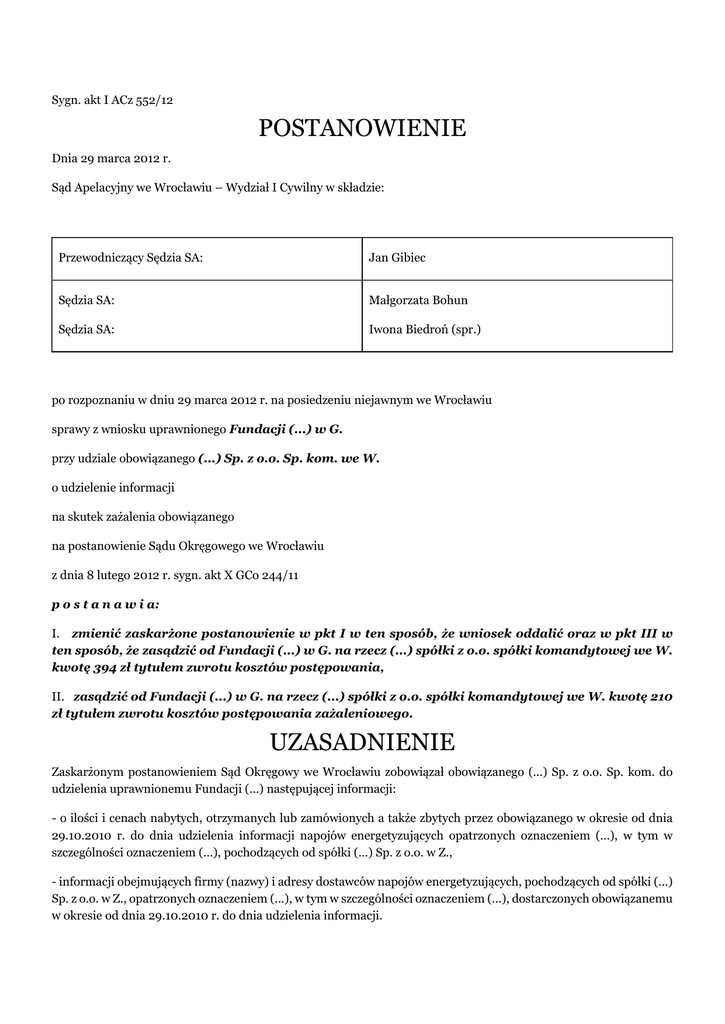 Sygn. akt I ACz 552/12 POSTANOWIENIE Dnia 29 marca 2012 r. Sąd Apelacyjny we Wrocławiu – Wydział I Cywilny w składzie: Przewodniczący Sędzia SA: Jan Gibiec Sędzia SA: Małgorzata Bohun Sędzia SA: Iwona Biedroń (spr.) po rozpoznaniu w dniu 29 marca 2012 r. na posiedzeniu niejawnym we Wrocławiu sprawy z wniosku uprawnionego Fundacji (...) w G. przy udziale obowiązanego (...) Sp. z o.o. Sp. kom. we W. o udzielenie informacji na skutek zażalenia obowiązanego na postanowienie Sądu Okręgowego we Wrocławiu z dnia 8 lutego 2012 r. sygn. akt X GCo 244/11 p o s t a n a w i a: I. zmienić zaskarżone postanowienie w pkt I w ten sposób, że wniosek oddalić oraz w pkt III w ten sposób, że zasądzić od Fundacji (...) w G. na rzecz (...) spółki z o.o. spółki komandytowej we W. kwotę 394 zł tytułem zwrotu kosztów postępowania, II. zasądzić od Fundacji (...) w G. na rzecz (...) spółki z o.o. spółki komandytowej we W. kwotę 210 zł tytułem zwrotu kosztów postępowania zażaleniowego. UZASADNIENIE Zaskarżonym postanowieniem Sąd Okręgowy we Wrocławiu zobowiązał obowiązanego (...) Sp. z o.o. Sp. kom. do udzielenia uprawnionemu Fundacji (...) następującej informacji: - o ilości i cenach nabytych, otrzymanych lub zamówionych a także zbytych przez obowiązanego w okresie od dnia 29.10.2010 r. do dnia udzielenia informacji napojów energetyzujących opatrzonych oznaczeniem (...), w tym w szczególności oznaczeniem (...), pochodzących od spółki (...) Sp. z o.o. w Z., - informacji obejmujących firmy (nazwy) i adresy dostawców napojów energetyzujących, pochodzących od spółki (...) Sp. z o.o. w Z., opatrzonych oznaczeniem (...), w tym w szczególności oznaczeniem (...), dostarczonych obowiązanemu w okresie od dnia 29.10.2010 r. do dnia udzielenia informacji. Sąd Okręgowy nadto oddalił wnioski obowiązanego oraz zasądził od obowiązanego na rzecz uprawnionego kwotę 100 zł tytułem zwrotu kosztów postępowania. Sąd Okręgowy uznał, że norma z art. 296 ust. 1 ustawy z dnia 30 czerwca 2000 r. Prawo własności przemysłowej (dalej pwp) ma zastosowanie do wszystkich naruszeń prawa ochronnego stypizowanych w art. 296 ust. 2 pwp, zaś zgodnie z art. 296 ust. 3 pwp, z roszczeniami o których mowa w art. 296 ust. 1 pwp można wystąpić również przeciwko osobie, która tylko wprowadza do obrotu oznaczone już znakiem towary, jeżeli nie pochodzą od uprawnionego lub od osoby, która miała zezwolenie na używanie znaku. Sąd Okręgowy przyjął, że istnieje wysokie prawdopodobieństwo, że (...) sp. z o.o. w Z., używając do oznaczania napojów energetycznych znaku towarowego (...) narusza przysługujące uprawnionemu prawo ochronne na znak towarowy (...), z uwagi na wystąpienie ryzyka wprowadzenia odbiorców w błąd. W konsekwencji uznał, że obowiązany wprowadzając do obrotu napoje energetyczne opatrzone znakiem (...) przez osobę trzecią, jest podmiotem wobec którego uprawniony może wystąpić z roszczeniami, o których mowa w art. 296 ust. 1 pwp w zw. z art. 296 ust. 2 pkt 2 pwp, a zatem jest legitymowany biernie w postępowaniu uregulowanym przepisami art. 286 (1) ust. 1 pkt 2 pwp i ma obowiązek udzielenia uprawnionemu informacji określonych we wniosku. Dodatkowo Sąd Okręgowy wskazał, że w sprawie nie doszło do wyczerpania prawa ochronnego na znak towarowy w rozumieniu art. 155 pwp. Sąd Okręgowy nie uwzględnił wniosku obowiązanego w zakresie uzależnienia wykonania postanowienia od złożenia przez uprawnionego kaucji oraz wyznaczenia terminu do wniesienia pisma wszczynającego postępowanie, uznając, że w sprawie nie mają zastosowania przepisy art. 739 § 1 k.p.c. oraz art. 733 k.p.c., przyjął również, że brak jest podstaw do wezwania do udziału w sprawie na podstawie art. 84 k.p.c. (...) sp. z o.o. w Z.. W zażaleniu na powyższe postanowienie obowiązany zarzucił: 1. naruszenie art. 229 k.p.c., art. 230 k.p.c. w zw. z art. 286 (1) ust. 1 pkt 2 pwp poprzez uznanie za bezsporny fakt, że obowiązany oferuje w swoich sklepach i wprowadza do obrotu napoje energetyczne opatrzone znakiem (...) wyprodukowane przez (...) sp. z o.o. w Z., 2. naruszenie przepisów prawa materialnego poprzez przyjęcie, że Obowiązany wprowadza do obrotu w rozumieniu art. 296 ust. 3 pwp napoje energetyczne opatrzone znakiem (...) wyprodukowane przez (...) sp. z o.o. w Z.; 3. naruszenie przepisów prawa materialnego poprzez przyjęcie, że art. 286 1 ust. 1 pkt 2 pwp ma zastosowanie do osoby, o której mowa w art. 296 ust. 3 pwp, 4. naruszenie przepisów postępowania ( art. 286 1 ust. 1 pkt 2 pwp) poprzez brak wykazania, iż istnieje wysokie prawdopodobieństwo naruszenia przez obowiązanego prawa ochronnego na znak towarowy (...), 5. naruszenie przepisów prawa materialnego poprzez przyjęcie, że art. 296 ust. 3 kpc odnosi się do sytuacji podobieństwa znaków towarowych, 6. naruszenie przepisów prawa materialnego ( art. 296 ust. 1 i 2 pwp) oraz przepisów postępowania ( art. 286 1 ust. 1 pkt 2 pwp) poprzez przyjęcie, iż zachodzi wysokie prawdopodobieństwo naruszenia przez (...) sp. z o.o. prawa ochronnego na znak towarowy (...), 7. naruszenie art. 286 1 ust. 4 pwp w związku z art. 261 § 2 kpc poprzez nieuwzględnienie złożonego przez obowiązanego oświadczenia o uchyleniu się od obowiązku udzielenia informacji żądanych przez uprawnionego, 8. naruszenie przepisów postępowania poprzez nieusunięcie braków formalnych wniosku uprawnionego, to jest naruszenie art. 130 kpc w związku z art. 13 § 2 kpc w związku z art. 736 § 1 pkt 1 kpc w związku z art. 286 1 ust. 1 pkt 2 pwp, 9. naruszenie przepisów postępowania poprzez brak wyznaczenia kaucji oraz brak wyznaczenia terminu do złożenia powództwa, to jest naruszenie art. 739 § 1 kpc oraz art. 733 kpc w związku z art. 286 1 ust. 1 pkt 2 pwp. W oparciu o powyższe zarzuty obowiązany wniósł o zmianę zaskarżonego postanowienia poprzez oddalenie wniosku uprawn