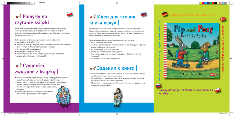 146mm Zanim przeczytasz opowiadanie, przyjrzyj się razem z dzieckiem tytułowej ilustracji i zastanówcie się, co może być fabułą opowiadania. Następnie przeczytaj dziecku opowiadanie poświęcając przy tym dużo czasu na obejrzenie zamieszczonych ilustracji. Прежде чем Вы начнете читать этот рассказ вслух, рассмотрите вместе с Вашим ребенком заглавную страницу и поразмышляйте, о чем в нем может идти речь. Затем прочтите Вашему ребенку рассказ, не жалея времени на то, чтобы обстоятельно рассмотреть картинки. Zadawaj dziecku pytania reagując na jego uwagi i spostrzeżenia: • Jakimi zwierzętami są Pip i Posy? • Jakie jeszcze zwierzęta widać na stronie tytułowej? Czy odnajdujesz zwierzęta także na innych ilustracjach zamieszczonych w książce? • Co zwierzęta robią na placu zabaw? • Dlaczego Pip i Posy sprzeczają się? • Posy skaleczyła się. Na pewno już się kiedyś skaleczyłeś. Jak to było? • Jak pokazać, że chcemy się z kimś pogodzić? Задайте Вашему ребенку вопросы и обсудите с ним его ответы: • Что за животные Пип и Пози? • Какие еще звери изображены на заглавной странице? А на других картинках в книге изображены эти животные? • Что делают звери на детской площадке? • Почему Пип и Пози ссорятся друг с другом? • Пози упала и ударилась. Ты когда-нибудь делал себе больно? Как это случалось? • Как показать, что вы хотите помириться? Czynności związane z książką | • Naśladujcie wspólnie odgłosy i ruchy zwierząt występujących w książce, np. podskakiwanie jak zając, kumkanie jak żaba czy też pisk myszy. • Wykorzystuj treści zamieszczone w książce jako skarbnicę pomysłów na wspólne zabawy z dzieckiem: Podawajcie sobie nawzajem piłkę albo pobawcie się w berka, tak jak to robią w opowiadaniu zwierzęta. • W miejscowej bibliotece możesz wypożyczyć jeszcze wiele innych pięknych opowiadań o przyjaźni. 02Lestart_buchfolder_2014_B_K05-1.indd 5-1 Задания к книге | • Проимитируйте звуки и движения животных из книги: попрыгайте как заяц, квакайте как лягушка и пищите как мышка. • Поиграйте вместе с Вашим ребенком в игры из книги: «Пасуйте себе мяч» или «Поймай меня», как животные в рассказе. • В библиотеке по месту жительства Вы можете найти еще много других интересных рассказов о дружбе. Советы для чтения вслух и рассказов вместе с … Идеи для чтения книги вслух | Tipps zum Vorlesen und Erzählen mit … Okumaya ve anlatmaya ilişkin öneriler … Pomysły na czytanie książki Porady dotyczące czytania i opowiadania z książką … 07.08.14 16:47 146mm Buchinhalt | Pip hat einen tollen Roller, mit dem Posy gerne einmal fahren möchte. Sie schnappt ihn sich einfach und saust davon. Pip ärgert das. Doch als Posy stürzt, eilt Pip ihr schnell zu Hilfe. Kitap içeriği | Pip’in çok güzel bir scooter’ı vardı ve Posy de bu scooter’a bir kez binmek istiyordu. Posy scooter’ı kapar kapmaz hızlıca uzaklaştı. Pip, bu duruma çok kızdı. Fakat Posy düştüğünde Pip ona yardım etmek için hemen yanına koştu. Treść książki | Pip ma świetną hulajnogę, którą Posy chciałaby pojeździć – więc po prostu ją łapie i umyka. Pip gniewa się z tego powodu, ale gdy Posy zalicza upadek, Pip śpieszy jej na pomoc. Содержание книги | У Пипа есть отличный самокат, на котором хочет покататься Пози. Пози просто хватает самокат и вот ее уже и след простыл. Пип обиделся на нее. Но когда Пози падает с самоката, Пип бежит к ней на помощь. Vorlese-Ideen zum Buch | Kitapla ilgili okuma fikirleri | Bevor Sie die Geschichte vorlesen, schauen Sie sich mit Ihrem Kind zusammen das Titelbild an und überlegen Sie, wovon die Geschichte handeln könnte. Lesen Sie Ihrem Kind danach die Geschichte vor und nehmen Sie sich dabei viel Zeit zum Betrachten der Bilder. Kitabı okumaya başlamadan önce, çocuğunuzla kapak resmine bakıp hangi konunun işlendiğini tahmin etmeye çalışın. Ondan sonra hikâyeyi okuyun ve resimlere bakmak için yeterince zaman ayırın. Stellen Sie Ihrem Kind Fragen und gehen Sie auf seine Bemerkungen ein: • Welche Tiere sind Pip und Posy? • Welche Tiere sieht man noch auf der Titelseite? Findest du die Tiere auch auf anderen Bildern im Buch wieder? • Was machen die Tiere auf dem Spielplatz? • Warum haben Pip und Posy Streit miteinander? • Posy hat sich wehgetan. Du hast dir doch auch schon einmal wehgetan. Wie war das? • Wie zeigt man, dass man sich wieder vertragen will? Aktionen zum Buch | • Machen Sie gemeinsam die Geräusche und Bewegungen der Tiere aus dem Buch nach, z. B. hüpfen wie ein Hase, quaken wie ein Frosch und piepsen wie eine Maus. • Greifen Sie Spiel-Ideen aus dem Buch gemeinsam mit Ihrem Kind auf: Rollen Sie sich einen Ball zu oder spielen Sie Fangen, so wie die Tiere in der Geschichte es tun. • In der Bibliothek vor Ort können Sie noch viele weitere schöne Freundschafts-Geschichten ausleihen. Çocuğunuza sorular yöneltin 