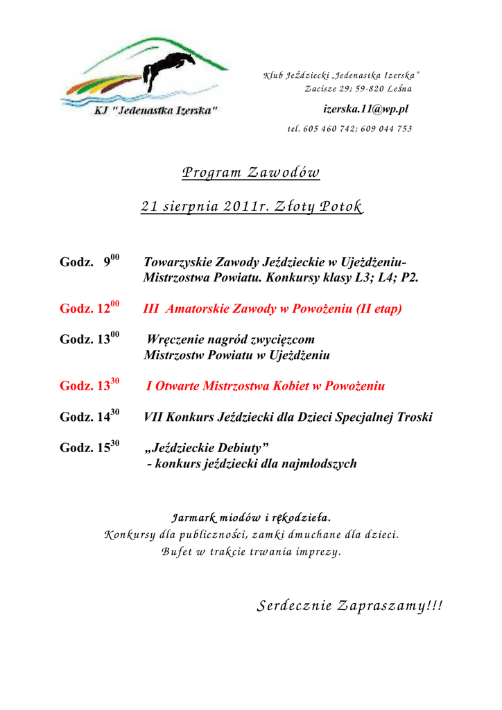K lub Jeździecki „Jedenastka Izerska” Z acisze 29; 59-820 Leśna [email protected] tel. 605 460 742; 609 044 753 Program Z aw odów 21 sierpnia 2011r. Z łoty Potok Godz. 900 Towarzyskie Zawody Jeździeckie w UjeżdżeniuMistrzostwa Powiatu. Konkursy klasy L3; L4; P2. Godz. 1200 III Amatorskie Zawody w Powożeniu (II etap) Godz. 1300 Wręczenie nagród zwycięzcom Mistrzostw Powiatu w Ujeżdżeniu Godz. 1330 I Otwarte Mistrzostwa Kobiet w Powożeniu Godz. 1430 VII Konkurs Jeździecki dla Dzieci Specjalnej Troski Godz. 1530 „Jeździeckie Debiuty” - konkurs jeździecki dla najmłodszych Jarm ark m iodów i rękodzieła r kodzieła. kodzieła . K onkursy dla publiczności, zam ki dm uchane dla dzieci. B ufet w trakcie trw ania im prezy. Serdecznie Z apraszam y!!!