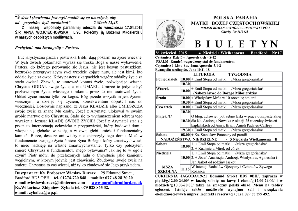 POLSKA PARAFIA MATKI BOŻEJ CZĘSTOCHOWSKIEJ ”Święta i zbawienna jest myśl modlić się za umarłych, aby od grzechów byli uwolnieni” 2 Mach 12,45. Z naszej wspólnoty parafialnej odeszła do wieczności 17.04.2015 Ś.P. ANNA WOJCIECHOWSKA L.96. Polećmy ją Bożemu Miłosierdziu w naszych osobistych modlitwach. POLISH ROMAN CATHOLIC COMMUNITY PCM Charity No 1119423 B I U L E T YN Pochyleni nad Ewangelią – Pasterz. Eucharystyczna pasza i pastwiska Biblii dają pokarm na życie wieczne. W tych dwóch pokarmach wyraża się troska Boga o nasze wybawienie. Pasterz, do którego porównuje się Jezus, nie jest bosym pastuszkiem, beztrosko przygrywającym swej trzodzie kojące nuty, ale jest kimś, kto oddaje życie za owce. Który pasterz z karpackich wzgórz oddałby życie za stado owiec? Zbawić, to uratować komuś życie, poświęcając własne. Chrystus ODDAŁ swoje życie, a nie UMARŁ. Umrzeć to jedynie być pozbawionym życia własnego i nikomu przez to nie uratować życia. Oddać życie można tylko za kogoś. Bóg przede wszystkim jest życiem wiecznym, a dzieląc się życiem, konsekwentnie dopuścił nas do wieczności. Dosłownie napisano, że Jezus KŁADZIE albo UMIESZCZA swoje życie za znane Mu osoby. Józef z Arymatei ulokował w swoim grobie martwe ciało Chrystusa. Stało się to wytłumaczeniem sekretu tego wyrażenia Jezusa: KŁADĘ SWOJE ŻYCIE! Józef z Arymatei stał się przez to interpretacją człowieka z przypowieści, który budował dom i wkopał się głęboko w skałę, a w owej głębi umieścił fundamentalny kamień. Burze, deszcze ani wiatry nie zniszczyły tego domu. Mieć w fundamencie swojego życia śmierć Syna Bożego, który zmartwychwstał, to mieć nadzieję na własne zmartwychwstanie. Tylko czy położyłem śmierć Chrystusa u fundamentów mego bytowania? Jak się to w ogóle czyni? Piotr mówi do przełożonych ludu o Chrystusie jako kamieniu węgielnym, w którym jedynie jest zbawienie. Zbudować swoje życie na śmierci Chrystusa to coś więcej, niż tylko zbudować się Jego przykładem. Duszpasterz: Ks. Proboszcz Wiesław Duracz 29 Edmund Street , Bradford BD5 OBH tel. 01274-720 848 mobile: 077 48 28 20 20 e-mail:[email protected] www.parafiabradford.co.uk Ks.Wikariusz Zbigniew Zybała tel. 079 028 865 32. e-mail: [email protected] 26 kwiecień 2015 4 Niedziela Wielkanocna Bradford Nr.17 Czytanie z Dziejów Apostolskich 4,8-12 PSALM: Kamień wzgardzony stał się fundamentem Czytanie z 1 Listu św. Jana Apostoła 3,1-2 Ewangelia według św. Jana 10,11-18 LITURGIA TYGODNIA Poniedziałek 10.00 + Emil Stopa od matki /Msza gregoriańska/ 10.30 Wtorek + Emil Stopa od matki /Msza gregoriańska/ 10.00 /Nabożeństwo do Bożego Miłosierdzia/ Środa 10.00 + Władysław Mróz w 10 rocznicę śmierci 10.30 + Emil Stopa od matki /Msza gregoriańska/ Czwartek 10.00 + Emil Stopa od matki /Msza gregoriańska/ 10.30 Piątek /1/ O błog. zdrowie i potrzebne łaski w pracy duszpasterskiej 10.30 dla Ks. Andrzeja Nowaka z okazji 25 rocznicy święceń kapłańskich od Anny, Brian, Anieli Padalec-Caffrey 19.30 + Emil Stopa od matki /Msza gregoriańska/ Sobota 08.00 + Ks. Stanisław Potoczny od parafii NABOŻEŃSTWA NIEDZIELNE - 5 Niedziela Wielkanocna B Sobota 1. + Emil Stopa od matki /Msza gregoriańska/ 18.00 2. + Kazimierz Mirek od córek Niedziela 1. + Emil Stopa od matki /Msza gregoriańska/ 10.00 2. + Józef, Anastazja, Andrzej, Władysław, Agnieszka i Jan Jaskot od rodziny Jaskot W intencji Rodaków Ojczyzny i Członków Żywego MSZA 11.15 Różańca SZKOLNA CUKIERNIA JAGODA/19-21 Edmund Street BD5 0BH/, zaprasza w piątki/g.12.00-24.00/ w każdą sobotę na kawę i ciasto/g.12.00-24.00/ i w niedziele/g.10.00-20.00/ także na smaczny polski obiad. Menu na tablicy ogłoszeń. Istnieje także możliwość wynajmu sali i urządzenia okolicznościowych imprez. Kontakt i rezerwacja; Tel. 079 55 399 492. Lektorzy - Sobota 02.05.2015 g.18.00 – Kączkowscy Niedziela 03.05.2015 g. 10.00 - J. Nowicki g.11.15 - Polska Szkoła Dyżur przedstawiciela PRD Sali św. Brata Alberta, sobota i niedziela 02-03.05.2015 – G. Wolny i A. Andryszewski OFIARY Na potrzeby parafii – Cukiernia JAGODA £800; J.Tymczyszyn £10; J. Donarska/remonty/ £40. Na kwiaty – £ Taca dla parafii – 19.04.2015 - £ Gift Aid 22.03.2015 - £ 311 Jeżeli ktoś z Parafian pragnie złożyć ofiarę czekiem/na dowolny cel parafialny/, prosimy go wypisać na –P.C.M. BRADFORD. Zwracamy się w imieniu Parafialnej Rady Duszpasterskiej do wszystkich Parafian z serdeczną prośbą o złożenie raz w roku minimalnej sumy £ 30 na potrzeby naszej parafii. Wszystkim ofiarodawcom składamy serdeczne podziękowanie za złożone ofiary na nasze cele parafialne. Bóg zapłać. *** OGŁOSZENIA DUSZPASTERSKIE *** 1. Dziś – czwarta niedziela Wielkanocy, nazywana niedzielą Dobrego Pasterza ze względu na proklamowaną w tę niedzielę perykopę ewangeliczną o Chrystusie Dobrym Pasterzu. Podczas Mszy Świętej modliliśmy się o powołania do służby Bogu w Kościele i podobnie będziemy czynić w najbliższym tygodniu z racji obchodzonego dziś 52. Światowego Dnia Modlitw o Powołania, rozpoczynającego okresowe dni modlitw o powołania w Kościele powszechnym, a w naszej Ojczyźnie – Tydzień Modlitw o Powołania. 2. Dzisiejsza – ostatnia niedziela kwietnia – jest również dniem modlitwy za kierowców. Jest to inicjatywa polskiego oddziału Stowarzyszenia na rzecz misyjnych środków transportu, w skrócie MIVA Polska. To stowarzyszenie zachęca kierowców do składania ofiar w wysokości jednego grosza za każdy szczęśliwie przejechany kilometr na środki transportu dla misjonarzy. 3. W środę będziemy obchodzić święto św. Katarzyny Sieneńskiej, dziewicy i doktora Kościoła, patronki Europy. 4. W piątek po Mszy Świętej o g.10.30 rozpoczniemy nabożeństwa majowe. Jako Polacy mamy szczególne zobowiązanie do oddawania czci Matce Bożej, dlatego zachęcamy paraf