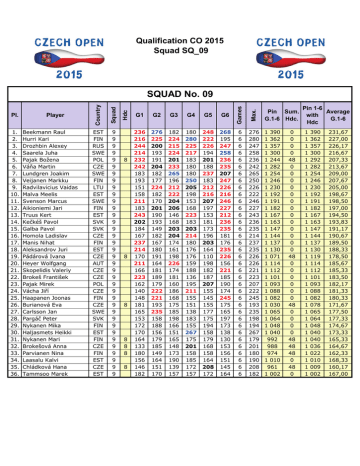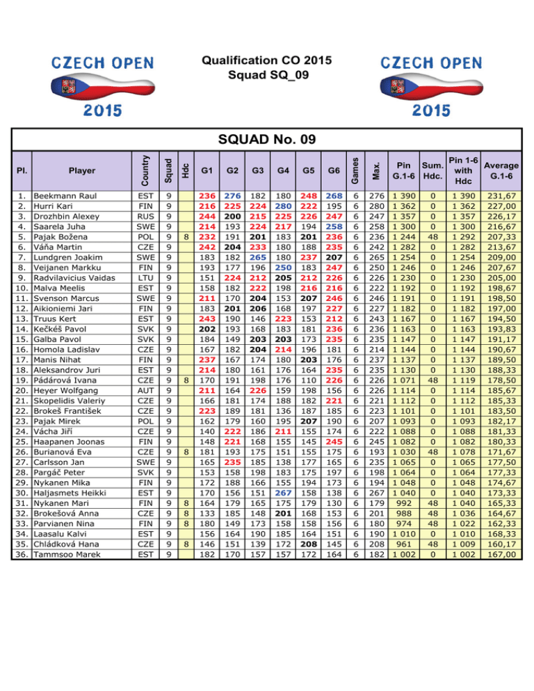 Qualification CO 2015 Squad SQ_09 9 9 9 9 9 9 9 9 9 9 9 9 9 9 9 9 9 9 9 9 9 9 9 9 9 9 9 9 9 9 9 9 9 9 9 9 Hdc EST FIN RUS SWE POL CZE SWE FIN LTU EST SWE FIN EST SVK SVK CZE FIN EST CZE AUT CZE CZE POL CZE FIN CZE SWE SVK FIN EST FIN CZE FIN EST CZE EST 8 8 8 8 8 8 8 G2 G3 G4 G5 G6 Max. Beekmann Raul Hurri Kari Drozhbin Alexey Saarela Juha Pajak Božena Váňa Martin Lundgren Joakim Veijanen Markku Radvilavicius Vaidas Malva Meelis Svenson Marcus Aikioniemi Jari Truus Kert Kečkéš Pavol Galba Pavol Homola Ladislav Manis Nihat Aleksandrov Juri Pádárová Ivana Heyer Wolfgang Skopelidis Valeriy Brokeš František Pajak Mirek Vácha Jiří Haapanen Joonas Burianová Eva Carlsson Jan Pargáč Peter Nykanen Mika Haljasmets Heikki Nykanen Mari Brokešová Anna Parvianen Nina Laasalu Kalvi Chládková Hana Tammsoo Marek G1 Games 1. 2. 3. 4. 5. 6. 7. 8. 9. 10. 11. 12. 13. 14. 15. 16. 17. 18. 19. 20. 21. 22. 23. 24. 25. 26. 27. 28. 29. 30. 31. 32. 33. 34. 35. 36. Player Squad Pl. Country SQUAD No. 09 Pin Sum. G.1-6 Hdc. 236 216 244 214 232 242 183 193 151 158 211 183 243 202 184 167 237 214 170 211 166 223 162 140 148 181 165 153 172 170 164 133 180 156 146 182 276 225 200 193 191 204 182 177 224 182 170 201 190 193 149 182 167 180 191 164 181 189 179 222 221 193 235 158 188 156 179 185 149 164 151 170 182 224 215 224 201 233 265 196 212 222 204 206 146 168 203 204 174 161 198 226 174 181 160 186 168 175 185 198 166 151 165 148 173 190 139 157 180 280 225 217 183 180 180 250 205 198 153 168 223 183 203 214 180 176 176 159 188 136 195 211 155 151 138 183 155 267 175 201 158 185 172 157 248 222 226 194 201 188 237 183 212 216 207 197 153 181 173 196 203 164 110 198 182 187 207 155 145 155 177 175 194 158 179 168 158 164 208 172 268 195 247 258 236 235 207 247 226 216 246 227 212 236 235 181 176 235 226 156 221 185 190 174 245 175 165 197 173 138 130 153 156 151 145 164 6 6 6 6 6 6 6 6 6 6 6 6 6 6 6 6 6 6 6 6 6 6 6 6 6 6 6 6 6 6 6 6 6 6 6 6 276 280 247 258 236 242 265 250 226 222 246 227 243 236 235 214 237 235 226 226 221 223 207 222 245 193 235 198 194 267 179 201 180 190 208 182 1 390 1 362 1 357 1 300 1 244 1 282 1 254 1 246 1 230 1 192 1 191 1 182 1 167 1 163 1 147 1 144 1 137 1 130 1 071 1 114 1 112 1 101 1 093 1 088 1 082 1 030 1 065 1 064 1 048 1 040 992 988 974 1 010 961 1 002 0 0 0 0 48 0 0 0 0 0 0 0 0 0 0 0 0 0 48 0 0 0 0 0 0 48 0 0 0 0 48 48 48 0 48 0 Pin 1-6 Average with G.1-6 Hdc 1 1 1 1 1 1 1 1 1 1 1 1 1 1 1 1 1 1 1 1 1 1 1 1 1 1 1 1 1 1 1 1 1 1 1 1 390 362 357 300 292 282 254 246 230 192 191 182 167 163 147 144 137 130 119 114 112 101 093 088 082 078 065 064 048 040 040 036 022 010 009 002 231,67 227,00 226,17 216,67 207,33 213,67 209,00 207,67 205,00 198,67 198,50 197,00 194,50 193,83 191,17 190,67 189,50 188,33 178,50 185,67 185,33 183,50 182,17 181,33 180,33 171,67 177,50 177,33 174,67 173,33 165,33 164,67 162,33 168,33 160,17 167,00
