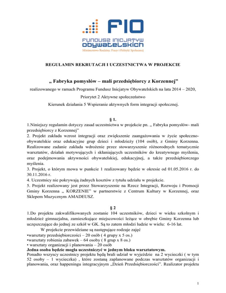 REGULAMIN REKRUTACJI I UCZESTNICTWA W PROJEKCIE „ Fabryka pomysłów – mali przedsiębiorcy z Korzennej” realizowanego w ramach Programu Fundusz Inicjatyw Obywatelskich na lata 2014 – 2020, Priorytet 2 Aktywne społeczeństwo Kierunek działania 5 Wspieranie aktywnych form integracji społecznej. § 1. 1.Niniejszy regulamin dotyczy zasad uczestnictwa w projekcie pn. „ Fabryka pomysłów- mali przedsiębiorcy z Korzennej” 2. Projekt zakłada wzrost integracji oraz zwiększenie zaangażowania w życie społecznoobywatelskie oraz edukacyjne grup dzieci i młodzieży (104 osób), z Gminy Korzenna. Realizowane zadanie zakłada wdrożenie przez stowarzyszenie różnorodnych tematycznie warsztatów, działań motywujących i skłaniających uczestników do kreatywnego myślenia, oraz podejmowania aktywności obywatelskiej, edukacyjnej, a także przedsiębiorczego myślenia. 3. Projekt, o którym mowa w punkcie 1 realizowany będzie w okresie od 01.05.2016 r. do 30.11.2016 r. 4. Uczestnicy nie pokrywają żadnych kosztów z tytułu udziału w projekcie. 5. Projekt realizowany jest przez Stowarzyszenie na Rzecz Integracji, Rozwoju i Promocji Gminy Korzenna „ KORZENIE” w partnerstwie z Centrum Kultury w Korzennej, oraz Sklepem Muzycznym AMADEUSZ. §2 1.Do projektu zakwalifikowanych zostanie 104 uczestników, dzieci w wieku szkolnym i młodzież gimnazjalna, zamieszkujące miejscowości leżące w obrębie Gminy Korzenna lub uczęszczające do jednej ze szkół w GK. Są to zatem młodzi ludzie w wielu: 6-16 lat. W projekcie przewidziane są następujące rodzaje zajęć •warsztaty przedsiębiorczości – 20 osób ( 4 grupy x 5 os.) •warsztaty robienia zabawek – 64 osoby ( 8 grup x 8 os.) • warsztaty organizacji i planowania – 20 osób Jedna osoba będzie mogła uczestniczyć w jednym bloku warsztatowym. Ponadto wszyscy uczestnicy projektu będą brali udział w wyjeździe na 2 wycieczki ( w tym 52 osoby – 1 wycieczka) , które zostaną zaplanowane podczas warsztatów organizacji i planowania, oraz happeningu integracyjnym „Dzień Przedsiębiorczości”. Realizator projektu 1 zapewnia ubezpieczenie uczestników w czasie trwania projektu, catering oraz wszelkie potrzebne materiały . 2. Osoby zainteresowane uczestnictwem w projekcie składają poprawnie wypełniony Formularz zgłoszeniowy- zgoda na uczestnictwo w projekcie (w przypadku osób niepełnoletnich formularz podpisuje rodzic/ opiekun prawny). 2. Formularz zgłoszeniowy można pobrać na stronach internetowych : www.korzenie.org.pl, www.kozenna.pl §3 Dokumenty rekrutacyjne przyjmowane będą w okresie od 11.05.2016r do 27.05.2016 r. w godzinach 08.00 – 15.00. w biurze projektu Centrum Kultury w Korzennej ( Dwór ) oraz 29.05.2016 r, na stoisku promocyjnym, podczas Gminnego Dnia Rodziny w Koniuszowej. §4 Weryfikacji kwalifikowalności Beneficjentów dokona Zespół Rekrutacyjny w składzie: Koordynator Projektu oraz członek Zarządu Stowarzyszenia „ KORZENIE” §5 1. Do udziału w projekcie mogą zostać zakwalifikowane osoby, które spełnią kryterium formalne: Dzieci w wieku szkoły podstawowej lub gimnazjalnym zamieszkujące w jednej z miejscowości w Gminie Korzenna, lub uczęszczające do jednej ze szkół w GK. 2. Formularze zgłoszeniowe – zgody na uczestnictwo w projekcie wypełnione niepoprawnie, zawierające braki lub złożone po terminie rekrutacji nie będą rozpatrywane. §6 Po spełnieniu wymogów formalnych w procesie rekrutacji zastosowany zostanie system preferencji polegający na przyznaniu punktów za przynależność do następujących grup: a) - dzieci pochodzące z rodzin korzystających z pomocy Ośrodka Pomocy Społecznej w Korzennej /1 pkt/ b) - dzieci z rodzin, których głównym źródłem dochodu jest gospodarstwo rolne / 1 pkt/ c) - dzieci z rodzin wielodzietnych (3 i więcej dzieci) / 1pkt/ W przypadku „remisu” punktowego lub braku miejsc o kolejności przyjęć decyduje data zgłoszenia do projektu. 3. Lista osób rezerwowych zostanie utworzona z uczestników rekrutacji, którzy z powodu wyczerpania limitu miejsc nie zakwalifikowali się do udziału w projekcie, będą oni włączeni 2 do projektu w przypadku rezygnacji lub niespełnienia warunków przez osoby wcześniej zakwalifikowane. §7 1. Beneficjenci Ostateczni zostaną wyłonieni przez Zespół Rekrutacyjny w dniu 30.05.2016 r. 2. Osoby zakwalifikowane do projektu o swoim statusie zostaną powiadomione telefonicznie. 3. Możliwe jest zakwalifikowanie nieznacznie wyższej liczby Beneficjentów, nie może to jednak powodować obniżenia jakość świadczonych zajęć oraz nie może generować dodatkowych kosztów. §8 Wszelkie dane osobowe przekazywane Stowarzyszeniu „ KORZENIE” i Centrum Kultury w Korzennej w procesie rekrutacji są chronione prawem i wykorzystywane jedynie w celach realizacji Programu Fundusz Inicjatyw Obywatelskich. §9 1. Uczestnik projektu zobowiązuje się (w imieniu niepełnoletnich jego prawni opiekunowie) regularnie uczestniczyć w oferowanym wsparciu, a powody absencji mogą być jedynie wyjątkowe: obiektywnie uzasadniona sytuacja rodzinna oraz choroba. 2. Koszt dojazdu uczestnik projektu do/z miejsca realizacji warsztatów (w imieniu niepełnoletnich jego prawni opiekunowie) zobowiązuje się pokryć we własnym zakresie. § 10 Beneficjenci projektu mają obowiązek wypełniania ankiet oraz dokumentowania swojego udziału w projekcie (podpisy na listach obecności, potwierdzeniach odbioru itp.) § 11 Regulamin rekrutacji wchodzi w życie z dniem podpisania. Koordynator projektu /-/ Kinga Łukasik 3
