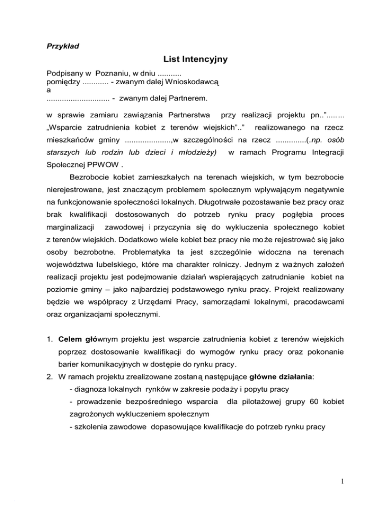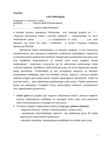 Przykład List Intencyjny Podpisany w Poznaniu, w dniu ........... pomiędzy ............ - zwanym dalej Wnioskodawcą a ............................. - zwanym dalej Partnerem. w sprawie zamiaru zawiązania Partnerstwa przy realizacji projektu pn..”........ „Wsparcie zatrudnienia kobiet z terenów wiejskich”..” realizowanego na rzecz mieszkańców gminy .....................,w szczególności na rzecz ..............(.np. osób starszych lub rodzin lub dzieci i młodzieży) w ramach Programu Integracji Społecznej PPWOW . Bezrobocie kobiet zamieszkałych na terenach wiejskich, w tym bezrobocie nierejestrowane, jest znaczącym problemem społecznym wpływającym negatywnie na funkcjonowanie społeczności lokalnych. Długotrwałe pozostawanie bez pracy oraz brak kwalifikacji marginalizacji dostosowanych do potrzeb rynku pracy pogłębia proces zawodowej i przyczynia się do wykluczenia społecznego kobiet z terenów wiejskich. Dodatkowo wiele kobiet bez pracy nie mo że rejestrować się jako osoby bezrobotne. Problematyka ta jest szczególnie widoczna na terenach województwa lubelskiego, które ma charakter rolniczy. Jednym z ważnych założeń realizacji projektu jest podejmowanie działań wspierających zatrudnianie kobiet na poziomie gminy – jako najbardziej podstawowego rynku pracy. Projekt realizowany będzie we współpracy z Urzędami Pracy, samorządami lokalnymi, pracodawcami oraz organizacjami społecznymi. 1. Celem głównym projektu jest wsparcie zatrudnienia kobiet z terenów wiejskich poprzez dostosowanie kwalifikacji do wymogów rynku pracy oraz pokonanie barier komunikacyjnych w dostępie do rynku pracy. 2. W ramach projektu zrealizowane zostaną następujące główne działania: - diagnoza lokalnych rynków w zakresie podaży i popytu pracy - prowadzenie bezpośredniego wsparcia dla pilotażowej grupy 60 kobiet zagrożonych wykluczeniem społecznym - szkolenia zawodowe dopasowujące kwalifikacje do potrzeb rynku pracy 1 - wsparcie komunikacyjne (dostęp do Internetu, kurs prawa jazdy, dojazd do pracodawcy) w zakresie przeciwdziałania wykluczeniu w dostępie do rynku pracy. 3. Wnioskodawca merytorycznych zobowiązuje projektu, się do zapewnienie w szczególności realizacji organizacji i zadań finansowania doradztwa zawodowego, szkoleń aktywizujących i zawodowych. 4. Partner projektu zobowiązuje się do pomocy przy rekrutacji beneficjentek z terenów wiejskich, przekazywania informacji o projekcie w środowiskach lokalnych oraz do współpracy w zakresie aktywizacji lokalnej na rzecz wspierania zatrudnienia oraz do zapewnienia niezbędnych pomieszczeń do realizacji działań projektu (sala na szkolenia, warsztaty, doradztwo). 5. Wnioskodawca zapewni kadrę do zarządzania projektem w tym finansami projektu oraz do realizacji zadań merytorycznych. 6. W przypadku otrzymania dofinansowania na realizację projektu Wnioskodawca i Partner zobowiązują się do zawarcia Umowy Partnerskiej w zakresie współpracy przy realizacji projektu. Wnioskodawca Partner 2