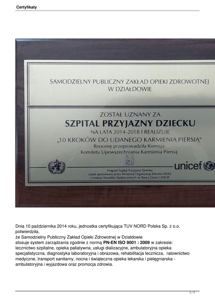 Certyfikaty Dnia 10 października 2014 roku, jednostka certyfikująca TUV NORD Polska Sp. z o.o. potwierdziła, że Samodzielny Publiczny Zakład Opieki Zdrowotnej w Działdowie stosuje system zarządzania zgodnie z normą PN-EN ISO 9001 : 2009 w zakresie: lecznictwo szpitalne, opieka paliatywna, usługi dializacyjne, ambulatoryjna opieka specjalistyczna, diagnostyka laboratoryjna i obrazowa, rehabilitacja lecznicza, ratownictwo medyczne, transport sanitarny, nocna i świąteczna opieka lekarska i pielęgniarska ambulatoryjna i wyjazdowa oraz promocja zdrowia. 1/7 Certyfikaty Dnia 11 listopada 2011 roku, jednostka certyfikująca TUV NORD Polska Sp.normy zpromocja o.o. potwierdziła, że Samodzielny Publiczny Zakład Opieki Zdrowotnej w spełnienie Działdowie wprowadził i stosuje system zarządzania jakością w opieka zakresie: lecznictwo laboratoryjna szpitalne, i przeprowadzonego obrazowa, specjalistyczna rehabilitacja ambulatoryjna lecznicza, ratownictwo zdrowotna, medyczne diagnostyka oraz zdrowia. Na podstawie auditu potwierdzono wymagań 9001 : 2009 PN-EN ISO Dnia Veritas 14 Certification grudnia zaświadczyła, roku, pozgodny przeprowadzeniu procedury Bureau że System Zarządzania Samodzielnego Publicznego Zakładu Opieki Zdrowotnej w Działdowie został oceniony i2010 uznany jako zI OBRAZOWA, wymaganiami normyrecertyfikacyjnej, ISO 9001 : 2008grupa w zakresach: LECZNICTWO SZPITALNE, AMBULATORYJNA OPIEKA SPECJALISTYCZNA, DIAGNOSTYKA LABORATORYJNA RATOWNICTWO MEDYCZNE 2/7 Certyfikaty W Certification roku 2008, zaświadczyła, poSZPITALNE, procedury recertyfikacyjnej, grupa Bureau że System Zarządzania Samodzielnego Publicznego Zakładu Opieki Zdrowotnej w Działdowie został oceniony i przeprowadzeniu uznany jako zgodny zI OBRAZOWA, wymaganiami normy ISO 9001 : 2000Veritas w zakresie usług: LECZNICTWO AMBULATORYJNA OPIEKA SPECJALISTYCZNA, DIAGNOSTYKA LABORATORYJNA RATOWNICTWO MEDYCZNE 3/7 Certyfikaty Certyfikat przyznano 12 listopada 2008 roku. Dnia 26ISO października 2005 roku Samodzielny Publiczny Opieki w Działdowie otrzymał certyfikat zaświadczający, że System Zarządzania Naszej Placówki został ocenionyZakład i uznany jakoZdrowotnej zgodny z wymaganiami normy 9001SZPITALNE :OBRAZOWA 2000 w zakresach: LECZNICTWO AMBULATORYJNA OPIEKA SPECJALISTYCZNA LABORATORYJNA DIAGNOSTYKA 4/7 Certyfikaty TYTUŁY Dnia 24 czerwca 1998 roku Szpital w Działdowie otrzymał tytuł UNICEF I WHO "Szpital Przyjazny Dziecku" przyznany przez Polski Komitet Funduszu Narodów Zjednoczonych na Rzecz Dzieci UNICEF W dniu 17 grudnia 2009 roku, po reocenie działdowskiego Szpitala Zarząd Komitetu Upowszechniania Karmienia Piersią 5/7 Certyfikaty przyznał Nam prawo do dalszego używania tytułu WHO i UNICEF "Szpitala Przyjaznego Dziecku" 28 maja otrzymaliśmy oficjalny list gratulacyjny od Dyrektora Generalnego UNICEF Polska PATRONAT 6/7 Certyfikaty W roku 2004, na wniosek Zarządu Fundacji Polskiej Kawalerów Maltańskich w Warszawie, Jego Ekscelencja Hrabia Juliusz Ostrowski podjął decyzję o nadaniu "Patronatu Honorowego" Samodzielnemu Publicznemu Zakładowi Opieki Zdrowotnej w Działdowie 7/7