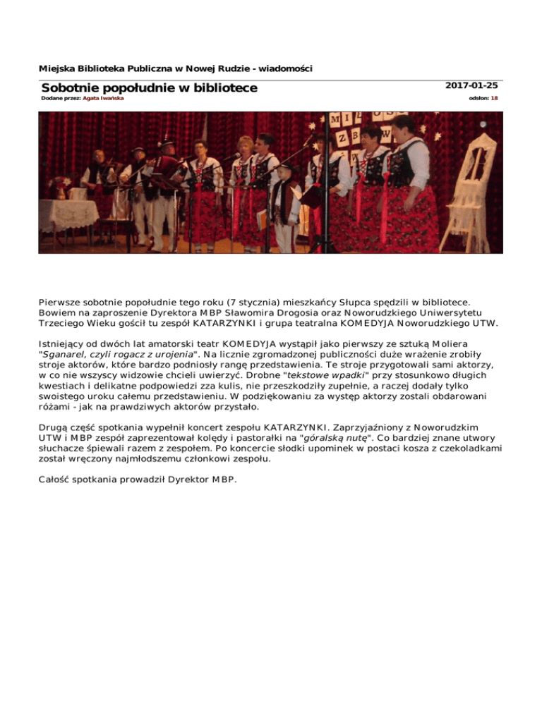 Miejska Biblioteka Publiczna w Nowej Rudzie - wiadomości Sobotnie popołudnie w bibliotece Dodane przez: Agata Iwańska 2017-01-25 odsłon: 18 Pierwsze sobotnie popołudnie tego roku (7 stycznia) mieszkańcy Słupca spędzili w bibliotece. Bowiem na zaproszenie Dyrektora MBP Sławomira Drogosia oraz Noworudzkiego Uniwersytetu Trzeciego Wieku gościł tu zespół KATARZYNKI i grupa teatralna KOMEDYJA Noworudzkiego UTW. Istniejący od dwóch lat amatorski teatr KOMEDYJA wystąpił jako pierwszy ze sztuką Moliera "Sganarel, czyli rogacz z urojenia". Na licznie zgromadzonej publiczności duże wrażenie zrobiły stroje aktorów, które bardzo podniosły rangę przedstawienia. Te stroje przygotowali sami aktorzy, w co nie wszyscy widzowie chcieli uwierzyć. Drobne "tekstowe wpadki" przy stosunkowo długich kwestiach i delikatne podpowiedzi zza kulis, nie przeszkodziły zupełnie, a raczej dodały tylko swoistego uroku całemu przedstawieniu. W podziękowaniu za występ aktorzy zostali obdarowani różami - jak na prawdziwych aktorów przystało. Drugą część spotkania wypełnił koncert zespołu KATARZYNKI. Zaprzyjaźniony z Noworudzkim UTW i MBP zespół zaprezentował kolędy i pastorałki na "góralską nutę". Co bardziej znane utwory słuchacze śpiewali razem z zespołem. Po koncercie słodki upominek w postaci kosza z czekoladkami został wręczony najmłodszemu członkowi zespołu. Całość spotkania prowadził Dyrektor MBP. Powered by TCPDF (www.tcpdf.org)