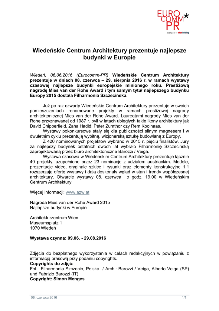 Wiedeńskie Centrum Architektury prezentuje najlepsze budynki w Europie Wiedeń, 06.06.2016 (Eurocomm-PR) Wiedeńskie Centrum Architektury prezentuje w dniach 08. czerwca – 29. sierpnia 2016 r. w ramach wystawy czasowej najlepsze budynki europejskie minionego roku. Prestiżową nagrodę Mies van der Rohe Award i tym samym tytuł najlepszego budynku Europy 2015 dostała Filharmonia Szczecińska. Już po raz czwarty Wiedeńskie Centrum Architektury prezentuje w swoich pomieszczeniach renomowane projekty w ramach prestiżowej nagrody architektonicznej Mies van der Rohe Award. Laureatami nagrody Mies van der Rohe przyznawanej od 1987 r. byli w latach ubiegłych takie ikony architektury jak David Chipperfield, Zaha Hadid, Peter Zumthor czy Rem Koolhaas. Wystawy pokonkursowe stały się dla publiczności silnym magnesem i w dwuletnim cyklu prezentują wybitną, wizjonerską sztukę budowlaną z Europy. Z 420 nominowanych projektów wybrano w 2015 r. pięciu finalistów. Jury za najlepszy budynek ostatnich dwóch lat wybrało Filharmonię Szczecińską zaprojektowaną przez biuro architektoniczne Barozzi / Veiga. Wystawa czasowa w Wiedeńskim Centrum Architektury prezentuje łącznie 40 projekty, uzupełnione przez 23 nominacje z udziałem austriackim. Modele, prezentacje video, oryginale szkice i rysunki oraz elementy konstrukcyjne 1:1 rozszerzają ofertę wystawy i dają doskonały wgląd w stan i trendy współczesnej architektury. Otwarcie wystawy 08. czerwca o godz. 19.00 w Wiedeńskim Centrum Architektury. Więcej informacji: www.azw.at Nagroda Mies van der Rohe Award 2015 Najlepsze budynki w Europie Architekturzentrum Wien Museumsplatz 1 1070 Wiedeń Wystawa czynna: 09.06. - 29.08.2016 Zdjęcia do bezpłatnego wykorzystania w celach redakcyjnych w powiązaniu z informacją prasową przy podaniu copyrights. Copyrights do zdjęć: Fot. Filharmonia Szczecin, Polska / Arch.: Barozzi / Veiga, Alberto Veiga (SP) und Fabrizio Barozzi (IT) Copyright: Simon Menges 06. czerwca 2016 1/1