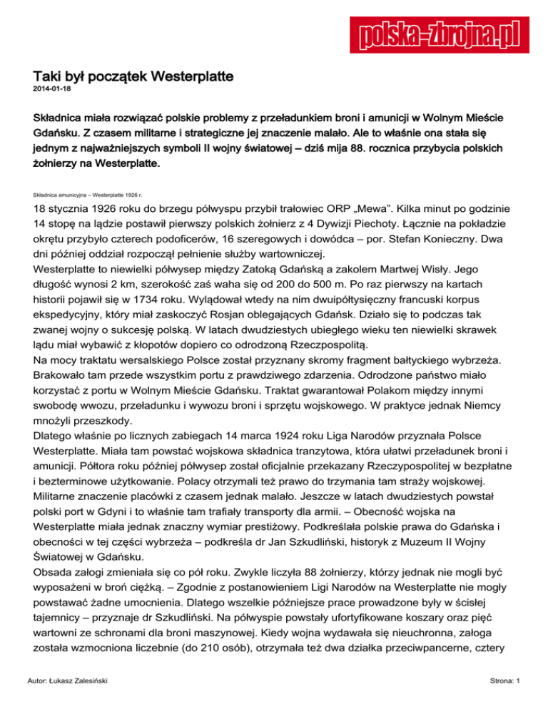 Taki był początek Westerplatte 2014-01-18 Składnica miała rozwiązać polskie problemy z przeładunkiem broni i amunicji w Wolnym Mieście Gdańsku. Z czasem militarne i strategiczne jej znaczenie malało. Ale to właśnie ona stała się jednym z najważniejszych symboli II wojny światowej – dziś mija 88. rocznica przybycia polskich żołnierzy na Westerplatte. Składnica amunicyjna – Westerplatte 1926 r. 18 stycznia 1926 roku do brzegu półwyspu przybił trałowiec ORP „Mewa”. Kilka minut po godzinie 14 stopę na lądzie postawił pierwszy polskich żołnierz z 4 Dywizji Piechoty. Łącznie na pokładzie okrętu przybyło czterech podoficerów, 16 szeregowych i dowódca – por. Stefan Konieczny. Dwa dni później oddział rozpoczął pełnienie służby wartowniczej. Westerplatte to niewielki półwysep między Zatoką Gdańską a zakolem Martwej Wisły. Jego długość wynosi 2 km, szerokość zaś waha się od 200 do 500 m. Po raz pierwszy na kartach historii pojawił się w 1734 roku. Wylądował wtedy na nim dwuipółtysięczny francuski korpus ekspedycyjny, który miał zaskoczyć Rosjan oblegających Gdańsk. Działo się to podczas tak zwanej wojny o sukcesję polską. W latach dwudziestych ubiegłego wieku ten niewielki skrawek lądu miał wybawić z kłopotów dopiero co odrodzoną Rzeczpospolitą. Na mocy traktatu wersalskiego Polsce został przyznany skromy fragment bałtyckiego wybrzeża. Brakowało tam przede wszystkim portu z prawdziwego zdarzenia. Odrodzone państwo miało korzystać z portu w Wolnym Mieście Gdańsku. Traktat gwarantował Polakom między innymi swobodę wwozu, przeładunku i wywozu broni i sprzętu wojskowego. W praktyce jednak Niemcy mnożyli przeszkody. Dlatego właśnie po licznych zabiegach 14 marca 1924 roku Liga Narodów przyznała Polsce Westerplatte. Miała tam powstać wojskowa składnica tranzytowa, która ułatwi przeładunek broni i amunicji. Półtora roku później półwysep został oficjalnie przekazany Rzeczypospolitej w bezpłatne i bezterminowe użytkowanie. Polacy otrzymali też prawo do trzymania tam straży wojskowej. Militarne znaczenie placówki z czasem jednak malało. Jeszcze w latach dwudziestych powstał polski port w Gdyni i to właśnie tam trafiały transporty dla armii. – Obecność wojska na Westerplatte miała jednak znaczny wymiar prestiżowy. Podkreślała polskie prawa do Gdańska i obecności w tej części wybrzeża – podkreśla dr Jan Szkudliński, historyk z Muzeum II Wojny Światowej w Gdańsku. Obsada załogi zmieniała się co pół roku. Zwykle liczyła 88 żołnierzy, którzy jednak nie mogli być wyposażeni w broń ciężką. – Zgodnie z postanowieniem Ligi Narodów na Westerplatte nie mogły powstawać żadne umocnienia. Dlatego wszelkie późniejsze prace prowadzone były w ścisłej tajemnicy – przyznaje dr Szkudliński. Na półwyspie powstały ufortyfikowane koszary oraz pięć wartowni ze schronami dla broni maszynowej. Kiedy wojna wydawała się nieuchronna, załoga została wzmocniona liczebnie (do 210 osób), otrzymała też dwa działka przeciwpancerne, cztery Autor: Łukasz Zalesiński Strona: 1 moździerze i armatę polową. – W myśl pierwotnych założeń żołnierze byli przygotowywani do odparcia ewentualnego ataku od strony Gdańska. Mógłby on nastąpić po puczu, jaki mieli przeprowadzić tamtejsi Niemcy – podkreśla kmdr ppor. Sebastian Draga z Fundacji Invenire Salvum zajmującej się między innymi badaniem dziejów Westerplatte oraz organizowaniem tam rekonstrukcji historycznych. Plan zakładał, że w takim przypadku w ciągu sześciu–dwunastu godzin wojsko pospieszy na pomoc składnicy od strony lądu bądź morza. Tuż przed wybuchem wojny plany zostały jednak zweryfikowane. W dodatku półwysep zaatakowało regularne wojsko i to z ogromną siłą. 1 września 1939 roku o świcie placówka została ostrzelana przez pancernik „Schleswig-Holstein”. Od strony lądu szturm na nią przypuściła kompania Kriegsmarine. W kolejnych dniach składnica była bombardowana przez 58 samolotów Junkers Ju-87 i atakowana przez niemieckie okręty od strony morza. 7 września rano dowodzący obroną mjr Henryk Sucharski podjął decyzję o kapitulacji. Podczas walk zginęło 15 Polaków, a 50 zostało rannych. Straty niemieckie są szacowane na 300–400 zabitych i rannych. W ciągu tygodnia Westerplatte urosło do rangi symbolu bohaterskiego oporu. 10 października 1939 roku Niemcy rozpoczęli porządkowanie półwyspu. Od marca do maja 1941 roku istniała tam filia obozu Stutthof. Po wojnie rozpoczęło się rozminowywanie terenu. To właśnie wówczas ostatecznie zostały zniszczone koszary. Wysadzono je w powietrze. – Obiekt był skonstruowany w taki sposób, że przypominał nieco bunkier. Dlatego właśnie w niezłym stanie przetrwał niemieckie ataki. Poświadczają to zdjęcia z 1939 roku – wyjaśnia kmdr ppor. Draga. Po wojnie na półwyspie powstał cmentarz poległych podczas walk oraz 25-metrowy pomnik Obrońców Wybrzeża. Dziś można tam również obejrzeć pozostałości po koszarach. Od kilku lat 1 września na Westerplatte są organizowane widowiska rekonstrukcyjne. Część terenu nadal użytkuje wojsko. Autor: Łukasz Zalesiński Strona: 2
