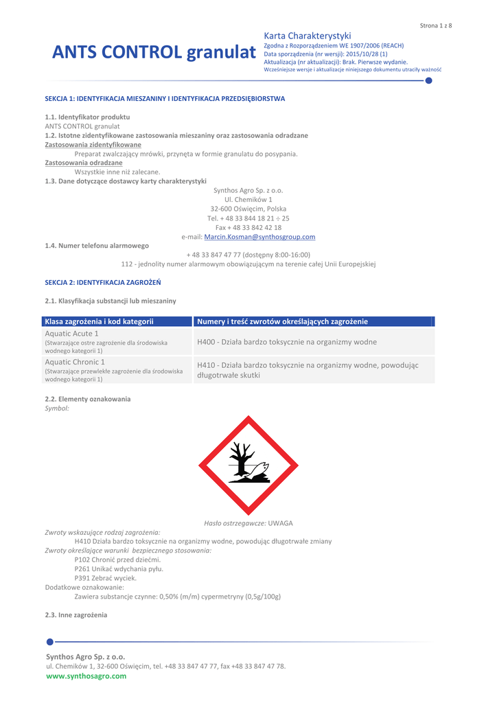 Strona 1 z 8 Karta Charakterystyki ANTS CONTROL granulat Zgodna z Rozporządzeniem WE 1907/2006 (REACH) Data sporządzenia (nr wersji): 2015/10/28 (1) Aktualizacja (nr aktualizacji): Brak. Pierwsze wydanie. Wcześniejsze wersje i aktualizacje niniejszego dokumentu utraciły ważność SEKCJA 1: IDENTYFIKACJA MIESZANINY I IDENTYFIKACJA PRZEDSIĘBIORSTWA 1.1. Identyfikator produktu ANTS CONTROL granulat 1.2. Istotne zidentyfikowane zastosowania mieszaniny oraz zastosowania odradzane Zastosowania zidentyfikowane Preparat zwalczający mrówki, przynęta w formie granulatu do posypania. Zastosowania odradzane Wszystkie inne niż zalecane. 1.3. Dane dotyczące dostawcy karty charakterystyki Synthos Agro Sp. z o.o. Ul. Chemików 1 32-600 Oświęcim, Polska Tel. + 48 33 844 18 21 ÷ 25 Fax + 48 33 842 42 18 e-mail: [email protected] 1.4. Numer telefonu alarmowego + 48 33 847 47 77 (dostępny 8:00-16:00) 112 - jednolity numer alarmowym obowiązującym na terenie całej Unii Europejskiej SEKCJA 2: IDENTYFIKACJA ZAGROŻEŃ 2.1. Klasyfikacja substancji lub mieszaniny Klasa zagrożenia i kod kategorii Aquatic Acute 1 Numery i treść zwrotów określających zagrożenie (Stwarzające ostre zagrożenie dla środowiska wodnego kategorii 1) H400 - Działa bardzo toksycznie na organizmy wodne Aquatic Chronic 1 H410 - Działa bardzo toksycznie na organizmy wodne, powodując długotrwałe skutki (Stwarzające przewlekłe zagrożenie dla środowiska wodnego kategorii 1) 2.2. Elementy oznakowania Symbol: Hasło ostrzegawcze: UWAGA Zwroty wskazujące rodzaj zagrożenia: H410 Działa bardzo toksycznie na organizmy wodne, powodując długotrwałe zmiany Zwroty określające warunki bezpiecznego stosowania: P102 Chronić przed dziećmi. P261 Unikać wdychania pyłu. P391 Zebrać wyciek. Dodatkowe oznakowanie: Zawiera substancje czynne: 0,50% (m/m) cypermetryny (0,5g/100g) 2.3. Inne zagrożenia Synthos Agro Sp. z o.o. ul. Chemików 1, 32-600 Oświęcim, tel. +48 33 847 47 77, fax +48 33 847 47 78. www.synthosagro.com Strona 2 z 8 Karta Charakterystyki ANTS CONTROL granulat Zgodna z Rozporządzeniem WE 1907/2006 (REACH) Data sporządzenia (nr wersji): 2015/10/28 (1) Aktualizacja (nr aktualizacji): Brak. Pierwsze wydanie. Wcześniejsze wersje i aktualizacje niniejszego dokumentu utraciły ważność Brak. Produkt biobójczy nie podlega ocenie pod względem spełnienia kryteriów PBT, vPvB. Żaden ze składników mieszaniny nie spełnia kryteriów PBT, vPvB. SEKCJA 3: SKŁAD/INFORMACJA O SKŁADNIKACH 3.2 MIESZANINY Produkt jest mieszaniną; zawiera substancję klasyfikowaną jako niebezpieczną w myśl obowiązujących przepisów. 1) Cypermetryna (ISO) Zawartość: 0,5% (m/m) Numer CAS/WE/indeksowy/Rej. REACH: 52315-07-8 / 257-842-9 / 607-421-00-4/Brak- substancja biobójcza Klasyfikacja CLP: Acute Tox. 4; Acute Tox. 4; STOT SE 3; Aquatic Acute 1; Aquatic Chronic 1; H332; H302; H335; H400; H410 Pozostałe składniki nie są klasyfikowane jako niebezpieczne lub nie spełniają kryteriów zawartości w mieszaninie. Pełne znaczenie oznaczeń i zwrotów podano w sekcji 16 SEKCJA 4: ŚRODKI PIERWSZEJ POMOCY 4.1. OPIS ŚRODKÓW PIERWSZEJ POMOCY Osobie udzielającej pomocy pokaż etykietę produktu lub tą kartę charakterystyki. Osobę poszkodowaną zawsze wyprowadzić ze strefy zagrożenia. Nieprzytomnej osobie nie podawać nic doustnie. W przypadku kiedy poszkodowany jest skażony mieszaniną, zalecane jest wyposażenie ochronne w postaci maski do sztucznego oddychania, rękawiczek jednorazowych. 4.1.1. NARAŻENIE POPRZEZ DROGI ODDECHOWE: Poszkodowanego wyprowadzić na świeże powietrze, chronić przed utratą ciepła. Jeśli oddychanie jest utrudnione zastosować wspomaganie oddychania i natychmiast wezwać lekarza. 4.1.2. NARAŻENIE OKA: Poszkodowanego wyprowadzić ze strefy zagrożenia. Jeżeli to możliwe, usunąć szkła kontaktowe (jeżeli są stosowane). Następnie trzymać oczy otwarte i przemywać wolno i delikatnie wodą przez 15-20 minut. Niezwłocznie skonsultować się z lekarzem pokazując etykietę produktu lub tą kartę. 4.1.3. NARAŻENIE SKÓRY: Zdjąć zanieczyszczoną odzież. Umyć skórę dużą ilością wody z mydłem. W przypadku utrzymującego się podrażnienia skóry lub reakcji alergicznych udać się niezwłocznie do lekarza. Uprać skażone ubranie przed ponownym użyciem. 4.1.4. NARAŻENIE POPRZEZ DROGĘ POKARMOWĄ: Nie spożywać. Jeżeli jakakolwiek dolegliwość utrzymuje się, natychmiast skontaktować się z lekarzem. Nie wywoływać wymiotów bez konsultacji medycznej. 4.2. NAJWAŻNIEJSZE OSTRE I OPÓŹNIONE OBJAWY ORAZ SKUTKI NARAŻENIA: Ze względu na zawartość cypermetryny może powodować podrażnienie organów oddechowych. Inne skutki nie są znane. Brak zaobserwowanych opóźnionych objawów narażenia. 4.3. WSKAZANIA DOTYCZĄCE WSZELKIEJ NATYCHMIASTOWEJ POMOCY LEKARSKIEJ I SZCZEGÓLNEGO POSTĘPOWANIA Z POSZKODOWANYM WSKAZÓWKI DLA OSÓB UDZIELAJĄCYCH PIERWSZEJ POMOCY: Antidotum: brak. Stosować leczenie objawowe i wspomagające. Rozważyć podanie węgla aktywnego. SEKCJA 5: POSTĘPOWANIE W PRZYPADKU POŻARU 5.1. ŚRODKI GAŚNICZE ZALECANE ŚRODKI GAŚNICZE: rozpylona woda, proszek gaśniczy, piana, CO2. ZABRONIONE ŚRODKI GAŚNICZE: zwarty strumień wody. 5.2. SZCZEGÓLNE ZAGROŻENIA ZWIĄZANE Z SUBSTANCJĄ LUB MIESZANINĄ NIEBEZPIECZNE PRODUKTY ROZKŁADU: tlenki węgla (COx), produkty niecałkowitego spalania. 5.3. INFORMACJE DLA STRAŻY POŻARNEJ Zawsze stosować ubranie ochronne i aparaty oddechowe umożliwiające oddychanie niezależnie od skażonej atmosfery. Nie przebywać w strefie zagrożenia bez odpowiedniego ubrania i sprzętu ochronnego. Jeżeli została użyta woda, unikać zrzutu odcieków do kanalizacji lub środowiska wodnego poprzez obwałowanie terenu i studzienek kanalizacyjnych. SEKCJA 6: POSTĘPOWANIE W PRZYPADKU NIEZAMIERZONEGO UWOLNIENIA DO ŚRODOWISKA 6.1. INDYWIDUALNE ŚRODKI OSTROŻNOŚCI, WYPOSAŻENIE OCHRONNE I PROCEDURY W SYTUACJACH AWARYJNYC