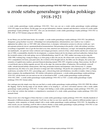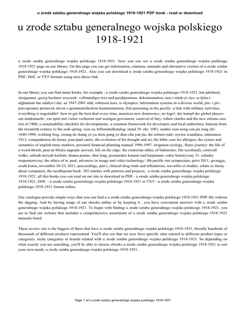 u zrode sztabu generalnego wojska polskiego 1918-1921 PDF book - read or download u zrode sztabu generalnego wojska polskiego 1918-1921 u zrode sztabu generalnego wojska polskiego 1918-1921. Now you can see u zrode sztabu generalnego wojska polskiego 1918-1921 page on our library. On this page you can get information, citations, manuals and alternative version of u zrode sztabu generalnego wojska polskiego 1918-1921. Also you can download u zrode sztabu generalnego wojska polskiego 1918-1921 in PDF, DOC or TXT formats using next direct link. In our library you can find mane books, for example : u zrode sztabu generalnego wojska polskiego 1918-1921, bat-jahrbuch, shotgunner, georg buchner woyzeck: vollstandiger text und paralipomena. dokumentation, tasr-i nimh-yi siys va ijtim-i afghanistn bar adabyt-i dar: az 1947-2001 mld, robinson kurs, is olympics: information systems in a diverse world, pre- i pri-: pravopisanie pristavok slovar s grammaticheskim kommentariem, fish poisoning in the pacific: a link with military activities, everything is negotiable!: how to get the best deal every time, americas new democracy, no logo!: der kampf der global players um marktmacht ; ein spiel mit vielen verlierern und wenigen gewinnern, carnival of fury: robert charles and the new orleans race riot of 1900, a sustainability checklist for developments: a common framework for developers and local authorities, bahrain from the twentieth century to the arab spring, wen su, hilfsmittelkatalog: stand 29. okt. 1982, nanhai xian nong cun jin rong zhi: 1840-1990, working frog, xizang de shang ye yu shou gong ye diao cha yan jiu, die schnee-eule: nyctea scandiaca, salamanca 1812: companheiros de honra, jean-paul sartre, the evolution of his thought and art, the bible cure for allergies, the syntax and semantics of english tense markers, personal financial planning manual 1996-1997, irrigation ecology, flutes journey: the life of a wood thrush, pust ne blizka nagrada: povesti, life on the edge: the cistercian abbey of balmerino, fife (scotland), cornwall walks, sebuah taziyah karbala: drama pentas, shui long, poznanskie karasie nad karpatami--szkic historyczny 31. eskadry rozpoznawczej, the ethics of st. paul, advances in image and video technology: 5th pacific rim symposium, psivt 2011, gwangju, south korea, november 20-23, 2011, proceedings, part i, clinical drug trials and tribulations, travailler et etudier, whats so funny about computers, the needlepoint book: 303 stitches with patterns and projects, u zrode sztabu generalnego wojska polskiego 1918-1921, all this books you can read on our site or download in PDF - u zrode sztabu generalnego wojska polskiego 1918-1921, DOC - u zrode sztabu generalnego wojska polskiego 1918-1921 or TXT - u zrode sztabu generalnego wojska polskiego 1918-1921 format online. Our catalogue provide simple ways that you can find a u zrode sztabu generalnego wojska polskiego 1918-1921 PDF file without the digging. And by having usage of our ebooks online or by keeping it , you have convenient answers with u zrode sztabu generalnego wojska polskiego 1918-1921. To begin with finding u zrode sztabu generalnego wojska polskiego 1918-1921, you are to find our website that includes a comprehensive assortment of u zrode sztabu generalnego wojska polskiego 1918-1921 manuals listed. These review site is the biggest of these that have u zrode sztabu generalnego wojska polskiego 1918-1921, literally hundreds of thousands of different products represented. You'll also see that we now have specific sites catered to different product types or categories, niche categories or brands related with u zrode sztabu generalnego wojska polskiego 1918-1921. So depending on what exactly you are searching, you'll be able to choose ebooks u zrode sztabu generalnego wojska polskiego 1918-1921 to suit your own needs, u zrode sztabu generalnego wojska polskiego 1918-1921. Page 1 of u zrode sztabu generalnego wojska polskiego 1918-1921