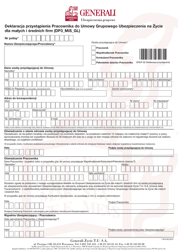 Deklaracja przystąpienia Pracownika do Umowy Grupowego Ubezpieczenia na Życie dla małych i średnich firm (DP3_MiS_GL) Nr polisy* Osoba przystępująca do Umowy*: Nazwa Ubezpieczającego/Pracodawcy* Pracownik Współmałżonek Pracownika Konkubent Pracownika Pełnoletnie dziecko Pracownika Dane osoby przystępującej do Umowy Nazwisko* Imię* Data zawarcia związku małżeńskiego2) Data urodzenia* d PESEL/nr Paszportu (w przypadku obcokrajowców)* d m m Obywatelstwo (jeśli inne niż polskie)* r r r r Adres do korespondencji Ulica* Kod pocztowy* d d m m r r r r Zawód wykonywany* Nr domu* Nr mieszkania* Miejscowość* E-mail Tel. komórkowy* Podany numer telefonu komórkowego służy także do wysłania w formie SMS informacji dotyczących obsługiwanych umów ubezpieczenia np. klucza aktywacyjnego niezbędnego do zarejestrowania się w Koncie Klienta, itp. Oświadczenie o stanie zdrowia osoby przystępującej do Umowy Oświadczam, że nie jestem inwalidą i nie przebywam na zwolnieniu lekarskim, na przestrzeni ostatnich 12 miesięcy nie miałem/nie miałam1) przerwy w pracy spowodowanej chorobą lub wypadkiem dłuższej niż 30 kolejnych dni oraz że z uwagi na stan mojego zdrowia nie zalecono mi regularnego leczenia lub nadzoru lekarskiego, za wyjątkiem profilaktyki. W przypadku braku możliwości podpisania powyższego Oświadczenia o stanie zdrowia do niniejszej Deklaracji należy dołączyć wypełniony kwestionariusz medyczny. Data d Podpis osoby przystępującej do Umowy d m m r r r r Oświadczenie Pracownika Dane Pracownika - (wypełnić tylko w przypadku gdy do umowy przystępuje Współmałżonek/Konkubent/Pełnoletnie dziecko1)) Nazwisko* PESEL* Imię* Data urodzenia* d d m m r r r r Wyrażam zgodę na potrącenie z mojego wynagrodzenia składek na Grupowe Ubezpieczenie na Życie dla małych i średnich firm za osobę przystępującą do ubezpieczenia oraz upoważniam Ubezpieczającego do naliczania, potrącania oraz przelewania ich na rachunek Generali Życie T.U. S.A. (zwanej dalej Towarzystwem) z częstotliwością zadeklarowaną przez Ubezpieczającego we wniosku o zawarcie Umowy Grupowego Ubezpieczenia na Życie dla małych i średnich firm. W przypadku gdy do Umowy przystępuje Konkubent oświadczam, że pozostaję z nim w związku nieformalnym. Data d Podpis Pracownika d m m r r r r Niniejszą Deklarację Pracownik zobowiązany jest przekazać niezwłocznie Ubezpieczającemu. Wypełnia Ubezpieczający / Pracodawca Data zatrudnienia Pracownika u Ubezpieczającego*3) d d m m r r r r Data* d Podpis osoby upoważnionej przez Ubezpieczającego* d m m r r r r Generali ˚ycie T.U. S.A. ul. Post´pu 15B, 02-676 Warszawa, Tel. 0 801 343 343, +48 22 543 05 43, Fax +48 22 543 09 08 1-974-05.2013 Spółka zarejestrowana w Sàdzie Rejonowym dla m. st. Warszawy, XIII Wydział Gospodarczy Krajowego Rejestru Sàdowego pod numerem KRS 25952. Kapitał zakładowy: 61.000.000 PLN w pełni opłacony; NIP: 521-28-87-341. Spółka nale˝àca do Grupy Generali, figurujàcej w Rejestrze Grup Ubezpieczeniowych prowadzonym przez ISVAP pod nr 26. Składka i oświadczenia osoby przystępującej do Umowy 1. Niniejszym oświadczam, że otrzymałem i zapoznałem się z warunkami ubezpieczenia, o których stanowi Umowa zawarta pomiędzy Ubezpieczającym a Generali Życie T.U. S.A. (zwaną dalej Towarzystwem), w tym z Ogólnymi Warunkami Grupowego Ubezpieczenia na Życie dla małych i średnich firm, zakresem ochrony oraz wysokością sum ubezpieczenia wynikających z Umowy. 2. Deklaruję następujące wysokości składek, które będą przelewane na rachunek Towarzystwa z częstotliwością zadeklarowaną przez Ubezpieczającego we wniosku o zawarcie Umowy Grupowego Ubezpieczenia na Życie dla małych i średnich firm: Składka ochronna w kwocie zł 3. Wyrażam zgodę na objęcie mojego życia i zdrowia ochroną ubezpieczeniową z sumą ubezpieczenia wynikającą z Umowy oraz upoważniam Ubezpieczającego do wyrażania w moim imieniu wymaganej zgody na zmianę warunków zastrzeżonej na moją rzecz ochrony ubezpieczeniowej. Pełnomocnictwo obejmuje także umocowanie do ustanawiania dalszych pełnomocników. 4. Oświadczam, że w dniu wypełniania niniejszej Deklaracji: a) jestem hospitalizowany(a) TAK NIE b) przebywam na zwolnieniu lekarskim TAK NIE W przypadku zaznaczenia w pkt. a) lub w pkt. b) odpowiedzi TAK, konieczne jest dołączenie do niniejszej Deklaracji dokumentacji potwierdzającej okres i warunki objęcia ochroną z tytułu wcześniejszej umowy ubezpieczenia. 5. Wyrażam zgodę na przekazanie na żądanie Generali Życie T.U. S.A. przez podmioty, o których mowa w art. 4 ustawy z dnia 15 kwietnia 2011 r. (Dz.U. Nr 112, poz. 654) o działalności leczniczej, które udzielały mi lub udzielać będą świadczeń zdrowotnych informacji o okolicznościach związanych z oceną ryzyka ubezpieczeniowego i weryfikacją podanych przeze mnie danych o stanie zdrowia, ustaleniem prawa do świadczenia z zawartej na moją rzecz Umowy i wysokością tego świadczenia, a także informacji o przyczynie śmierci, z wyłączeniem wyników badań genetycznych. Wyrażam zgodę na poddanie się badaniom diagnostycznym, włącznie z pobraniem krwi w kierunku przeciwciał anty-HIV, z wyłączeniem badań genetycznych. 6. W okresie bezpośrednio poprzedzającym objęcie mnie ochroną z tytułu Umowy ubezpieczenia zawartej z Towarzystwem na podstawie Ogólnych Warunków Grupowego Ubezpieczenia na Życie dla małych i średnich firm, byłem(am) ubezpieczony(a) w ramach innej umowy grupowego ubezpieczenia na życie zawartej z Towarzystwem: TAK w okresie NIE od d d m m r r r r do d d m m r r r r Uposażeni Jako Uposażonego/Uposażonych do otrzymania świadczenia w przypadku mojej śmierci wyznaczam: Lp. Nazwisko* Imię* Data urodzenia* Adres stałego zamieszkania* (ulica/miejscowość, nr domu, kod pocztowy) Razem % sumy ubezpieczenia* 100% Oświadczenia końcowe 1. Wyrażam zgodę na przetwarzanie przez General