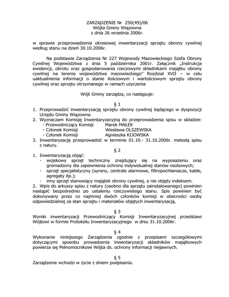ZARZĄDZENIE Nr 250(49)/06 Wójta Gminy Wiązowna z dnia 26 września 2006r. w sprawie przeprowadzenia okresowej inwentaryzacji sprzętu obrony cywilnej według stanu na dzień 30.10.2006r. Na podstawie Zarządzenia Nr 227 Wojewody Mazowieckiego Szefa Obrony Cywilnej Województwa z dnia 5 października 2001r. Załącznik „Instrukcja ewidencji, obrotu oraz gospodarowania rzeczowymi składnikami majątku obrony cywilnej na terenie województwa mazowieckiego” Rozdział XVII – w celu uaktualnienia informacji o stanie ilościowym i wartościowym sprzętu obrony cywilnej oraz sprzętu otrzymanego w ramach użyczenia Wójt Gminy zarządza, co następuje: §1 1. Przeprowadzić inwentaryzację sprzętu obrony cywilnej będącego w dyspozycji Urzędu Gminy Wiązowna. 2. Wyznaczam Komisję Inwentaryzacyjną do przeprowadzenia spisu w składzie: - Przewodniczący Komisji Marek MAŁEK - Członek Komisji Wiesława OLSZEWSKA - Członek Komisji Agnieszka KIJOWSKA 3. Inwentaryzację przeprowadzić w terminie 01.10.- 31.10.2006r. metodą spisu z natury. §2 1. Inwentaryzacją objąć: - wojskowy sprzęt techniczny znajdujący się na wyposażeniu oraz gromadzony dla zapewnienia ochrony indywidualnej stanów osobowych; - sprzęt specjalistyczny (syreny, centrale alarmowe, filtropochłaniacze, kable, agregaty itp.); - inny sprzęt stanowiący majątek obrony cywilnej, a nie objęty indeksem. 2. Wpis do arkuszy spisu z natury (osobno dla sprzętu zainstalowanego) powinien nastąpić bezpośrednio po ustaleniu rzeczywistego stanu. Spis powinien być dokonywany przez co najmniej dwóch członków komisji w obecności osoby odpowiedzialnej za stan sprzętu i materiałów objętych inwentaryzacją. §3 Wyniki inwentaryzacji Przewodniczący Komisji Inwentaryzacyjnej przedstawi Wójtowi w formie Protokółu Inwentaryzacyjnego w dniu 31.10.2006r. §4 Wykonanie niniejszego Zarządzenia zgodnie z przepisami szczegółowymi dotyczącymi sposobu prowadzenia inwentaryzacji składników majątkowych powierza się Pełnomocnikowi Wójta ds. ochrony informacji niejawnych. §5 Zarządzenie wchodzi w życie z dniem podpisania.