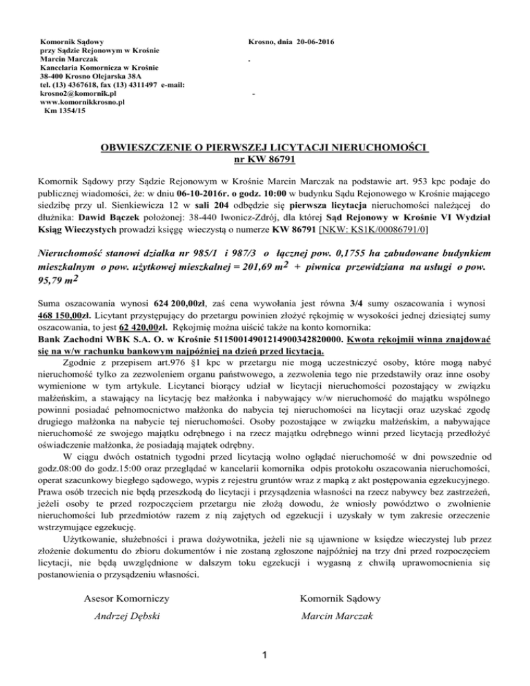Komornik Sądowy przy Sądzie Rejonowym w Krośnie Marcin Marczak Kancelaria Komornicza w Krośnie 38-400 Krosno Olejarska 38A tel. (13) 4367618, fax (13) 4311497 e-mail: [email protected] www.komornikkrosno.pl Km 1354/15 Krosno, dnia 20-06-2016 . - OBWIESZCZENIE O PIERWSZEJ LICYTACJI NIERUCHOMOŚCI nr KW 86791 Komornik Sądowy przy Sądzie Rejonowym w Krośnie Marcin Marczak na podstawie art. 953 kpc podaje do publicznej wiadomości, że: w dniu 06-10-2016r. o godz. 10:00 w budynku Sądu Rejonowego w Krośnie mającego siedzibę przy ul. Sienkiewicza 12 w sali 204 odbędzie się pierwsza licytacja nieruchomości należącej do dłużnika: Dawid Bączek położonej: 38-440 Iwonicz-Zdrój, dla której Sąd Rejonowy w Krośnie VI Wydział Ksiąg Wieczystych prowadzi księgę wieczystą o numerze KW 86791 [NKW: KS1K/00086791/0] Nieruchomość stanowi działka nr 985/1 i 987/3 o łącznej pow. 0,1755 ha zabudowane budynkiem mieszkalnym o pow. użytkowej mieszkalnej = 201,69 m2 + piwnica przewidziana na usługi o pow. 95,79 m2 Suma oszacowania wynosi 624 200,00zł, zaś cena wywołania jest równa 3/4 sumy oszacowania i wynosi 468 150,00zł. Licytant przystępujący do przetargu powinien złożyć rękojmię w wysokości jednej dziesiątej sumy oszacowania, to jest 62 420,00zł. Rękojmię można uiścić także na konto komornika: Bank Zachodni WBK S.A. O. w Krośnie 51150014901214900342820000. Kwota rękojmii winna znajdować się na w/w rachunku bankowym najpóźniej na dzień przed licytacją. Zgodnie z przepisem art.976 §1 kpc w przetargu nie mogą uczestniczyć osoby, które mogą nabyć nieruchomość tylko za zezwoleniem organu państwowego, a zezwolenia tego nie przedstawiły oraz inne osoby wymienione w tym artykule. Licytanci biorący udział w licytacji nieruchomości pozostający w związku małżeńskim, a stawający na licytację bez małżonka i nabywający w/w nieruchomość do majątku wspólnego powinni posiadać pełnomocnictwo małżonka do nabycia tej nieruchomości na licytacji oraz uzyskać zgodę drugiego małżonka na nabycie tej nieruchomości. Osoby pozostające w związku małżeńskim, a nabywające nieruchomość ze swojego majątku odrębnego i na rzecz majątku odrębnego winni przed licytacją przedłożyć oświadczenie małżonka, że posiadają majątek odrębny. W ciągu dwóch ostatnich tygodni przed licytacją wolno oglądać nieruchomość w dni powszednie od godz.08:00 do godz.15:00 oraz przeglądać w kancelarii komornika odpis protokołu oszacowania nieruchomości, operat szacunkowy biegłego sądowego, wypis z rejestru gruntów wraz z mapką z akt postępowania egzekucyjnego. Prawa osób trzecich nie będą przeszkodą do licytacji i przysądzenia własności na rzecz nabywcy bez zastrzeżeń, jeżeli osoby te przed rozpoczęciem przetargu nie złożą dowodu, że wniosły powództwo o zwolnienie nieruchomości lub przedmiotów razem z nią zajętych od egzekucji i uzyskały w tym zakresie orzeczenie wstrzymujące egzekucję. Użytkowanie, służebności i prawa dożywotnika, jeżeli nie są ujawnione w księdze wieczystej lub przez złożenie dokumentu do zbioru dokumentów i nie zostaną zgłoszone najpóźniej na trzy dni przed rozpoczęciem licytacji, nie będą uwzględnione w dalszym toku egzekucji i wygasną z chwilą uprawomocnienia się postanowienia o przysądzeniu własności. Asesor Komorniczy Komornik Sądowy Andrzej Dębski Marcin Marczak 1