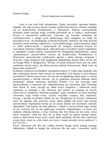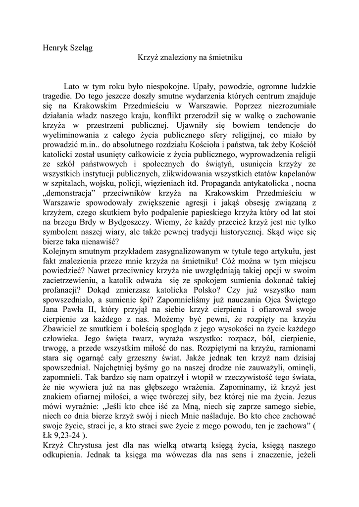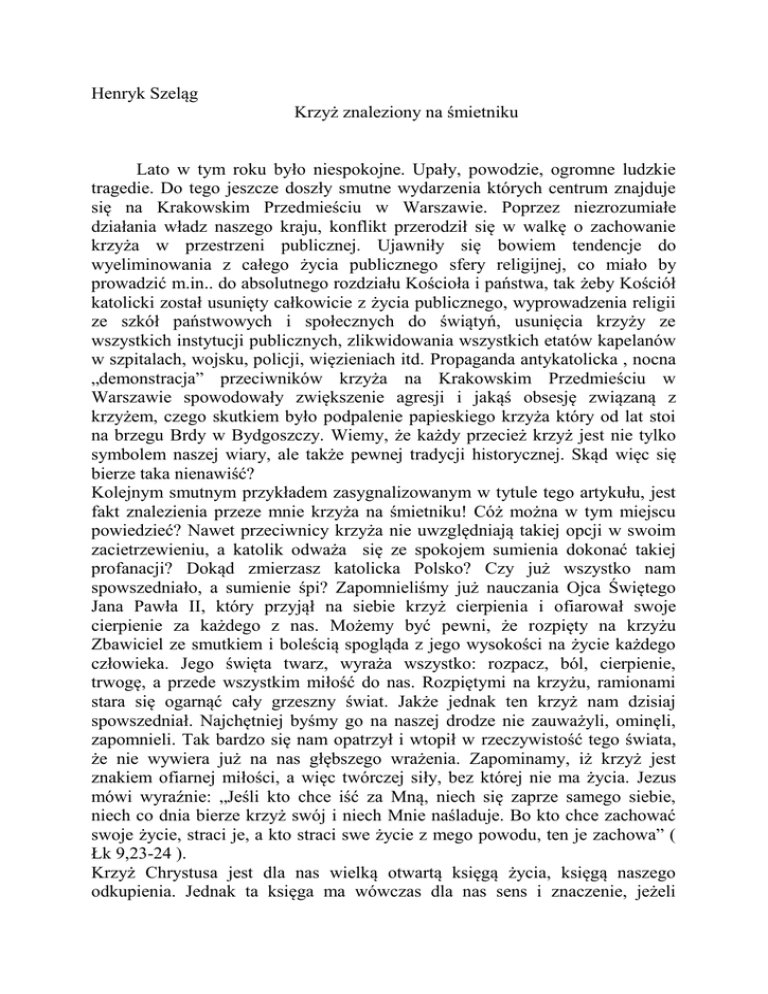 Henryk Szeląg Krzyż znaleziony na śmietniku Lato w tym roku było niespokojne. Upały, powodzie, ogromne ludzkie tragedie. Do tego jeszcze doszły smutne wydarzenia których centrum znajduje się na Krakowskim Przedmieściu w Warszawie. Poprzez niezrozumiałe działania władz naszego kraju, konflikt przerodził się w walkę o zachowanie krzyża w przestrzeni publicznej. Ujawniły się bowiem tendencje do wyeliminowania z całego życia publicznego sfery religijnej, co miało by prowadzić m.in.. do absolutnego rozdziału Kościoła i państwa, tak żeby Kościół katolicki został usunięty całkowicie z życia publicznego, wyprowadzenia religii ze szkół państwowych i społecznych do świątyń, usunięcia krzyży ze wszystkich instytucji publicznych, zlikwidowania wszystkich etatów kapelanów w szpitalach, wojsku, policji, więzieniach itd. Propaganda antykatolicka , nocna „demonstracja” przeciwników krzyża na Krakowskim Przedmieściu w Warszawie spowodowały zwiększenie agresji i jakąś obsesję związaną z krzyżem, czego skutkiem było podpalenie papieskiego krzyża który od lat stoi na brzegu Brdy w Bydgoszczy. Wiemy, że każdy przecież krzyż jest nie tylko symbolem naszej wiary, ale także pewnej tradycji historycznej. Skąd więc się bierze taka nienawiść? Kolejnym smutnym przykładem zasygnalizowanym w tytule tego artykułu, jest fakt znalezienia przeze mnie krzyża na śmietniku! Cóż można w tym miejscu powiedzieć? Nawet przeciwnicy krzyża nie uwzględniają takiej opcji w swoim zacietrzewieniu, a katolik odważa się ze spokojem sumienia dokonać takiej profanacji? Dokąd zmierzasz katolicka Polsko? Czy już wszystko nam spowszedniało, a sumienie śpi? Zapomnieliśmy już nauczania Ojca Świętego Jana Pawła II, który przyjął na siebie krzyż cierpienia i ofiarował swoje cierpienie za każdego z nas. Możemy być pewni, że rozpięty na krzyżu Zbawiciel ze smutkiem i boleścią spogląda z jego wysokości na życie każdego człowieka. Jego święta twarz, wyraża wszystko: rozpacz, ból, cierpienie, trwogę, a przede wszystkim miłość do nas. Rozpiętymi na krzyżu, ramionami stara się ogarnąć cały grzeszny świat. Jakże jednak ten krzyż nam dzisiaj spowszedniał. Najchętniej byśmy go na naszej drodze nie zauważyli, ominęli, zapomnieli. Tak bardzo się nam opatrzył i wtopił w rzeczywistość tego świata, że nie wywiera już na nas głębszego wrażenia. Zapominamy, iż krzyż jest znakiem ofiarnej miłości, a więc twórczej siły, bez której nie ma życia. Jezus mówi wyraźnie: „Jeśli kto chce iść za Mną, niech się zaprze samego siebie, niech co dnia bierze krzyż swój i niech Mnie naśladuje. Bo kto chce zachować swoje życie, straci je, a kto straci swe życie z mego powodu, ten je zachowa” ( Łk 9,23-24 ). Krzyż Chrystusa jest dla nas wielką otwartą księgą życia, księgą naszego odkupienia. Jednak ta księga ma wówczas dla nas sens i znaczenie, jeżeli potrafimy ją przeczytać, odnaleźć morał i zrozumieć jej treść. Dopóki nie zrozumiemy istoty Ofiary Krzyżowej Chrystusa, świat będzie dążył ku zagładzie. Ponieważ krzyż Chrystusa jest również „znakiem któremu sprzeciwiać się będą”, musimy sobie dzisiaj zadać pytania: czy zawsze potrafimy wypełniać wolę Chrystusa? Czy potrafimy pójść za Nim wbrew pokusom tego świata i wbrew tym, którzy plują na nas z powodu naszej przynależności do Niego, nazywając wierzących oszołomami, moherami, ciemnogrodem? Często na te pytania nie umiemy sobie odpowiedzieć. Są dla nas po prostu za trudne. Współczesny świat przytłacza nas ogromem zła, skupia naszą uwagę na pokusach, zachęca do odwrócenia się od Boga. Co dziwne, czynią tak również politycy, którzy przyznając się do wiary katolickiej, akceptują i umożliwiają dzisiaj walkę z krzyżem w naszym kraju, chociaż w dużej mierze wybrani zostali głosami „oszołomów” i „ciemnogrodu”. Jest to woda na młyn dla młodych ludzi wychowywanych w duchu liberalno -lewicowym. Również niektóre media kreują styl życia na luzie, bez Boga, bez krzyża w miejscach publicznych. Kształtują naszą świadomość, a my łatwo się takim manipulacjom poddajemy. Ks. prof. Czesław S. Bartnik w wywiadzie na łamach „Naszego Dziennika”, mówi: „Okazuje się, że teoria ateistyczna państwa również w Polsce znajduje podatny grunt. Przygotowała go ideologia marksistowska ucząca, że partia rządząca musi być ateistyczna i sama ma charakter boski. Toteż nawet nie zauważyliśmy jak od lat 80. ubiegłego wieku życie polskie nadal przenikały poglądy marksistowskie i zarazem liberalistyczne, które zgodnie dążą do całkowitego wyeliminowania religii z życia publicznego. Dostrzegaliśmy tylko, że dzieje się coś złego w polityce, ustawodawstwie, pedagogice, kulturze, etyce, życiu religijnym. Dopiero z czasem spostrzegliśmy, że rodzi się sprzeciw w stosunku do religii w życiu publicznym, że jest to sprzeciwianie się obecności krzyża Chrystusowego we wszystkich dziedzinach”. Dlatego musimy zrozumieć, że potrzeba nam dzisiaj prawdziwej miłości, takiej jaka promieniuje z krzyża Chrystusowego, cierpliwości, pokory, opanowania, wierności, wytrwałości i głębokiej wiary, której znakiem jest krzyż. Wtedy nie będzie m. in. sprofanowanego krzyża na śmietniku, ponieważ: W krzyżu cierpienie, w krzyżu zbawienie, W krzyżu miłości nauka. Kto Ciebie , Boże, raz pojąć może, Ten nic nie pragnie, ni szuka. Kiedy cierpienie, kiedy zwątpienie Serce ci na wskroś przepali, Gdy grom się zbliża, pospiesz do krzyża, On ciebie wesprze, ocali. Krzyż o którym dzisiaj piszę, zostanie powieszony w salce katechetycznej jednej ze szkół w naszej parafii.