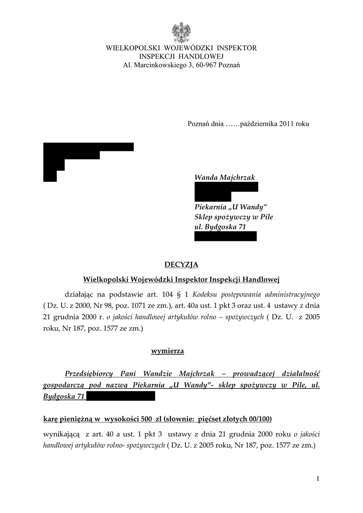 WIELKOPOLSKI WOJEWÓDZKI INSPEKTOR INSPEKCJI HANDLOWEJ Al. Marcinkowskiego 3, 60-967 Poznań Poznań dnia ……października 2011 roku Nr akt : D/PI.ŻG-4-42-27/11 D/PI.8361.27.2011 ZPO PO Wanda Majchrzak zam. ul. Lutycka 22 64-920 Piła Piekarnia „U Wandy” Sklep spożywczy w Pile ul. Bydgoska 71 NIP: 764-133-88-48 DECYZJA Wielkopolski Wojewódzki Inspektor Inspekcji Handlowej działając na podstawie art. 104 § 1 Kodeksu postępowania administracyjnego ( Dz. U. z 2000, Nr 98, poz. 1071 ze zm.), art. 40a ust. 1 pkt 3 oraz ust. 4 ustawy z dnia 21 grudnia 2000 r. o jakości handlowej artykułów rolno – spożywczych ( Dz. U. z 2005 roku, Nr 187, poz. 1577 ze zm.) wymierza Przedsiębiorcy Pani Wandzie Majchrzak – prowadzącej działalność gospodarczą pod nazwą Piekarnia „U Wandy”- sklep spożywczy w Pile, ul. Bydgoska 71 ( NIP: 778-008-18-50) karę pieniężną w wysokości 500 zł (słownie: pięćset złotych 00/100) wynikającą z art. 40 a ust. 1 pkt 3 ustawy z dnia 21 grudnia 2000 roku o jakości handlowej artykułów rolno- spożywczych ( Dz. U. z 2005 roku, Nr 187, poz. 1577 ze zm.) 1 z tytułu wprowadzenia do obrotu handlowego w dniu kontroli tj. w dniu 9 lutego 2011 roku w sklepie spożywczym, ul. Bydgoska 71 w Pile artykułów rolno- spożywczych nieodpowiadających jakości handlowej określonej w przepisach o jakości handlowej tj: 1) pieczywo sprzedawane bez opakowań: • chleb zwykły 550 g, 37 sztuk w cenie 2 zł/szt. o wartości 74 zł • chleb zwykły z makiem 1 kg, 4 sztuki w cenie 3,80/szt. o wartości 15,20 zł - obie partie chleba nie spełniały wymogów w zakresie oznakowania z powodu nie podania przy pieczywie nazwy pieczywa i masy jednostkowej, informacji wymaganych § 31 rozporządzenia Ministra Rolnictwa i Rozwoju Wsi z dnia 10.07.07 roku w sprawie znakowania środków spożywczych(Dz. U. Nr 137, poz. 966 ze zm.), 2) pieczywo w opakowaniach jednostkowych: • chleb zwykły krojony 550 g, 21 sztuk w cenie 2,20 zł/op o wartości 46,20 - nie spełniał wymagań w zakresie znakowania z powodu: - nie podania rodzaju pieczywa, co narusza art. 47 ust.1 ustawy z dnia 25.08.2006 r. o bezpieczeństwie żywności i żywienia (Dz.U. z 2010 roku, Nr 136, poz.914 ze zm.) oraz art. 7 ust. 2 pkt 1 ustawy z dnia 21.12.2000 roku o jakości handlowej artykułów rolno-spożywczych (Dz.U. z 2005 roku, Nr187, poz.1577 ze zm.), - braku informacji o składnikach występujących w produkcie (mąka pszenna, mąka żytnia, sól, drożdże), informacji wymaganych § 2 ust. 1 pkt 2 rozporządzenia Ministra Rolnictwa i Rozwoju Wsi z dnia 10.07.07 r. w sprawie znakowania środków spożywczych, - nie oznaczenia datą minimalnej trwałości albo terminu przydatności do spożycia, informacji wymaganych § 2 ust.1 pkt 3 rozporządzenia Ministra Rolnictwa i Rozwoju Wsi z dnia 10.07.07 r. w sprawie znakowania środków spożywczych - nie podania danych identyfikujących producenta, co jest wymagane art. 7 ust. 2 pkt 2 ustawy z dnia 21.12.2000r. o jakości handlowej artykułów rolno-spożywczych oraz § 2 ust.1 pkt 5 rozporządzenia Ministra Rolnictwa i Rozwoju W z dnia 10.07.07 r. w sprawie znakowania środków spożywczych, - nie podania zawartości netto, informacji wymaganej § 2 ust.1 pkt 6 rozporządzenia Ministra Rolnictwa i Rozwoju W z dnia 10.07.07 r. w sprawie znakowania środków spożywczych, - nie podania warunków przechowywania, informacji wymaganych § 2 ust.1 pkt 7 rozporządzenia Ministra Rolnictwa i Rozwoju W z dnia 10.07.07 r. w sprawie znakowania środków spożywczych, - braku numeru partii produkcyjnej, informacji wymaganej art. 7 a ust.1 ustawy z 21.12. 2000 roku o jakości handlowej art. rolno-spożywczych oraz § 2 ust.1 pkt 8 rozporządzenia Ministra Rolnictwa i Rozwoju Wsi z dnia 10.07.07 r. w sprawie znakowania środków spożywczych a także rozporządzenia Ministra Rolnictwa 2 i Rozwoju Wsi niektórych grup produkcyjnej, z 13.04.2004 r. w sprawie szczegółowego zakresu i sposobu znakowania i rodzajów artykułów rolno-spożywczych kodem identyfikacyjnym partii - nie uwidocznienia informacji w zakresie składników alergennych (produkt zawiera składnik alergenny „gluten” ze zbóż użytych do produkcji), wymaganej § 5 ust. 10 rozporządzenia Ministra Rolnictwa i Rozwoju Wsi z dnia 10.07.07 r. w sprawie znakowania środków spożywczych, • chleb razowy krojony 500g, 6 sztuk w cenie 2,20 zł/op o wartości 13 zł – nie spełniał wymagań w zakresie oznakowania z powodu: - nie podania rodzaju pieczywa zgodnie z przesłaną recepturą (powinno być chleb żytni razowy krojony), co narusza art. 47 ust. 1 ustawy z dnia 25.08.2006 r. o bezpieczeństwie żywności i żywienia .) oraz art. 7 ust. 2 pkt 1 ustawy z dnia 21.12.2000 r. o jakości handlowej artykułów rolno-spożywczych, - braku informacji o użytej do produkcji mąki żytniej razowej, wymaganej § 2 ust. 1 pkt 2 rozporządzenia Ministra Rolnictwa i Rozwoju Wsi z dnia 10.07.07 r. w sprawie znakowania środków spożywczych, oraz ilościowej zawartości mąki razowej żytniej występującej w produkcie, informacji wymaganej § 9 ust.1 pkt 1 i § 10 ust. 1 rozporządzenia Ministra Rolnictwa i Rozwoju Wsi z dnia 10.07.07 r. w sprawie znakowania środków spożywczych, - braku daty minimalnej trwałości albo terminu przydatności do spożycia, informacji wymaganych § 2 ust.1 pkt 3 rozporządzenia Ministra Rolnictwa i Rozwoju Wsi z dnia 10.07.07 r. w sprawie znakowania środków spożywczych, - nie podania zawartości netto, informacji wymaganej § 2 ust.1 pkt 6 rozporządzenia Ministra Rolnictwa i Rozwoju W z dnia 10.07.07 r. w sprawie znakowania środków spożywczych, - nie podania warunków przechowywania informacji wymaganych § 2 ust.1 pkt 7 rozporządzenia Ministra Rolnictwa i Rozwoju W z dnia 10.07.07 r. w sprawie znakowania środków spożywczych, - braku numeru partii produkcyjnej, informacji wymaganej art. 7 a ust.1 ustawy z 21 grudnia 2000 r. o jakości handlowej art. rol