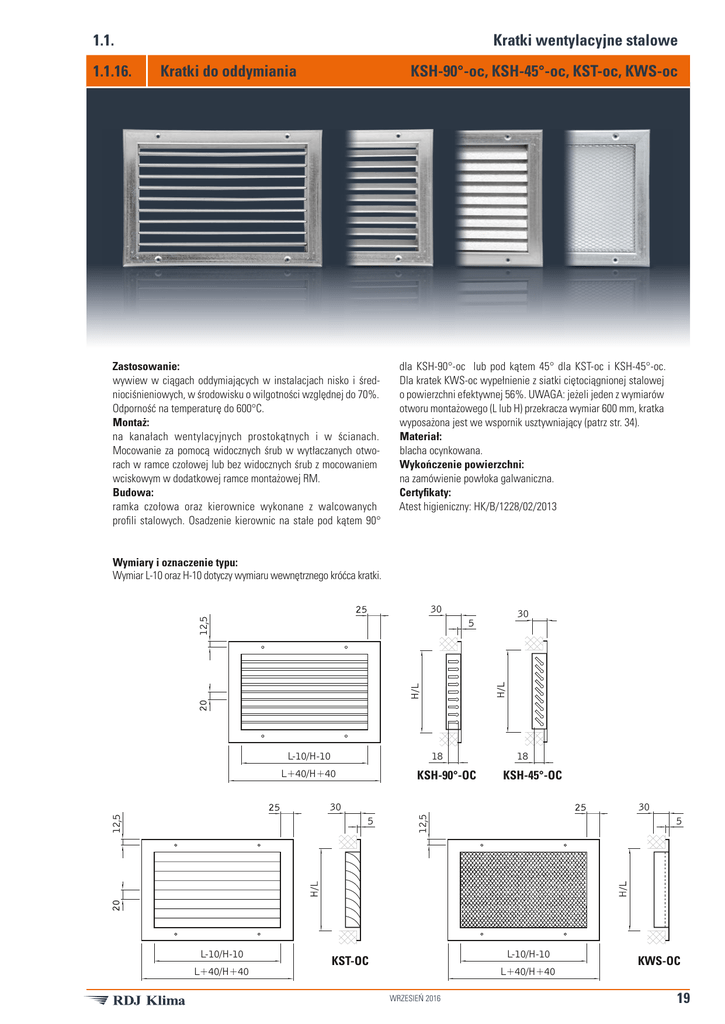 1.1. 1.1.16. Kratki wentylacyjne stalowe Kratki do oddymiania KSH-90°-oc, KSH-45°-oc, KST-oc, KWS-oc Zastosowanie: wywiew w ciągach oddymiających w instalacjach nisko i średniociśnieniowych, w środowisku o wilgotności względnej do 70%. Odporność na temperaturę do 600°C. Montaż: na kanałach wentylacyjnych prostokątnych i w ścianach. Mocowanie za pomocą widocznych śrub w wytłaczanych otworach w ramce czołowej lub bez widocznych śrub z mocowaniem wciskowym w dodatkowej ramce montażowej RM. Budowa: ramka czołowa oraz kierownice wykonane z walcowanych profili stalowych. Osadzenie kierownic na stałe pod kątem 90° dla KSH-90°-oc lub pod kątem 45° dla KST-oc i KSH-45°-oc. Dla kratek KWS-oc wypełnienie z siatki ciętociągnionej stalowej o powierzchni efektywnej 56%. UWAGA: jeżeli jeden z wymiarów otworu montażowego (L lub H) przekracza wymiar 600 mm, kratka wyposażona jest we wspornik usztywniający (patrz str. 34). Materiał: blacha ocynkowana. Wykończenie powierzchni: na zamówienie powłoka galwaniczna. Certyfikaty: Atest higieniczny: HK/B/1228/02/2013 Wymiary i oznaczenie typu: Wymiar L-10 oraz H-10 dotyczy wymiaru wewnętrznego króćca kratki. 12,5 30 L-10/H-10 18 L+40/H+40 L+40/H+40 KSH-90°-OC 5 30 18 KSH-45°-OC 30 12,5 12,5 30 L-10/H-10 5 L-10/H-10 KST-OC L+40/H+40 WRZESIEŃ 2016 5 KWS-OC 19