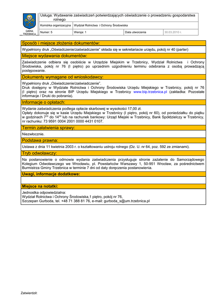 Usługa: Wydawanie zaświadczeń potwierdzających oświadczenie o prowadzeniu gospodarstwa rolnego Komórka organizacyjna Wydział Rolnictwa i Ochrony Środowiska Numer: 5 Wersja: 1 Data utworzenia 30.03.2010 r. Sposób i miejsce złożenia dokumentów: Wypełniony druk „Oświadczenie/zaświadczenie” składa się w sekretariacie urzędu, pokój nr 40 (parter) Miejsce wydawania dokumentów: Zaświadczenie odbiera się osobiście w Urzędzie Miejskim w Trzebnicy, Wydział Rolnictwa i Ochrony Środowiska, pokój nr 76 (I piętro) po uprzednim uzgodnieniu terminu odebrania z osobą prowadzącą postępowanie. Dokumenty wymagane od wnioskodawcy: Wypełniony druk „Oświadczenie/zaświadczenie”. Druk dostępny w Wydziale Rolnictwa i Ochrony Środowiska Urzędu Miejskiego w Trzebnicy, pokój nr 76 (I piętro) oraz na stronie BIP Urzędu Miejskiego w Trzebnicy www.bip.trzebnica.pl (zakładka: Pozostałe informacje / Druki do pobrania). Informacje o opłatach: Wydanie zaświadczenia podlega opłacie skarbowej w wysokości 17,00 zł. Opłaty dokonuje się w kasie Urzędu Miejskiego w Trzebnicy (I piętro, pokój nr 60), od poniedziałku do piątku w godzinach 730 do 1400 lub na rachunek bankowy: Urząd Miejski w Trzebnicy, Bank Spółdzielczy w Trzebnicy, nr rachunku: 73 9591 0004 2001 0000 4431 0107. Termin załatwienia sprawy: Niezwłocznie. Podstawa prawna: Ustawa z dnia 11 kwietnia 2003 r. o kształtowaniu ustroju rolnego (Dz. U. nr 64, poz. 592 ze zmianami). Tryb odwoławczy: Na postanowienie o odmowie wydania zaświadczenia przysługuje stronie zażalenie do Samorządowego Kolegium Odwoławczego we Wrocławiu, pl. Powstańców Warszawy 1, 50-951 Wrocław, za pośrednictwem Burmistrza Gminy Trzebnica w terminie 7 dni od daty doręczenia postanowienia. Uwagi, informacje dodatkowe: Miejsce na notatki: Jednostka odpowiedzialna: Wydział Rolnictwa i Ochrony Środowiska,1 piętro, pokój nr 76, Szczepan Gurboda, tel. +48 71 388 81 76, e-mail: [email protected] Zatwierdził: