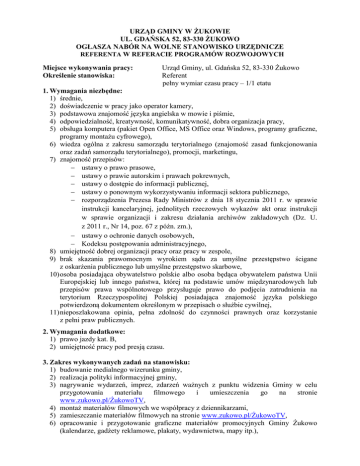 URZĄD GMINY W ŻUKOWIE UL. GDAŃSKA 52, 83-330 ŻUKOWO OGŁASZA NABÓR NA WOLNE STANOWISKO URZĘDNICZE REFERENTA W REFERACIE PROGRAMÓW ROZWOJOWYCH Miejsce wykonywania pracy: Określenie stanowiska: Urząd Gminy, ul. Gdańska 52, 83-330 Żukowo Referent pełny wymiar czasu pracy – 1/1 etatu 1. Wymagania niezbędne: 1) średnie, 2) doświadczenie w pracy jako operator kamery, 3) podstawowa znajomość języka angielska w mowie i piśmie, 4) odpowiedzialność, kreatywność, komunikatywność, dobra organizacja pracy, 5) obsługa komputera (pakiet Open Office, MS Office oraz Windows, programy graficzne, programy montażu cyfrowego), 6) wiedza ogólna z zakresu samorządu terytorialnego (znajomość zasad funkcjonowania oraz zadań samorządu terytorialnego), promocji, marketingu, 7) znajomość przepisów: − ustawy o prawo prasowe, − ustawy o prawie autorskim i prawach pokrewnych, − ustawy o dostępie do informacji publicznej, − ustawy o ponownym wykorzystywaniu informacji sektora publicznego, − rozporządzenia Prezesa Rady Ministrów z dnia 18 stycznia 2011 r. w sprawie instrukcji kancelaryjnej, jednolitych rzeczowych wykazów akt oraz instrukcji w sprawie organizacji i zakresu działania archiwów zakładowych (Dz. U. z 2011 r., Nr 14, poz. 67 z późn. zm.), − ustawy o ochronie danych osobowych, − Kodeksu postępowania administracyjnego, 8) umiejętność dobrej organizacji pracy oraz pracy w zespole, 9) brak skazania prawomocnym wyrokiem sądu za umyślne przestępstwo ścigane z oskarżenia publicznego lub umyślne przestępstwo skarbowe, 10) osoba posiadająca obywatelstwo polskie albo osoba będąca obywatelem państwa Unii Europejskiej lub innego państwa, której na podstawie umów międzynarodowych lub przepisów prawa wspólnotowego przysługuje prawo do podjęcia zatrudnienia na terytorium Rzeczypospolitej Polskiej posiadająca znajomość języka polskiego potwierdzoną dokumentem określonym w przepisach o służbie cywilnej, 11) nieposzlakowana opinia, pełna zdolność do czynności prawnych oraz korzystanie z pełni praw publicznych. 2. Wymagania dodatkowe: 1) prawo jazdy kat. B, 2) umiejętność pracy pod presją czasu. 3. Zakres wykonywanych zadań na stanowisku: 1) budowanie medialnego wizerunku gminy, 2) realizacja polityki informacyjnej gminy, 3) nagrywanie wydarzeń, imprez, zdarzeń ważnych z punktu widzenia Gminy w celu przygotowania materiału filmowego i umieszczenia go na stronie www.zukowo.pl/ŻukowoTV, 4) montaż materiałów filmowych we współpracy z dziennikarzami, 5) zamieszczanie materiałów filmowych na stronie www.zukowo.pl/ŻukowoTV, 6) opracowanie i przygotowanie graficzne materiałów promocyjnych Gminy Żukowo (kalendarze, gadżety reklamowe, plakaty, wydawnictwa, mapy itp.), 7) obróbka zdjęć na potrzeby mediów, tworzenie bazy zdjęć, 8) pomoc w redakcji strony internetowej (zamieszczanie materiałów na stronę, obróbka zdjęć, dobór grafiki itp.), 9) przygotowanie identyfikacji wizualnej Gminy (papier firmowy, wizytówki, loga itp.), 10) prowadzenie baz danych: archiwum fotograficzne i dokumentacja publikacji prasowych, filmowych i audiowizualnych, kontaktów, 11) bieżąca obsługa redakcyjna strony internetowej miasta i gminy, 12) współpraca przy redakcji biuletynu informacyjnego gminy (przygotowanie propozycji składu, dobór materiałów zdjęciowych, graficznych, przygotowywanie grafiki, banerów, plakatów, ogłoszeń itp.), 13) zapewnienie obsługi fotograficznej i filmowej ważnych wydarzeń organizowanych przez gminę lub z udziałem organów gminy i jej archiwizowanie, 14) współpraca z innymi referatami i samodzielnymi stanowiskami pracy w zakresie niezbędnym do prawidłowego przygotowania dokumentów promocyjnych, 15) przygotowywanie sprawozdań, ocen, analiz i bieżących informacji z realizacji wykonywanych zadań, 16) archiwizowanie dokumentacji zgodnie z procedurami wewnętrznymi. 4. Informacja o warunkach pracy na danym stanowisku: 1) stanowisko pracy na I piętrze (brak windy, podjazd oraz toaleta dostosowana dla osób niepełnosprawnych na parterze), 2) obsługa komputera powyżej 4 godzin na dobę, 3) praca w wymuszonej pozycji ciała – praca biurowa, 4) kontakty: bezpośrednie i telefoniczne z instytucjami i klientami, 5) częstotliwość wyjazdów służbowych: częste wyjazdy służbowe, 6) praca pod presją czasu, stanowisko narażone na stres. 5. Wymagane dokumenty: 1) własnoręcznie podpisany list motywacyjny, 2) informacje (np. CV), o których mowa w art. 221 ustawy z dnia 26 czerwca 1974 r. Kodeks pracy (tj. Dz. U. z 2016 r., poz. 1666) tj. imię (imiona) i nazwisko, imiona rodziców, data urodzenia, miejsce zamieszkania (adres do korespondencji), wykształcenie, przebieg dotychczasowego zatrudnienia, 3) kserokopie świadectw pracy lub inne dokumenty potwierdzające zatrudnienie i staż pracy, 4) kserokopie dokumentów poświadczające wykształcenie oraz potwierdzające posiadane kwalifikacje i umiejętności, 5) referencje (o ile kandydat jest w ich posiadaniu), 6) oświadczenie kandydata o posiadanym obywatelstwie (w przypadku osoby będącej obywatelem państwa Unii Europejskiej lub innego państwa, której na podstawie umów międzynarodowych lub przepisów prawa wspólnotowego przysługuje prawo do podjęcia zatrudnienia na terytorium Rzeczypospolitej Polskiej – kserokopia dokumentu potwierdzającego posiadanie znajomości języka polskiego określonego w przepisach o służbie cywilnej), 7) oświadczenie kandydata o niekaralności za umyślne przestępstwo ścigane z oskarżenia publicznego lub umyślne przestępstwo skarbowe, 8) oświadczenie kandydata o posiadanej pełnej zdolności do czynności prawnych oraz korzystaniu z pełni praw publicznych oraz o posiadaniu nieposzlakowanej opinii, 9) kandydat, który zamierza skorzystać z uprawnienia, o którym mowa w art. 13a ust. 2 ustawy z dnia 21 listopada 2008 r. o pracownikach samorządowych (tj. Dz. U. z 2016 r., poz. 902)