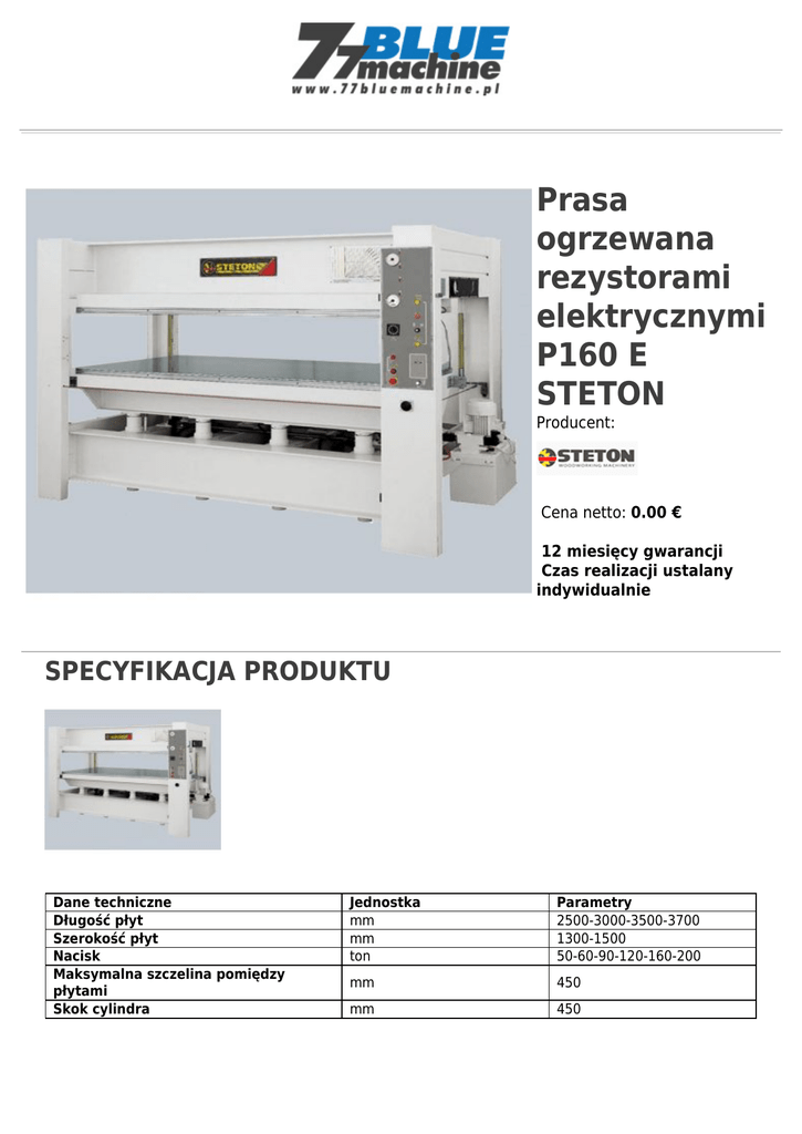 Prasa ogrzewana rezystorami elektrycznymi P160 E STETON Producent: Cena netto: 0.00 € 12 miesięcy gwarancji Czas realizacji ustalany indywidualnie SPECYFIKACJA PRODUKTU Dane techniczne Długość płyt Szerokość płyt Nacisk Maksymalna szczelina pomiędzy płytami Skok cylindra Jednostka mm mm ton Parametry 2500-3000-3500-3700 1300-1500 50-60-90-120-160-200 mm 450 mm 450 MOCNE STRONY • Konstrukcja wykonana z profili spawanych elektrycznie. • Zrównoważony ruch płyt za pomocą stojaków, kół zębatych i prowadnic. • Ogrzewane przez elektryczne rezystory. • Bezpieczny system zamykania płyt, z podwójnym przyciskiem na panelu sterowania. • Podwójny manometr do regulacji ciśnienia. • Automatyczny reset nacisku. • Otwieranie ruchomych płyt za pomocą przycisku. • Kabel obwodowy z wyłącznikiem bezpieczeństwa. • Zbudowany zgodnie z obowiązującymi zasadami bezpieczeństwa. OPCJONALNIE: • Pośrednie płyty dociskowe. • Płyty dociskowe pokryte złotem lub srebrem. • Skok cylindrów - 650 mm. • Kontrola równoległości płyt dociskowych. • Elektroniczny programator.