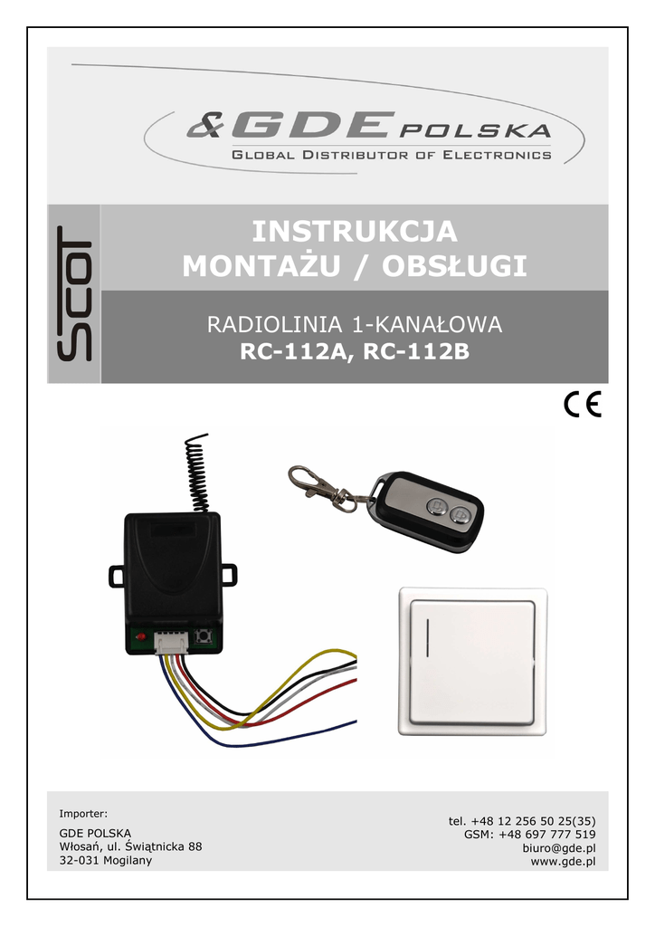 INSTRUKCJA MONTAŻU / OBSŁUGI RADIOLINIA 1-KANAŁOWA RC-112A, RC-112B Importer: GDE POLSKA Włosań, ul. Świątnicka 88 32-031 Mogilany tel. +48 12 256 50 25(35) GSM: +48 697 777 519 [email protected] www.gde.pl RC-112A, RC-112B Radiolinia RC-112 służy do sterowania jednym urządzeniem lub grupą urządzeń działających jednocześnie. Sterowanie odbywa się za pomocą zaprogramowanych pilotów RC-1A lub przycisków RC-1B. Parametry: Odbiornik RC-112: • Napięcie zasilania: 12V DC • Pobór prądu: <12mA • Wyjście przekaźnikowe: NO / NC , 3A / 125VAC • Częstotliwość pracy: 433MHz • Wymiary: 61 x 43 x 30 mm Pilot RC-1A: • Napięcie zasilania: 12V DC (bateria „27A” 12V) • Moc nadajnika: 10mW • Częstotliwość nadawania: 433MHz • Wymiary: 54 x 30 x 13 mm Przycisk RC-1B: • Napięcie zasilania: 12V DC (bateria „11A” 6V) • Moc nadajnika: 10mW • Częstotliwość nadawania: 433MHz • Wymiary przycisku: 80 x 80 x 15mm (montaż natynkowy wewnątrz pomieszczeń) Opis urządzeń: Odbiornik RC-112: Pilot RC-1A: Przycisk RC-1B: -2- RC-112A, RC-112B Funkcjonalność: Radiolinia może działać w jednym z trzech trybów - w zależności od ustawień zworki wewnątrz obudowy odbiornika. 1. Tryb czasowy (3S) – W trybie tym działa tylko przycisk 1 pilota/przycisku naściennego. Naciśnięcie i zwolnienie przycisku 1 powoduje zadziałanie odbiornika (zwarcie obwodu NO-COM, rozwarcie obwodu NC-COM) na czas 3 sekund. Po tym czasie odbiornik powróci do stanu czuwania. Jeżeli podczas zadziałania przekaźnika (w czasie 3 sekund) przycisk nadajnika zostanie wciśnięty i zwolniony ponownie – odliczanie czasu 3 sekund rozpoczyna się na nowo (działanie odbiornika zostaje podtrzymane) Jeżeli przycisk nadajnika zostanie wciśnięty i niezwolniony czas działania odbiornika wydłuży się o 2 sekundy (do 5 sekund), po czym powróci on do stanu czuwania. 2. Tryb bistabilny (L) – W trybie tym działają dwa przyciski nadajnika. Naciśnięcie przycisku 1 nadajnika spowoduje zadziałanie odbiornika (zwarcie obwodu NO-COM, rozwarcie obwodu NC-COM). Naciśnięcie przycicisku 2 nadajnika spowoduje powrót do stanu czuwania (rozwarcie obwodu NO-COM, zwarcie obwodu NC-COM). 3. Tryb monostabilny (M) - W trybie tym działa tylko przycisk 1 pilota/przycisku naściennego. Przekaźnik odbiornika pozostaje załączony tak długo, jak długo naciskamy przycisk nadajnika. Programowanie nadajników Odbiornik RC-112 umożliwia przypisanie max. 30 szt. odbiorników RC-1A / RC-1B. Wszystkie zaprogramowane nadajniki będą działać w jednym z trzech ustawionych wcześniej trybów. Aby przypisać nadajnik do odbiornika: 1. Wciśnij i przytrzymaj przez. ok. 3 sekundy przycisk programowania na odbiorniku. 2. Odbiornik wejdzie w tryb programowania nadajnika. 3. W ciągu 30 sekund wciśnij i przytrzymaj przycisk 1 nadajnika którego chcesz przypisać. 4. Odbiornik potwierdzi przypisanie mruganiem diody LED. 5. Zwolnij przycisk nadajnika kiedy dioda LED zgaśnie. Aby przypisać więcej nadajników do odbiornika powtórz procedurę od punktu 1. Kasowanie pamięci odbiornika Aby usunąć wszystkie nadajniki z pamięci odbiornika. Wciśnij i przytrzymaj przez. ok. 8 sekund przycisk programowania na odbiorniku. Dioda na odbiorniku będzie świecić do momentu wykasowania nadajników z pamięci. -3- RC-112A, RC-112B Pozbywanie się starych urządzeń elektrycznych To urządzenie jest oznaczone zgodnie z Ustawą o zużytym sprzęcie elektrycznym i elektronicznym symbolem przekreślonego kontenera na odpady. Takie oznakowanie informuje, że sprzęt ten, po okresie jego użytkowania nie może być umieszczany łącznie z innymi odpadami pochodzącymi z gospodarstwa domowego. Użytkownik jest zobowiązany do oddania go prowadzącym zbieranie zużytego sprzętu elektrycznego i elektronicznego. Prowadzący zbieranie, w tym lokalne punkty zbiórki, sklepy oraz gminne jednostki, tworzą odpowiedni system umożliwiający oddanie tego sprzętu. Właściwe postępowanie ze zużytym sprzętem elektrycznym i elektronicznym przyczynia się do uniknięcia szkodliwych dla zdrowia ludzi i środowiska naturalnego konsekwencji, wynikających z obecności składników niebezpiecznych oraz niewłaściwego składowania i przetwarzania takiego sprzętu. (TŁUMACZENIE DEKLARACJI ZGODNOŚCI) DEKLARACJA ZGODNOŚCI My BONSO ELECTRONICS LTD. UNIT 1106-1110, 11/F., STAR HOUSE, 3 SALISBURY ROAD, TSIMSHATSUI, KOWLOON, HONG KONG. Oświadczamy na własną odpowiedzialność, że produkt: Nazwa produktu: Model: nadajnik 433MHz, odbiornik 433MHz RC-112(A,B), RC-1(A,B) Opisany produkt jest zgodny z dyrektywami: spełnia wymagania dotyczące dyrektyw 2006/95/EC, 2004/108/EC, 99/5/EC: Radio: EMC: Safety: EN 300 296-1 V1.2.1, EN 300 296-2 V1.2.1 EN 301 489-1 V1.8.1, EN 301 489-5 V1.3.1 EN 60950-1:2006+A11:2009, IEC 60950-1:2001 (1st Edition) Niniejszym oświadczamy, że zgodnie z wytycznymi Rady UE są spełnione wszystkie główne wymagania bezpieczeństwa dotyczące następujących dyrektyw: CE (93/68/EEC) Osoba odpowiedzialna za sporządzenie deklaracji: Susan Seo, Manufacture Plant / Manager 07 wrzesień 2011, Hong Kong -4-