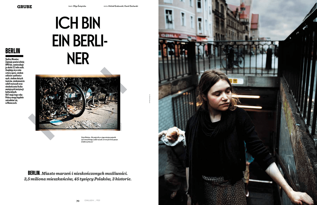 GRUBE Berlin Olga Święcicka foto: Michał Grabowski, Kamil Zacharski Ich bin ein Berliner fot. Michał Grabowski Stolica Niemiec. Zajmuje powierzchnię 890 km, zamieszkuje je około 3,5 mln osób. Znajdują się w nim cztery opery, siedem orkiestr symfonicznych, siedem dużych teatrów, siedemnaście szkół wyższych oraz nieskończona liczba mniejszych instytucji kulturalnych. Od 1 maja tego roku Polacy mogą legalnie zatrudniać się w Niemczech. tekst: fot. Kamil Zacharski Zuzia Kałużna: „Na mojej ulicy w ciągu miesiąca pojawiło się 5 nowych knajp. Ludzie wyczuli, ze to tu jest teraz gorąco. Zrobiło się tłoczno” fot. Alessandro Russotti, dzięki uprzejmości Cosmit spa Berlin. Miasto marzeń i nieskończonych możliwości. 3,5 miliona mieszkańców, 45 tysięcy Polaków, 3 historie. 70 exklusiv ... #101 #101 ... exklusiv 71 GRUBE Granica między Polską a Niemcami stwarza dużo barier Michał Grabowski miał być aktorem – pochodzi z rodziny aktorów, a teatralne tradycje zobowiązują, trudno uciec. Myśl, żeby zostać operatorem filmowym, przyszła do niego niespodziewanie. – Oglądałem przed maturą Czas Apokalipsy – mówi. – Zauważyłem wtedy istnienie obrazu jako takiego, zacząłem się zastanawiać, ile światło może opowiedzieć o ludziach, jak niesamowicie działa na podświadomość. Zupełnie inaczej niż aktor czy scenografia. Od tego momentu próbował dostać się do szkoły filmowej. Bezskutecznie. O berlińskiej filmówce dowiedział się przez przypadek, od znajomego rodziców. Na egzaminy przyjechał, żeby się sprawdzić. Nie planował się dostać, dlatego podszedł do nich bezstresowo. Nie znał dobrze języka, więc na pisemnych testach pisał: „Tut mir leid, ich habe keine Ahnung” („Przykro mi, nie mam pojęcia”) i oddawał puste kartki. Swoją beztroską zaimponował dyrektorowi szkoły. Dostał się pod fot. Kamil Zacharski fot. Michał Grabowski Pierwsze berlińskie wspomnienia Zuzi Kałużnej sięgają 2007 roku, kiedy wraz z tatą przekraczała polsko-niemiecką granicę, jadąc samochodem. Dobrze zapamiętała auto wypakowane po brzegi zakupami z Tesco zrobionymi kilka dni przed wyjazdem. Dziś śmieje się na myśl, że przyjechała do wielkiego miasta z zapasem tuńczyka i fasolki na cały rok, ale wtedy czuła, że jedzie w nieznane. Zamieszkała w 30-osobowej komunie na Prenzlauer Bergu. – Już na wejściu poczułam się jak zahukana mieszczanka – opowiada. – Wszyscy mieli małe walizeczki, z którymi objechali cały świat, a ja wpadłam z kartonami książek. Zuzia jest poznanianką, ale wcześniej była w Berlinie tylko raz jako nastolatka. Kiedy pytam, dlaczego, robi słodką minę: – W Poznaniu rzadko jeździło się do Berlina. Po prostu. Nie jest dziwne więc, że jej wyjazd na Erasmusa postrzegany był na Poznańskiej ASP jako odważny krok. Zuzia jednak nie przyznaje się do brawury. Uważa, że jej życiem kieruje głównie przypadek: – Dopiero w Berlinie dojrzałam do odważnych decyzji – wyznaje. – Po pół roku studiów architektonicznych zaczęłam szkołę fotograficzną. To była spontaniczna decyzja, ale to ona ukierunkowała moje życie. Fotografia zawsze była moim marzeniem. Dopiero tu udało mi się je wypowiedzieć na głos i spełnić. Kiedy skończyło się stypendium, bałam się rzucić moje dotychczasowe życie i „porządne” studia, ale też bardzo chciałam zostać w tym mieście. Znów pomógł przypadek. Zuzia dostała się na architekturę w Berlinie i mogła zrezygnować z tej poznańskiej. Gdy organizowała casting na współlokatorów podczas kolejnej zmiany mieszkania, poznała swojego chłopaka. Jej życie nagle stanęło i ostygło. Zajęła się portretowaniem matek z córkami i obserwowaniem skomplikowanych relacji między kobietami. warunkiem, że nauczy się niemieckiego. – Kiedy tu przyjechałem, nie wiedziałem, o czym ludzie mówią – opowiada. – Język podręcznikowy nijak się miał do języka, którym się komunikują. Bardzo długo wszyscy uważali, że jestem półdebilem. Ale nogami i rękami broniłem się przed mówieniem po angielsku. To się opłaciło, teraz mam swobodę w myśleniu po niemiecku. Zanim wyjechał na stałe do Berlina, był tu tylko raz w wieku 9 lat z rodzicami na pokazie iluzjonisty Davida Copperfielda. Z wyjazdu zapamiętał czerwony kabriolet, którym jeździł z tatą po K’Dammie. Tylko tyle. – Czułem się wtedy bardzo zagranicznie – wspomina dziś. – Inaczej brzmiały tu tramwaje na ulicy, inaczej auta. Wszystko miało inny niż w Polsce kolor. Nawet ich wielka płyta była inaczej skrojona. Przeżyłem szok kulturowy. Obserwowałem zajęcia tubylczych rówieśników – jak siedzą na mostach, grają na gitarach nad kanałem, urządzają performansy środku miasta. Totalna swoboda, nikt nikomu niczego nie nakazywał, niczym nie straszył. Na początku Michał miał problem ze znalezieniem mieszkania. Przegrywał casting za castingiem i w efekcie wylądował w pokoiku na stancji u „starej DDR-ówy”, który dzielił z dwoma spasłymi kotami. Ona jeździła na swoją spółdzielczą działeczkę, a on opiekował się zwierzętami i korzystał z uroków Niemcy to kraj o dość płaskiej dramaturgii życia Życie w Berlinie jest jak w bajce, choć czar czasem pryska Michał Garbowski: „Jak przyjechałem do Berlina, to czułem się bardzo zagranicznie. Wszystko miało tu inny kolor” zuzia: Dziś Zuzia nie ma już złudzeń. – Berlin to nie zawsze jest bajka, szczególnie jeżeli chodzi o rynek pracy. Zanim jednak to odkryła, przez długi czas szukała tu swojego miejsca, w przenośnym i w bardzo dosłownym sensie. To miasto ciągle się zmienia – artyści odkrywają kolejne dzielnice. Zuzia poddała się temu mimowolnie. Najpierw mieszkała w modnym Prenzlauer Bergu, potem przeniosła się na turecki Kreuzberg, by w końcu zamieszkać w dzikim Neukölln. – Na mojej ulicy w ciągu miesiąca pojawi
