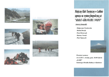 Medyczny Klub Turystyczny w Lublinie zaprasza na wystawę fotogra/iczną p.t: "ARARAT - GÓRA WIATRU I WOJNY" Autorzy fotografii: - Małgorzata Truskowska - Michał Drożdż - Paweł Krawczyk - Mariusz Nowak - Piotr Paprzycki Wernisaż wystawy: 14.12.2011 r. (środa), godz. 18.00 Galeria „KADR” Gminnego Ośrodka Kultury w Kamionce Garść informacji: Góra Ararat- masyw wulkaniczny, leżący w samym sercu Wyżyny Armeńskiej między jeziorami Wan i Sewan. na terytorium Turcji. 32 km od granicy z Armenia i 16 km od granicy z Iranem. Masyw górski zajmuje powierzchnię ok. 1000 km2 i składa się z dwóch szczytów: Wielkiego - 5137 m n.p.m. i Małego Araratu 3896 m n.p.m. W Biblii góry Ararat (które utożsamia się z górami Urartu*31) wskazane są jako miejsce spoczynku Arki Noego po potopie. Nazwa Nazwa góry pochodzi od Ary - bożka z epoki brązu. Ara był bogiem śmierci oraz odrodzenia. Góra została nazwana na jego cześć ze względu na zmiany zachodzące na stokach pomiędzy "martwą" zimą a "żywą" wiosną Historia Obecnie, po rzezi Ormian w roku 1915. tereny wokół Araratu zamieszkane są przez napływową ludność turecka i kurdyjska, a sama góra stanowi strefę zmilitaryzowaną. Wejście na Ararat wymaga uzyskania odpowiedniego zezwolenia i możliwe jest tylko w zorganizowanej grupie. Pierwszego wejścia na szczyt dokonali Friedrich Parrot i Chaczatur Abowian w 1829 r. Pierwszym Polakiem (i jednym z pierwszych Europejczyków), który wszedł na szczyt Araratu (18 sierpnia 1850 r.) był Józef Chodźko - polski topograf i geodeta w służbie rosyjskiej. Ararat w sztuce ormiańskiej: Góra Ararat, w języku urzędowym nazywana Masis (Արարատ Արարատ), Արարատ jest symbolem Armenii. wyeksponowanym pośrodku jej godła i częstym motywem w sztuce. Góra, położona na historycznie ormiańskich terenach, chociaż obecnie poza terytorium kraju, jest głęboko zakorzeniona w świadomości Ormian. Jest obecna w ich literaturze i sztuce. Ararat jest też widoczny aż ze stolicy Armenii - Erywania. Ararat wznosi się samotnie na równinie rzeki Araks, kontrastując z monotonnym, surowym otoczeniem. Sławę zawdzięcza jednak nie naturalnemu pięknu symetrycznych, zdradliwie gładkich zboczy i lśniącego białego wierzchołka, lecz Biblii. Góra ta miała być bowiem pierwszym skrawkiem ziemi, który wyłonił się z opadających wód potopu i na którego szczycie osiadła arka Noego. Lśniący szczyt góry Ararat, pokryty nigdy nie topniejącą czaszą błyszczącego w słońcu śniegu, wznosi się w stronę niebios na podobieństwo wspaniałego srebrno - dziobego ptaka. Dawniej (1921) góra Ararat była częścią Armenii, jednak obecnie znajduje się na terenie państwa tureckiego. W rzeczywistości Ararat ma dwa wierzchołki, odległe od siebie o 11 kilometrów i połączone nieregularnym, pełnym wyłomów przełęczowym siodłem. Są to: Wielki Ararat (Masis), najwyższa góra w Turcji o wysokości