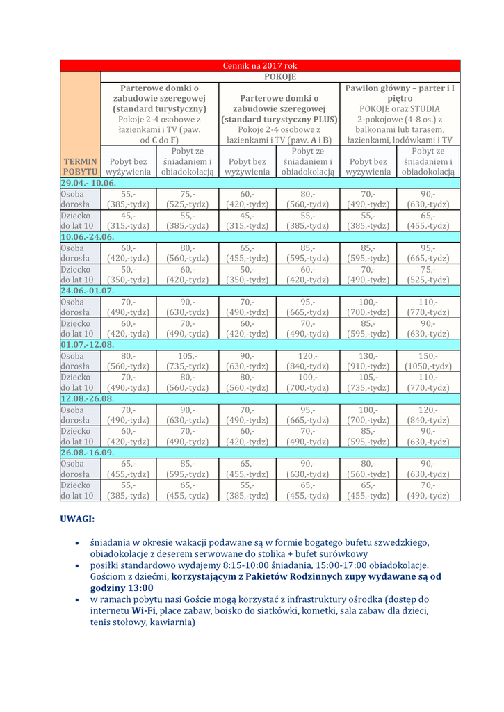 Cennik na 2017 rok POKOJE Parterowe domki o Pawilon główny – parter i I zabudowie szeregowej Parterowe domki o piętro (standard turystyczny) zabudowie szeregowej POKOJE oraz STUDIA Pokoje 2-4 osobowe z (standard turystyczny PLUS) 2-pokojowe (4-8 os.) z łazienkami i TV (paw. Pokoje 2-4 osobowe z balkonami lub tarasem, od C do F) łazienkami i TV (paw. A i B) łazienkami, lodówkami i TV Pobyt ze Pobyt ze Pobyt ze TERMIN Pobyt bez śniadaniem i Pobyt bez śniadaniem i Pobyt bez śniadaniem i POBYTU wyżywienia obiadokolacją wyżywienia obiadokolacją wyżywienia obiadokolacją 29.04.- 10.06. Osoba 55,75,60,80,70,90,dorosła (385,-tydz) (525,-tydz) (420,-tydz) (560,-tydz) (490,-tydz) (630,-tydz) Dziecko 45,55,45,55,55,65,do lat 10 (315,-tydz) (385,-tydz) (315,-tydz) (385,-tydz) (385,-tydz) (455,-tydz) 10.06.-24.06. Osoba 60,80,65,85,85,95,dorosła (420,-tydz) (560,-tydz) (455,-tydz) (595,-tydz) (595,-tydz) (665,-tydz) Dziecko 50,60,50,60,70,75,do lat 10 (350,-tydz) (420,-tydz) (350,-tydz) (420,-tydz) (490,-tydz) (525,-tydz) 24.06.-01.07. Osoba 70,90,70,95,100,110,dorosła (490,-tydz) (630,-tydz) (490,-tydz) (665,-tydz) (700,-tydz) (770,-tydz) Dziecko 60,70,60,70,85,90,do lat 10 (420,-tydz) (490,-tydz) (420,-tydz) (490,-tydz) (595,-tydz) (630,-tydz) 01.07.-12.08. Osoba 80,105,90,120,130,150,dorosła (560,-tydz) (735,-tydz) (630,-tydz) (840,-tydz) (910,-tydz) (1050,-tydz) Dziecko 70,80,80,100,105,110,do lat 10 (490,-tydz) (560,-tydz) (560,-tydz) (700,-tydz) (735,-tydz) (770,-tydz) 12.08.-26.08. Osoba 70,90,70,95,100,120,dorosła (490,-tydz) (630,-tydz) (490,-tydz) (665,-tydz) (700,-tydz) (840,-tydz) Dziecko 60,70,60,70,85,90,do lat 10 (420,-tydz) (490,-tydz) (420,-tydz) (490,-tydz) (595,-tydz) (630,-tydz) 26.08.-16.09. Osoba 65,85,65,90,80,90,dorosła (455,-tydz) (595,-tydz) (455,-tydz) (630,-tydz) (560,-tydz) (630,-tydz) Dziecko 55,65,55,65,65,70,do lat 10 (385,-tydz) (455,-tydz) (385,-tydz) (455,-tydz) (455,-tydz) (490,-tydz) UWAGI: śniadania w okresie wakacji podawane są w formie bogatego bufetu szwedzkiego, obiadokolacje z deserem serwowane do stolika + bufet surówkowy posiłki standardowo wydajemy 8:15-10:00 śniadania, 15:00-17:00 obiadokolacje. Gościom z dziećmi, korzystającym z Pakietów Rodzinnych zupy wydawane są od godziny 13:00 w ramach pobytu nasi Goście mogą korzystać z infrastruktury ośrodka (dostęp do internetu Wi-Fi, place zabaw, boisko do siatkówki, kometki, sala zabaw dla dzieci, tenis stołowy, kawiarnia) w okresie wakacyjnym wszystkie dzieci zapraszamy na zajęcia animacyjne (6 dni w tygodniu) – Klauni Kulki, warsztaty plastyczne, gry, zabawy i konkursy z nagrodami, seanse bajkowe podane ceny zawierają 8% podatek VAT. Na życzenie wystawiamy faktury w okresie 01.07.-19.08. dopłata za pokój dla dwóch osób wynosi 40 złotych za dobę w okresie letnich ferii szkolnych (wakacji) turnusy trwają od soboty do soboty początek doby hotelowej od godz. 16.00 w dniu przyjazdu, do godz. 10.00 w dniu wyjazdu przy posiłkach w formie szwedzkiego stołu obowiązuje bezwzględny zakaz wynoszenia jedzenia na zewnątrz (istnieje możliwość dokupienia kanapek w cenie 3 zł szt.) całodzienne wyżywienie – 45 zł/osoba dorosła; 35 zł/dziecko do lat 10 dodatkowe pakiety kolacyjne – 15 zł/porcja podane ceny nie obejmują opłaty klimatycznej dzieci do lat 3 (nie ukończone 3 lata w dniu wjazdu) bez świadczeń gratis (jedno dziecko w pokoju) – przy dokonywaniu czynności meldunkowych w recepcji ośrodka wymagane jest okazanie dokumentu potwierdzającego datę urodzenia przyjmujemy małe zwierzaki (wyłącznie w domkach szeregowych) – opłata 20 zł/doba w sezonie wakacyjnym minimalna opłata za pokój z łazienką to dwukrotność stawki za osobę dorosłą parking na terenie ośrodka płatny 10 zł/doba dbając o Państwa wygodę mamy również do dyspozycji ogólnodostępny aneks kuchenny (płyta indukcyjna – należy mieć własne naczynia, mikrofalówka, lodówka), pralnię, wypożyczalnię sprzętu sportowego do dyspozycji naszych Gości również krzesełka do karmienia w jadalni, wanienki dla dzieci, nocniki, nakładki na WC sprzątanie pokoju w trakcie pobytu – 30 złotych/pokój wymiana pościeli w trakcie pobytu – 25 złotych/komplet możecie Państwo również za dodatkową opłatą wypożyczyć u nas: Lodówkę do pokoju – 60 zł/tydzień, 12 zł/doba Łóżeczko turystyczne z pościelą – 60 zł/tydzień, 20zł/doba Termowentylator – 15 zł/doba Ręcznik do łazienki – 15 zł/tydz. (kaucja 30 zł) Rower – 10 zł/do 1,5 godziny, 30 zł/dzień (mamy foteliki dziecięce) Parasol plażowy – 10 zł/tydz. (kaucja 30 zł) Leżak – 25 zł/tydz. (kaucja 60 zł) Kijki do Nordic Walking – 5 zł/godzina Żelazko i deskę do prasowania – 5 zł/godzina Wanienkę – 5 zł/dzień, 15 zł/tydzień Korzystanie z pralni – 15 zł/do jednej godziny Paletki i piłeczki do ping-ponga – 2 zł/godzina (kaucja 10 zł) Piłki, rakietki – bezpłatnie (przy wypożyczeniu kaucja) Informacje podane w cenniku nie stanowią oferty handlowej w rozumieniu przepisów kodeksu Prawa Cywilnego. W zależności od rodzaju, terminu i długości pobytu obowiązują ceny umowne. CENY I ŚWIADCZENIA DLA GRUP USTALANE SĄ INDYWIDUALNIE