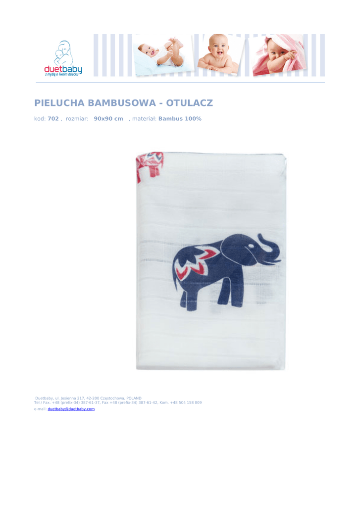 PIELUCHA BAMBUSOWA - OTULACZ kod: 702 , rozmiar: 90x90 cm , materiał: Bambus 100% Duetbaby, ul. Jesienna 217, 42-200 Częstochowa, POLAND Tel / Fax. +48 (prefix-34) 387-61-37, Fax +48 (prefix-34) 387-61-42, Kom. +48 504 158 809 e-mail: [email protected] Powered by TCPDF (www.tcpdf.org)