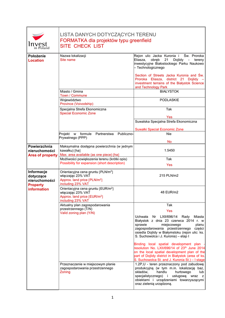 LISTA DANYCH DOTYCZĄCYCH TERENU FORMATKA dla projektów typu greenfield SITE CHECK LIST Położenie Location Rejon ulic Jacka Kuronia i Św. Proroka Eliasza, obręb 21 Dojlidy - tereny inwestycyjne Białostockiego Parku Naukowo – Technologicznego Nazwa lokalizacji Site name Section of Streets Jacka Kuronia and Św. Proroka Eliasza, district 21 Dojlidy – investment terrains of the Białystok Science and Technology Park BIAŁYSTOK Miasto / Gmina Town / Commune Województwo Province (Voivodship) PODLASKIE Tak Specjalna Strefa Ekonomiczna Special Economic Zone Yes Suwalska Specjalna Strefa Ekonomiczna Projekt w formule Prywatnego (PPP) Partnerstwa Publiczno- Suwałki Special Economic Zone Nie No Maksymalna dostępna powierzchnia (w jednym Powierzchnia nieruchomości kawałku) [ha] Area of property Max. area available (as one piece) [ha] Możliwości powiększenia terenu (krótki opis) Possibility for expansion (short description) Informacje dotyczące nieruchomości Property information 1.5450 Tak Yes [PLN/m2] Orientacyjna cena gruntu włączając 23% VAT Approx. land price [PLN/m2] including 23% VAT Orientacyjna cena gruntu [EUR/m2] włączając 23% VAT Approx. land price [EUR/m2] including 23% VAT Aktualny plan zagospodarowania przestrzennego (T/N) Valid zoning plan (Y/N) 215 PLN/m2 48 EUR/m2 Tak Yes Uchwała Nr LXII/696/14 Rady Miasta Białystok z dnia 23 czerwca 2014 r. w sprawie miejscowego planu zagospodarowania przestrzennego części osiedla Dojlidy w Białymstoku (rejon ulic: ks. S. Suchowolca i J. Kuronia) – etap I Przeznaczenie w miejscowym planie zagospodarowania przestrzennego Zoning 1 Binding local spatial development plan resolution No. LXII/696/14 of 23th June 2014 on the local spatial development plan of the part of Dojlidy district in Białystok (area of ks. S. Suchowolca St. and J. Kuronia St.) – I stage 1.2P,U - teren przeznaczony pod zabudowę produkcyjną (w tym m.in. lokalizację baz, składów, handlu hurtowego lub specjalistycznego) i usługową wraz z obiektami i urządzeniami towarzyszącymi oraz zielenią urządzoną. 1.2P,U – terrain for production (including storage, trade) and service including objects and auxiliary equipment and cultivated green areas Nr ewidencyjny działki Number of the plot Użytek Usable land Charakterystyka Różnica poziomów terenu [m] Differences in land level [m] działki Land specification 788/21 PsIII, PsIV, PsV 3m Przeszkody podziemne (T/N) Underground obstacles (Y/N) Nie Przeszkody występujące na powierzchni terenu (T/N) Ground and overhead obstacles (Y/N) Istniejące ograniczenia ekologiczne (T/N) Ecological restrictions (Y/N) No Nie No Tak Yes - maksymalna powierzchnia zabudowy – max. 65% powierzchni terenu, - minimalna powierzchnia terenu biologicznie czynnego – min. 10% powierzchni terenu, Budynki i zabudowania na terenie (T/N) Buildings / other constructions on site (Y/N) Połączenia transportowe Transport links - max. built-up area - 65% of the terrain - min. biologically active area – 10% of the terrain Nie No - ul. Jacka Kuronia - droga asfaltowa, liczba Droga dojazdowa do terenu (rodzaj drogi pasów ruchu 2×1, (szer. w liniach i jej szerokość) Access road to the plot (type and width of rozgraniczających 25m). - ul. Św. Proroka Eliasza droga o nawierzchni access road) asfaltowej, (szer. w liniach rozgraniczających 15 m). Autostrada / droga krajowa [km] Nearest motorway / national road [km] - Jacka Kuronia Street– road with asphalt surface, number of lanes 2x1, (width within road demarcation lines 25 m). - Św. Proroka Eliasza Street – road with asphalt surface, (width within road demarcation lines 15 m). Odległości do dróg krajowych: - droga krajowa nr 19 – 300 m - droga krajowa nr 65 – 2000 m - droga krajowa nr 8 – 13.5 km - droga nr 678 – 2700 m Distance to state roads: - state road no. 19 – 300 m - state road no. 65 - 2000 m - state road no. 8 – 13.5 km - road no. 678 – 2700 m Porty rzeczne i morskie w odległości do 200 km Nie Sea and river ports located up to 200 km No Kolej [km] Railway line [km] Ca. 5 km Bocznica kolejowa [km] Railway siding [km] Ca. 5 km 2 Najbliższe lotnisko międzynarodowe [km] Nearest international airport [km] Istniejąca infrastruktura Existing infrastructure Elektryczność na terenie (T/N) Electricity (Y/N) Warszawa, ok. 180 km, Grodno, ok. 120 km Warszawa, approx. 180 km, Grodno, approx. 120 km Tak Yes Odległość przyłącza od granicy terenu sieć elektroenergetyczna średniego Connection point (distance from napięcia (eS) – 1 m - sieć elektroenergetyczna niskiego napięcia boundary) [m] (eN) – 11 m - sieć energetyczna wysokiego napięcia (eW) – 304 m Gaz na terenie (T/N) Gas (Y/N) medium voltage power grid (eS) – 1 m low voltage power grid (eN) – 11 m high voltage power grid (eW) - 304 m Nie No Odległość przyłącza od granicy działki Connection point (distance from boundary) [m] Woda na terenie (T/N) Water supply (Y/N) Odległość przyłącza od granicy terenu Connection point (distance from boundary) [m] Kanalizacja na terenie (T/N) Sewage discharge (Y/N) 20 m (Ø 110) Nie No 6 m (Ø 160) Nie No Odległość przyłącza od granicy terenu kanalizacja sanitarna Connection point (distance from sanitary sewerage – 7.5 m (Ø 300) boundary) [m] kanalizacja deszczowa rainwater supply – 14 m (Ø 300) Sieć telekomunikacyjna 3m Telecommunications network Zachęty Inwestycyjne Investment incentives 1. ULGI I PREFERENCJE MAJĄCE ZASTOSOWANIE W SPECJANYCH STREFACH EKONOMICZNYCH Rozporządzenie Rady Ministrów z dnia 10 grudnia 2008 r. przedsiębiorcom działającym na podstawie zezwolenia na prowadzenie działalności gospodarczej na terenach specjalnych stref ekonomicznych udzielana jest pomoc publiczna (Dz.U. z 2015 r poz. 456 j.t.) stanowi, iż pomoc publiczna udzielana jest w formie zwolnień podatkowych na podstawie ustawy z dnia 15 lutego 1992 r. o podatku dochodowym od osób prawnych albo na podstawie ustawy z dnia 26 l
