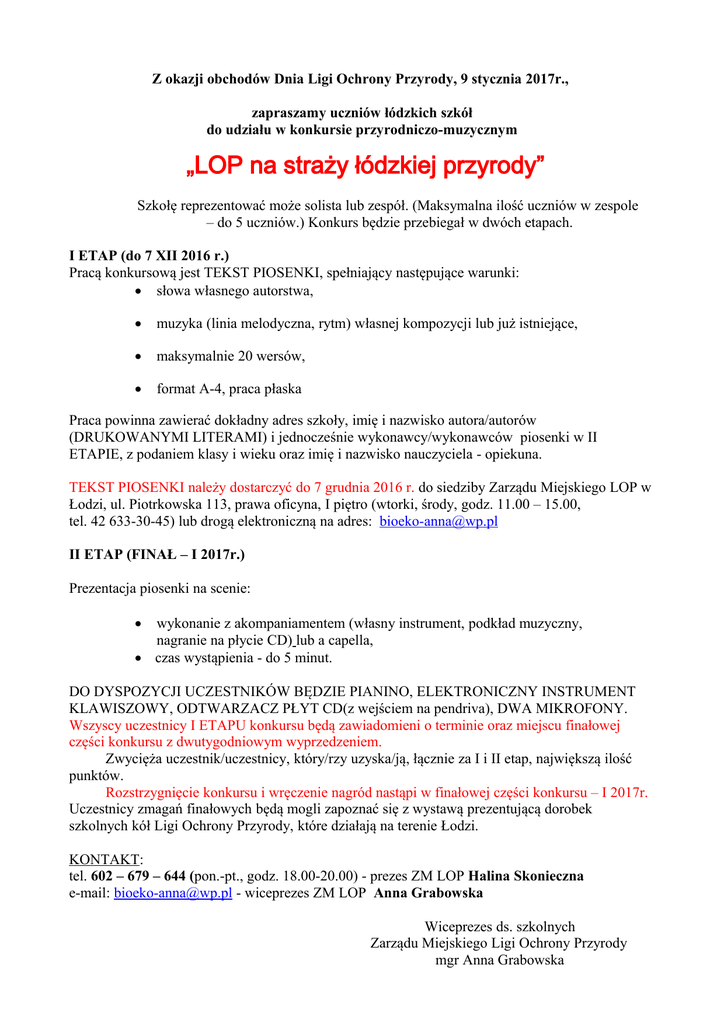Z okazji obchodów Dnia Ligi Ochrony Przyrody, 9 stycznia 2017r., zapraszamy uczniów łódzkich szkół do udziału w konkursie przyrodniczo-muzycznym „LOP na straży łódzkiej przyrody” Szkołę reprezentować może solista lub zespół. (Maksymalna ilość uczniów w zespole – do 5 uczniów.) Konkurs będzie przebiegał w dwóch etapach. I ETAP (do 7 XII 2016 r.) Pracą konkursową jest TEKST PIOSENKI, spełniający następujące warunki: słowa własnego autorstwa, muzyka (linia melodyczna, rytm) własnej kompozycji lub już istniejące, maksymalnie 20 wersów, format A-4, praca płaska Praca powinna zawierać dokładny adres szkoły, imię i nazwisko autora/autorów (DRUKOWANYMI LITERAMI) i jednocześnie wykonawcy/wykonawców piosenki w II ETAPIE, z podaniem klasy i wieku oraz imię i nazwisko nauczyciela - opiekuna. TEKST PIOSENKI należy dostarczyć do 7 grudnia 2016 r. do siedziby Zarządu Miejskiego LOP w Łodzi, ul. Piotrkowska 113, prawa oficyna, I piętro (wtorki, środy, godz. 11.00 – 15.00, tel. 42 633-30-45) lub drogą elektroniczną na adres: [email protected] II ETAP (FINAŁ – I 2017r.) Prezentacja piosenki na scenie: wykonanie z akompaniamentem (własny instrument, podkład muzyczny, nagranie na płycie CD) lub a capella, czas wystąpienia - do 5 minut. DO DYSPOZYCJI UCZESTNIKÓW BĘDZIE PIANINO, ELEKTRONICZNY INSTRUMENT KLAWISZOWY, ODTWARZACZ PŁYT CD(z wejściem na pendriva), DWA MIKROFONY. Wszyscy uczestnicy I ETAPU konkursu będą zawiadomieni o terminie oraz miejscu finałowej części konkursu z dwutygodniowym wyprzedzeniem. Zwycięża uczestnik/uczestnicy, który/rzy uzyska/ją, łącznie za I i II etap, największą ilość punktów. Rozstrzygnięcie konkursu i wręczenie nagród nastąpi w finałowej części konkursu – I 2017r. Uczestnicy zmagań finałowych będą mogli zapoznać się z wystawą prezentującą dorobek szkolnych kół Ligi Ochrony Przyrody, które działają na terenie Łodzi. KONTAKT: tel. 602 – 679 – 644 (pon.-pt., godz. 18.00-20.00) - prezes ZM LOP Halina Skonieczna e-mail: [email protected] - wiceprezes ZM LOP Anna Grabowska Wiceprezes ds. szkolnych Zarządu Miejskiego Ligi Ochrony Przyrody mgr Anna Grabowska