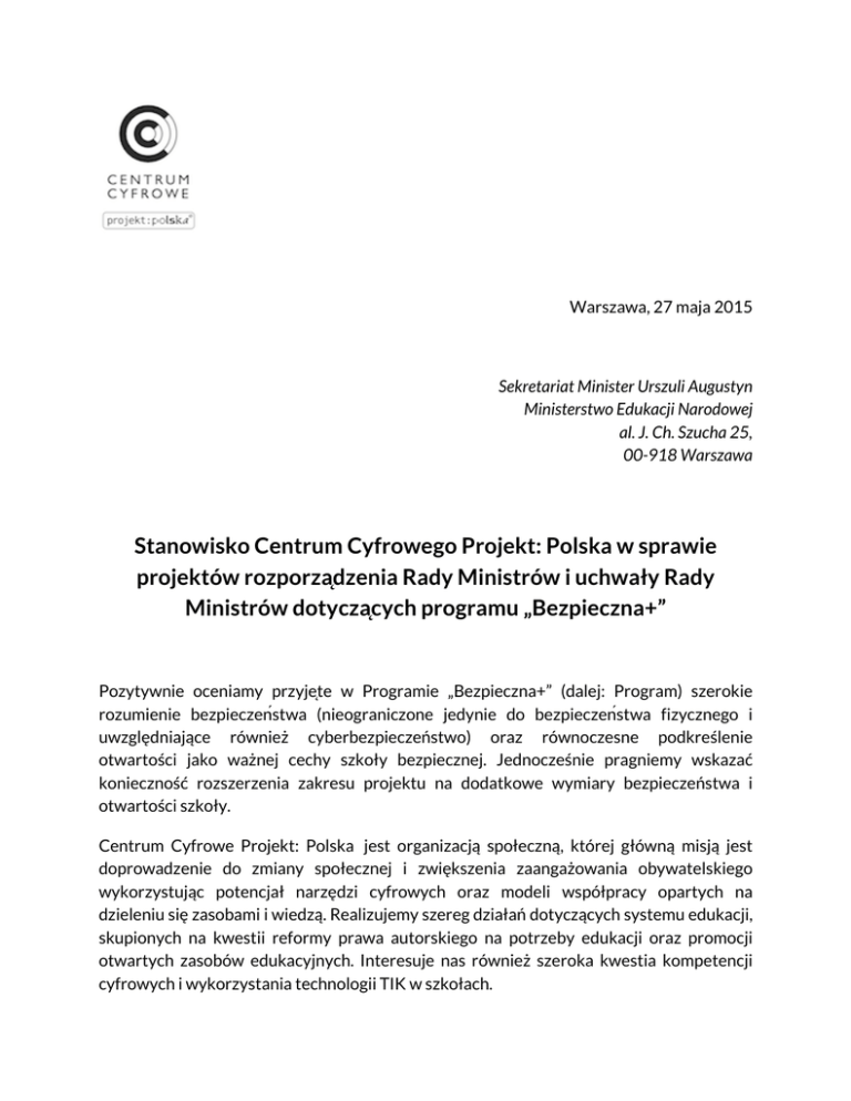 Warszawa, 27 maja 2015 Sekretariat Minister Urszuli Augustyn Ministerstwo Edukacji Narodowej al. J. Ch. Szucha 25, 00-918 Warszawa Stanowisko Centrum Cyfrowego Projekt: Polska w sprawie projektów rozporządzenia Rady Ministrów i uchwały Rady Ministrów dotyczących programu „Bezpieczna+” Pozytywnie oceniamy przyjęte w Programie „Bezpieczna+” (dalej: Program) szerokie rozumienie bezpieczeństwa (nieograniczone jedynie do bezpieczeństwa fizycznego i uwzględniające również cyberbezpieczeństwo) oraz równoczesne podkreślenie otwartości jako ważnej cechy szkoły bezpiecznej. Jednocześnie pragniemy wskazać konieczność rozszerzenia zakresu projektu na dodatkowe wymiary bezpieczeństwa i otwartości szkoły. Centrum Cyfrowe Projekt: Polska jest organizacją społeczną, której główną misją jest doprowadzenie do zmiany społecznej i zwiększenia zaangażowania obywatelskiego wykorzystując potencjał narzędzi cyfrowych oraz modeli współpracy opartych na dzieleniu się zasobami i wiedzą. Realizujemy szereg działań dotyczących systemu edukacji, skupionych na kwestii reformy prawa autorskiego na potrzeby edukacji oraz promocji otwartych zasobów edukacyjnych. Interesuje nas również szeroka kwestia kompetencji cyfrowych i wykorzystania technologii TIK w szkołach. Bezpieczeństwo to także kwestia działania prawa autorskiego w szkole Program „Bezpieczna+” słusznie podkreśla cyberbezpieczeństwo jako aspekt ogólnie rozumianego bezpieczeństwa szkoły. Naszym zdaniem brakuje jednak kwestii związanych z regulacją prawnoautorską i wykorzystaniem treści w szkole. Podstawowym wymiarem bezpieczeństwa w tym zakresie powinna być świadomość beneficjentów końcowych dotyczących przysługujących im praw i obowiązków, swobód korzystania z treści, oraz możliwych zagrożeń i ryzyk naruszenia prawa. Przeprowadzone przez Centrum Cyfrowe, w ramach projektu „Prawa autorskie w czasach zmiany” badanie świadomości prawnoautorskiej pokazują jej bardzo niski poziom. Zarówno wśród wszystkich dorosłych Polaków jak i nauczycieli (badanych osobno), około dwóch trzecich osób nie wie o istnieniu wyjątku edukacyjnego od ochrony prawnoautorskiej. Badania fokusowe ukazały lęk nauczycieli przed jednoczesnym naruszeniem praw oraz utraty respektu wśród swoich uczniów.1 Podobne wnioski płynęły z warsztatów prowadzonych w ramach projektu „Reforma prawa autorskiego dla edukacji”.2 Rozwiązaniem tego problemu powinna być intensywna akcja edukacyjna, skierowana przede wszystkim do nauczycieli, dotycząca działania prawa autorskiego w edukacji, w tym dozwolonego użytku. Jej uzupełnieniem powinien być dedykowany portal informacyjny – na wzór australijskiego serwisu SmartCopying (http://www.smartcopying.edu.au/). Powinna ona stanowić uzupełnienie realizowanych już w Polsce innych form działań edukacyjnych na rzecz cyberbezpieczeństwa. Wnioskujemy o uzupełnienie i doprecyzowanie w tym zakresie opisu Celu szczegółowego nr 1. Otwartość zasobów edukacyjnych jako kluczowy aspekt otwartej szkoły Zgadzamy się z zaproponowanym szerokim ujęciem kwestii otwartości szkoły. Pragniemy podkreślić, że ważnym wymiarem szkoły uspołecznionej jest otwartość wykorzystywanych zasobów edukacyjnych. Zasada otwartości, wdrażana obecnie w programie „E-podręczniki do kształcenia ogólnego”, zmierza do wypracowania form współpracy i uspołecznienia na poziomie treści edukacyjnych. Z założenia, treści otwarte, 1 http://centrumcyfrowe.pl/strony/prawoautorskie/ 2 http://centrumcyfrowe.pl/projekty/reforma-‐prawa-‐autorskiego-‐dla-‐edukacji/ to takie, które mogą być swobodnie wykorzystywane, zmieniane, ulepszane i wzajemnie udostępniane przez nauczycieli, rodziców i nawet uczniów. W modelu otwartych zasobów edukacyjnych mogą więc być realizowane cenne działania na rzecz otwartości szkoły. Pozwalają one też myśleć o współpracy i otwartości na poziomie nie tylko pojedynczej szkoły, lecz kilku szkół lub nawet całego systemu oświaty – gdy działania są prowadzone online. Promocja otwartych modeli współtworzenia i dzielenia się zasobami wiąże się też z realizacją celu szczegółowego nr 1, poprzez promowanie pozytywnych wzorców zachowań z wykorzystaniem technologii cyfrowych. Wnioskujemy o uzupełnienie i doprecyzowanie w tym zakresie opisu Celu szczegółowego nr 2. Wymóg otwartości zasobów finansowanych w ramach programu „Bezpieczna+” Rekomendujemy aby powstałe w ramach Programu materiały edukacyjne udostępnione były do ponownego wykorzystania bez ograniczeń prawnych czy technicznych. W tym celu należy wprowadzić do rozporządzenia wymóg publikowania materiałów, których stworzenie zostało sfinansowane w ramach programu, na wolnych licencjach. Zasady takie zostały uprzednio wdrożone w ramach programu „E-podręczniki do kształcenia ogólnego”, są również stosowane w konkursach grantowych przez MIR, MKiDN, MAC oraz MSZ. Dodatkowo, w zakresie tworzenia materiałów edukacyjnych warto rozważyć wprowadzenie konkursu w takiej formule, która umożliwi organizacjom społecznym dostarczenie różnorodnych, wysokiej jakości materiałów lub dostosowanie już istniejących materiałów do celów Programu. Rozwój monitoringu wizyjnego w szkołach w ramach programu Bezpieczna+ Krytycznie oceniamy obecną propozycję finansowania rozwoju szkolnych systemów monitoringu w ramach programu. Uważamy, że rozwój monitoringu jest sprzeczny z przedstawioną w założeniach programu wizją szkoły otwartej i uspołecznionej. Monitoring nie jest przy tym odpowiednio regulowany. Popieramy w tym zakresie szczegółowe uwagi i postulaty przedstawione przez Fundację Panoptykon oraz Fundację – Centrum Edukacji Obywatelskiej. Działania badawcze i ewaluacyjne Program „Bezpieczna+” dotyczy obszarów, w których obserujemy dynamiczną zmianę na styku nowych technologii, zmieniają