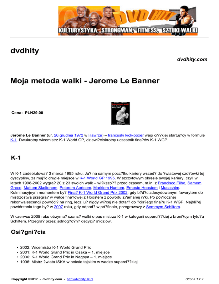 dvdhity dvdhity.com Moja metoda walki - Jerome Le Banner Cena: PLN29.00 Jérôme Le Banner (ur. 26 grudnia 1972 w Hawrze) – francuski kick-boxer wagi ci??kiej startuj?cy w formule K-1. Dwukrotny wicemistrz K-1 World GP, dziewi?ciokrotny uczestnik fina?ów K-1 WGP. K-1 W K-1 zadebiutowa? 3 marca 1995 roku. Ju? na samym pocz?tku kariery wszed? do ?wiatowej czo?ówki tej dyscypliny, zajmuj?c drugie miejsce w K-1 World GP 1995. W szczytowym okresie swojej kariery, czyli w latach 1998-2002 wygra? 20 z 23 swoich walk – wi?kszo?? przed czasem, m.in. z Francisco Filho, Samem Greco, Mattem Skeltonem, Peterem Aertsem, Markiem Huntem, Ernesto Hoostem i Musashim. Kulminacyjnym momentem by? Fina? K-1 World Grand Prix 2002, gdy b?d?c zdecydowanym faworytem do mistrzostwa przegra? w walce fina?owej z Hoostem z powodu z?amanej r?ki. Po pó?rocznej rekonwalescencji powróci? na ring, lecz ju? nigdy wi?cej nie dotar? do ?cis?ego fina?u K-1 WGP. Najbli?ej powtórzenia tego by? w 2007 roku, gdy odpad? w pó?finale, przegrawszy z Semmym Schiltem. W czerwcu 2008 roku otrzyma? szans? walki o pas mistrza K-1 w kategorii superci??kiej z broni?cym tytu?u Schiltem. Przegra? przez jednog?o?n? decyzj? s?dziów. Osi?gni?cia • • • • 2002: Wicemistrz K-1 World Grand Prix 2001: K-1 World Grand Prix in Osaka – 1. miejsce 2000: K-1 World Grand Prix in Nagoya – 1. miejsce 1996: Mistrz ?wiata ISKA w boksie tajskim w wadze superci??kiej Copyright ©2017 - dvdhity.com - http://dvdhity.llk.pl Strona 1 z 2 • 1995: Wicemistrz K-1 World Grand Prix • Mistrz ?wiata WKN w boksie tajskim w wadze superci??kiej • Mistrz Francji i Europy w kick-boxing Kariera aktorska Jérôme Le Banner ma na swoim koncie kilka ról filmowych. Na wielkim ekranie zadebiutowa? w 2007 roku we francuskiej produkcji pod tytu?em Scorpion. Rok pó?niej wyst?pi? w filmie Asterix na olimpiadzie (2008) w jednej z drugoplanowych ról jako Twardzieusz (oryg. fr. Cornedurus), w miejsce pierwotnie przewidzianego do obsady Jean-Claude'a Van Damme'a. W tym samym roku zagra? w ameryka?sko-francuskiej produkcji Babylon A.D. Informacja o dostawcy Copyright ©2017 - dvdhity.com - http://dvdhity.llk.pl Strona 2 z 2